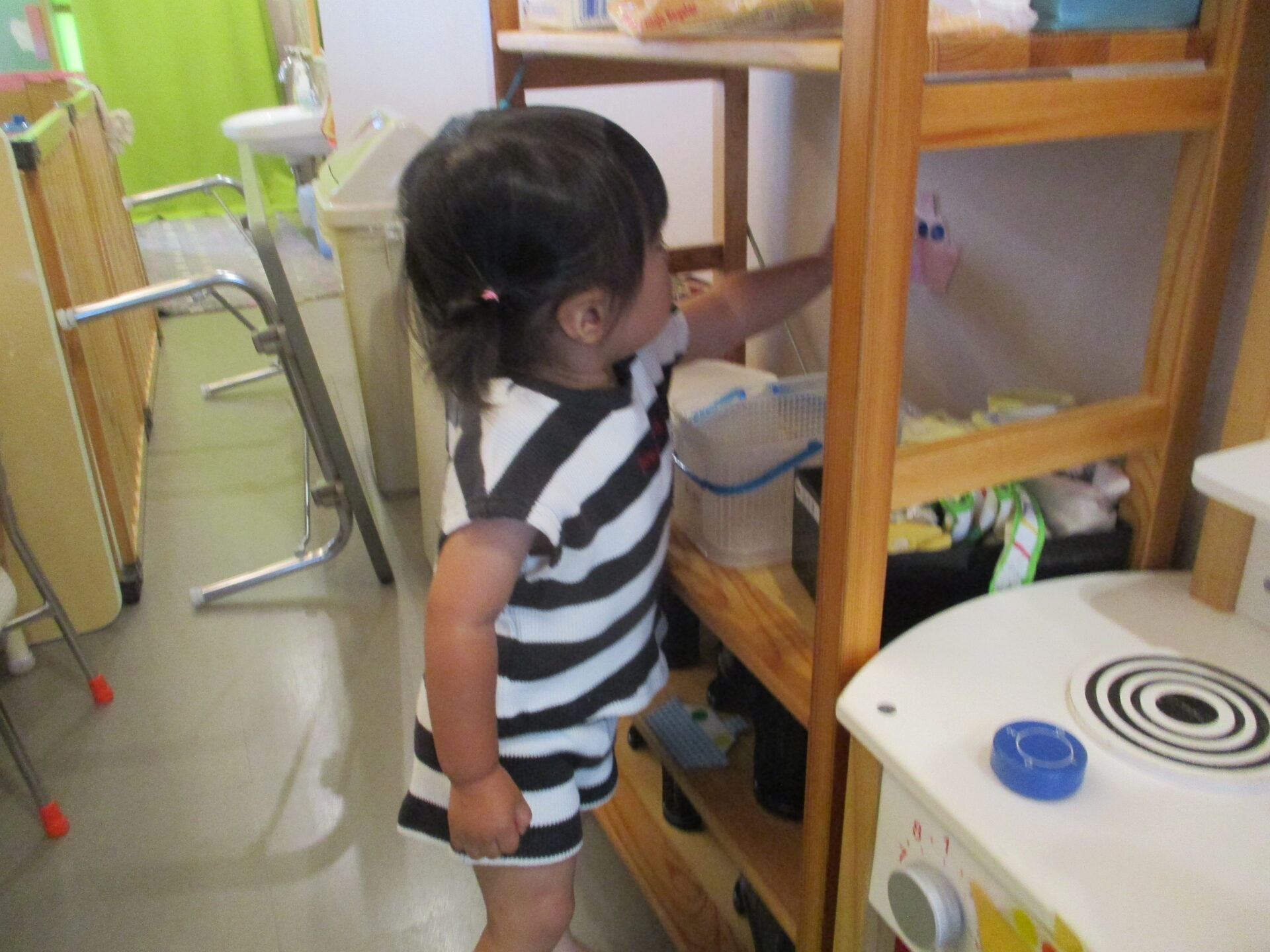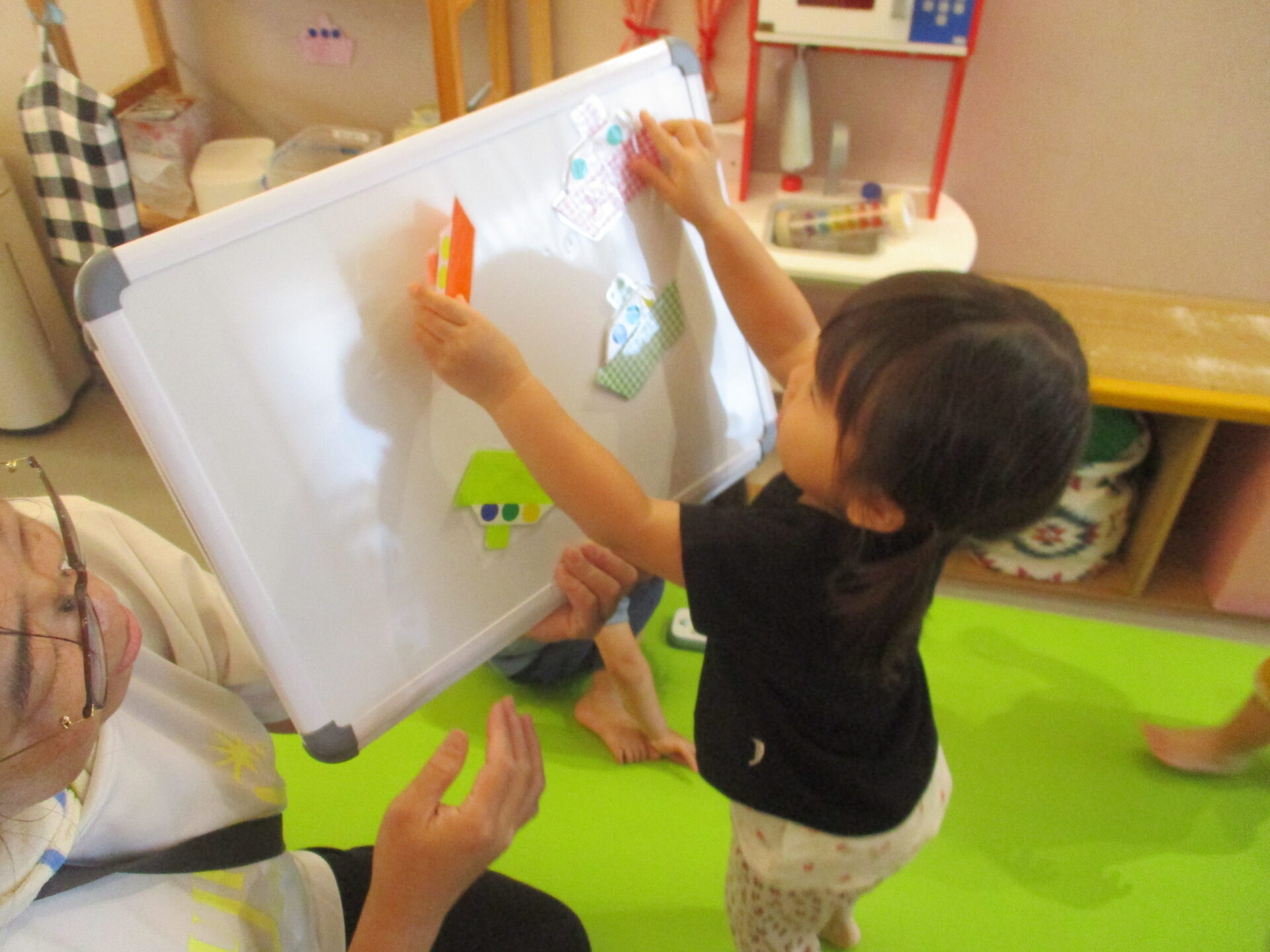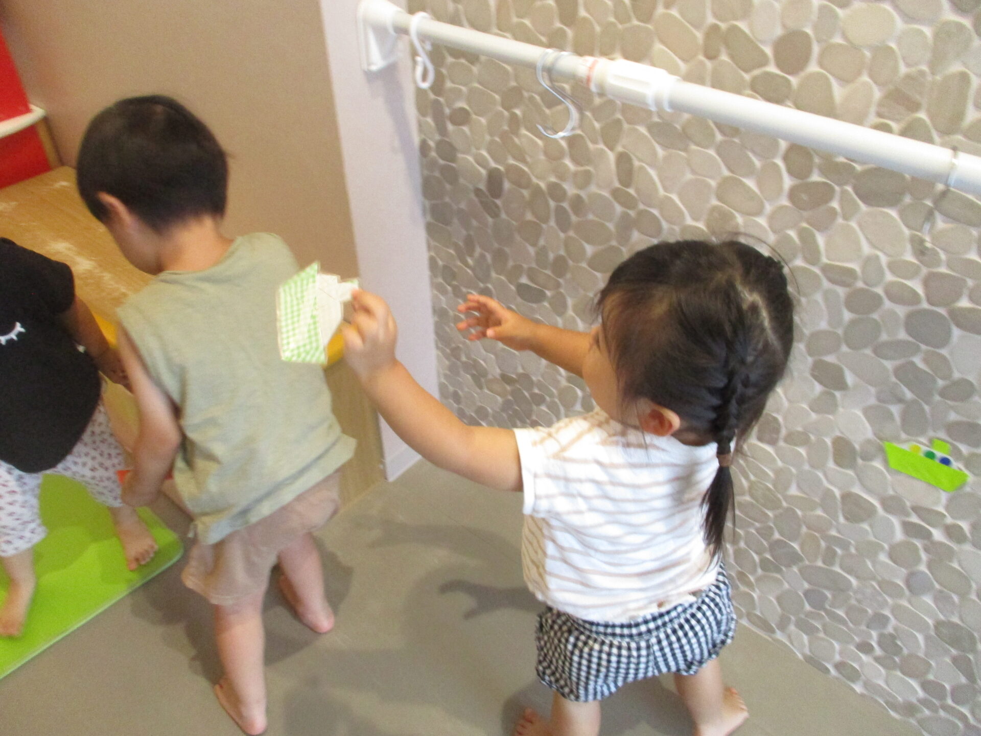 2歳児は3つ、1歳児は1つずつ探し、見つかるとうれしそうに持ってきてくれ、貼ることができました。