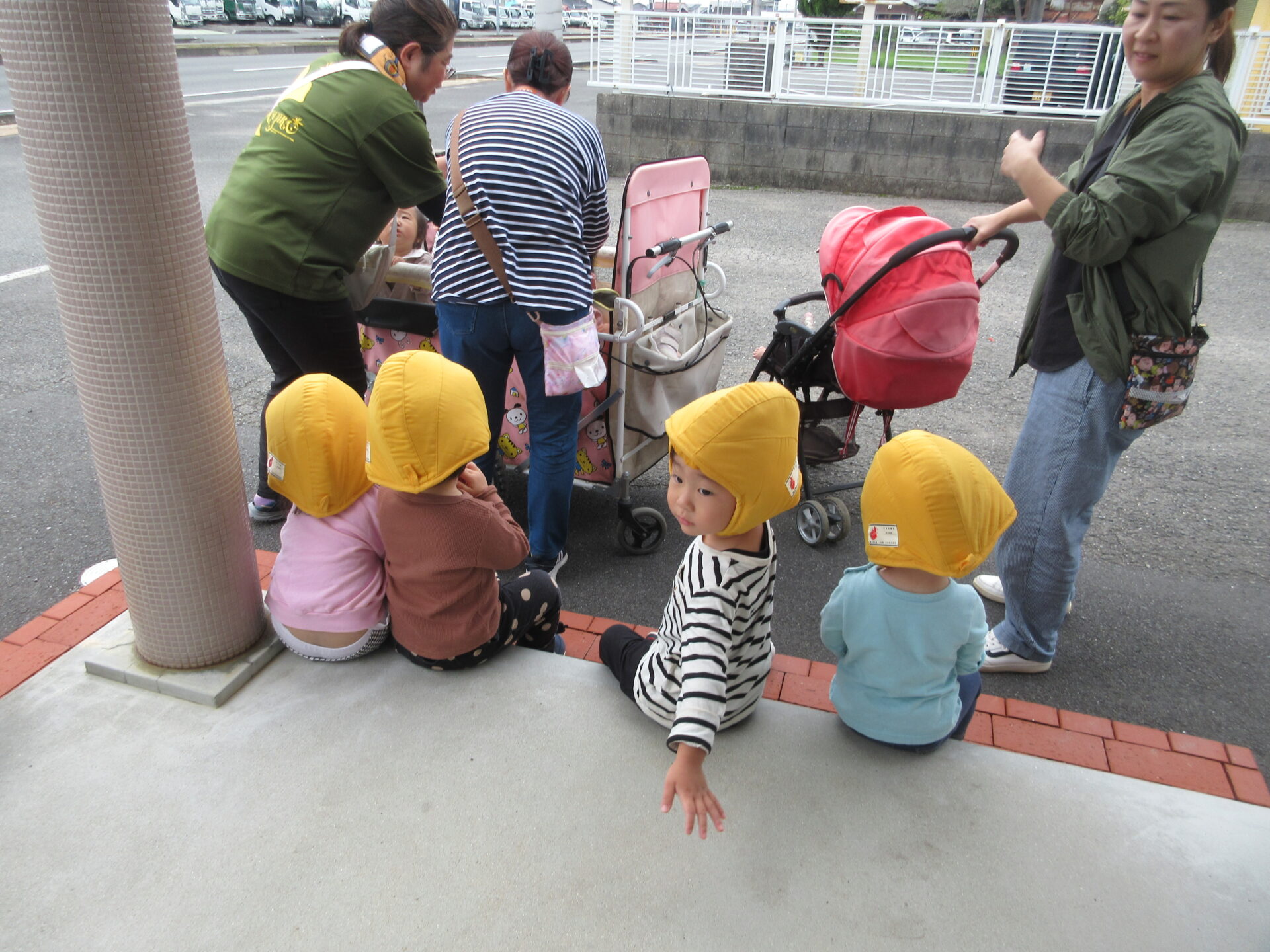 防災頭巾を被る練習をする時は、嫌がって被らない子もいましたが、本番の訓練の時は、みんな嫌がらずに被ることができました。