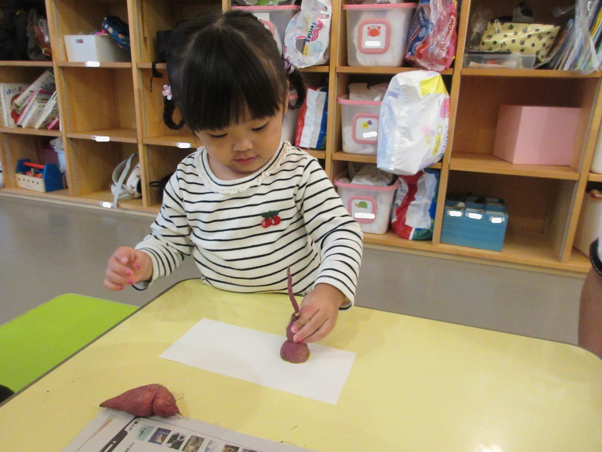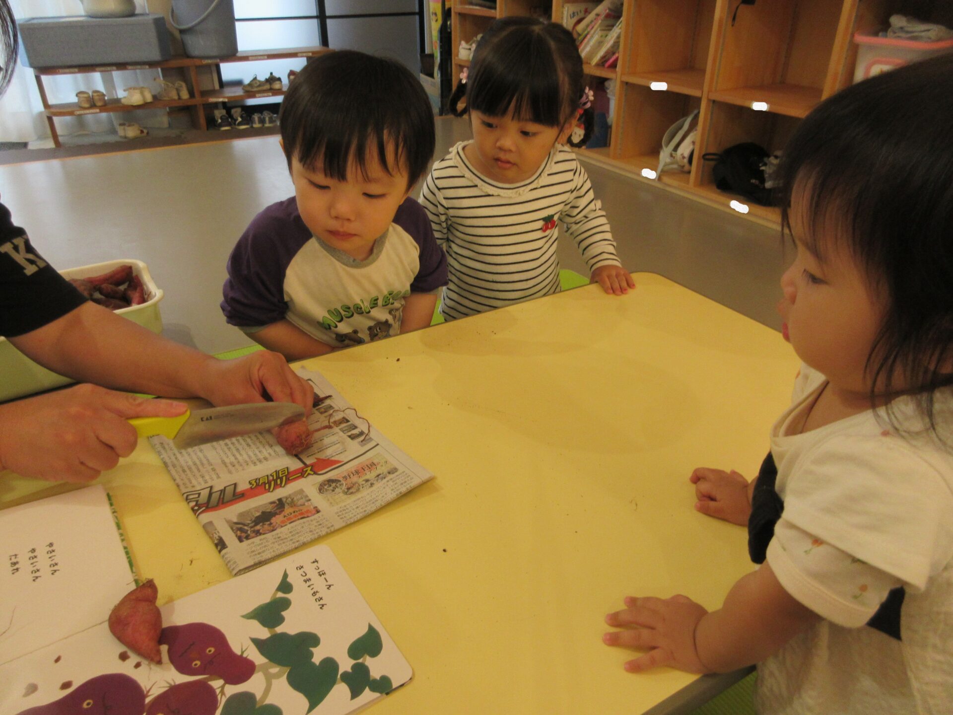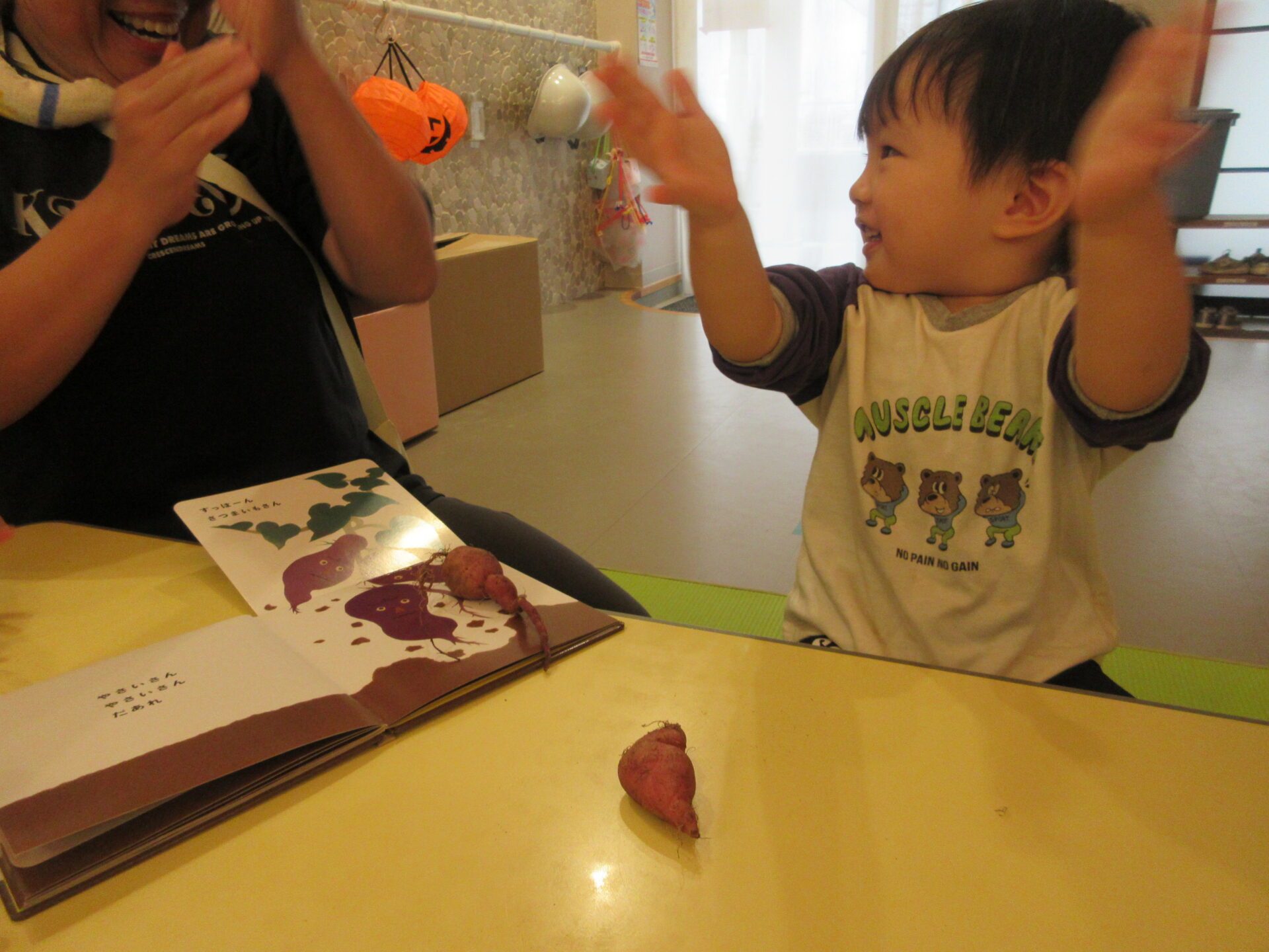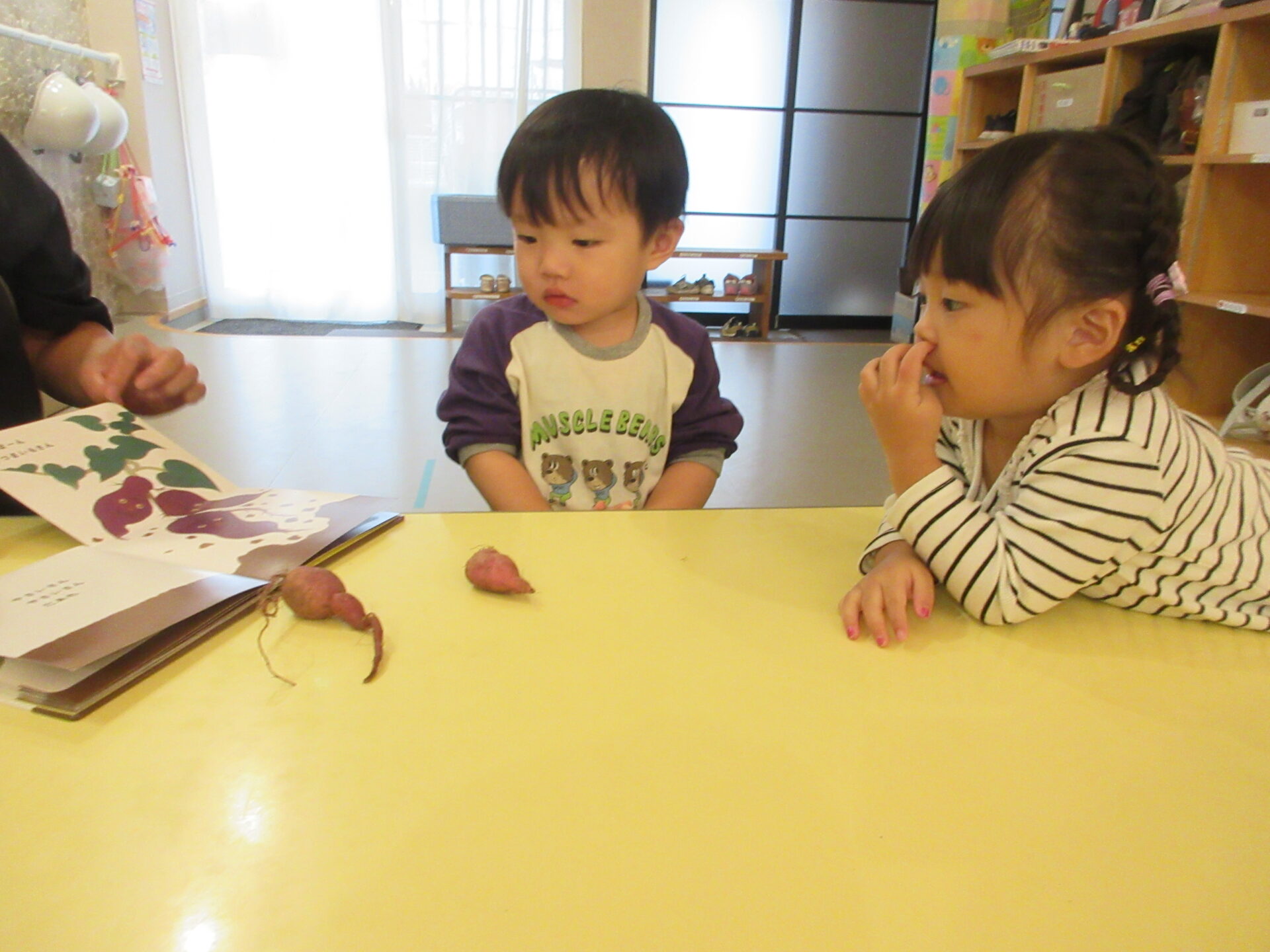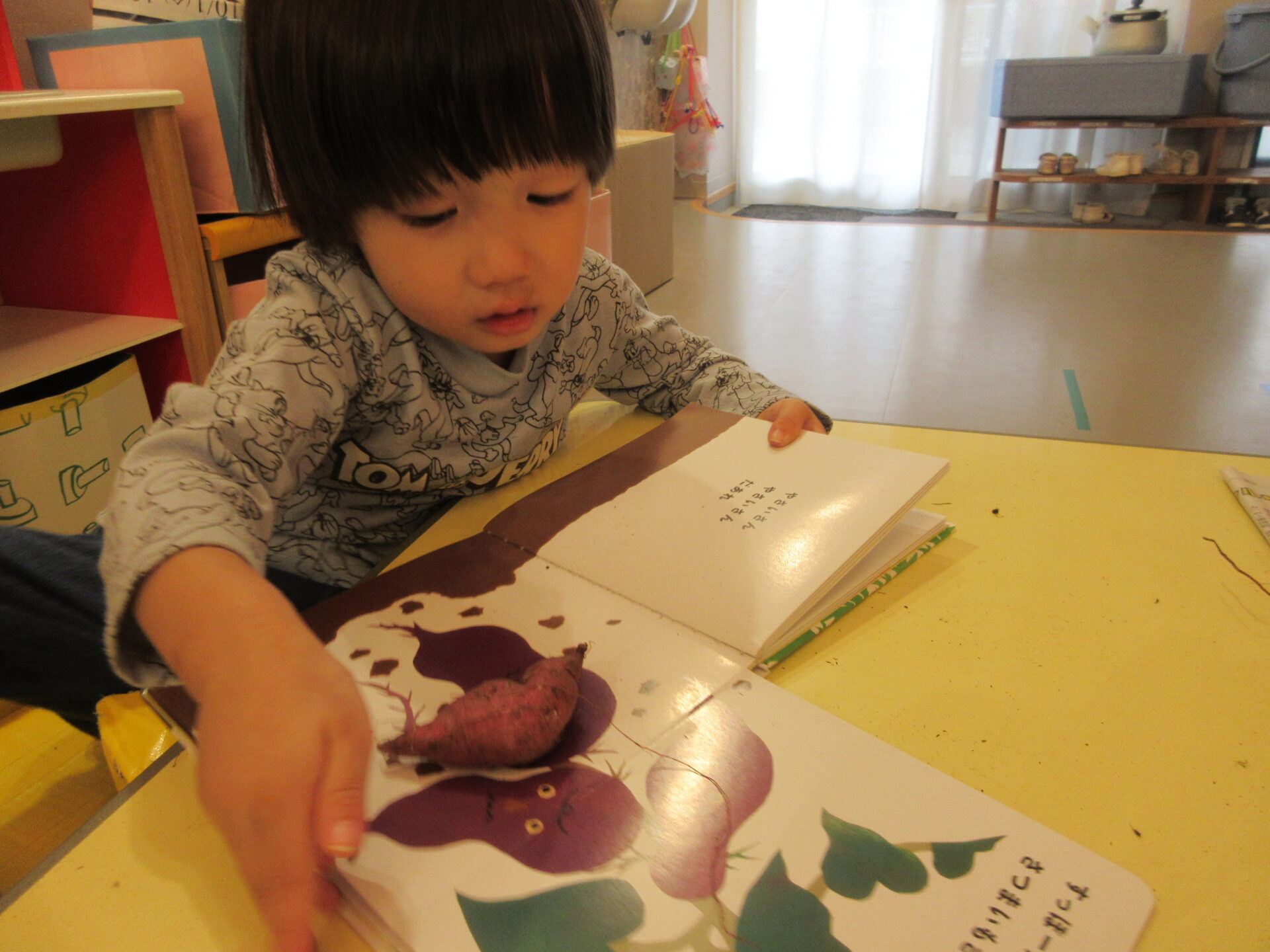 「やさいさん」の絵本を見て、さつまいもの所が出てくると、「同じ」と言ったり、「すっぽん」と抜く真似をしたりして楽しんでいました。