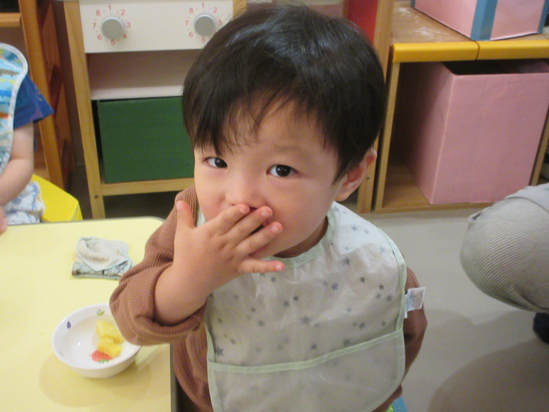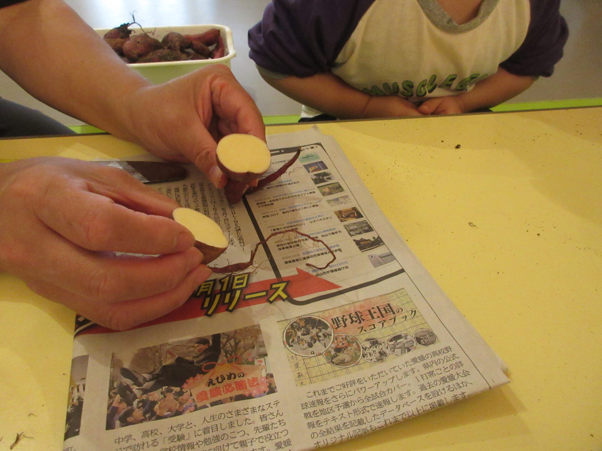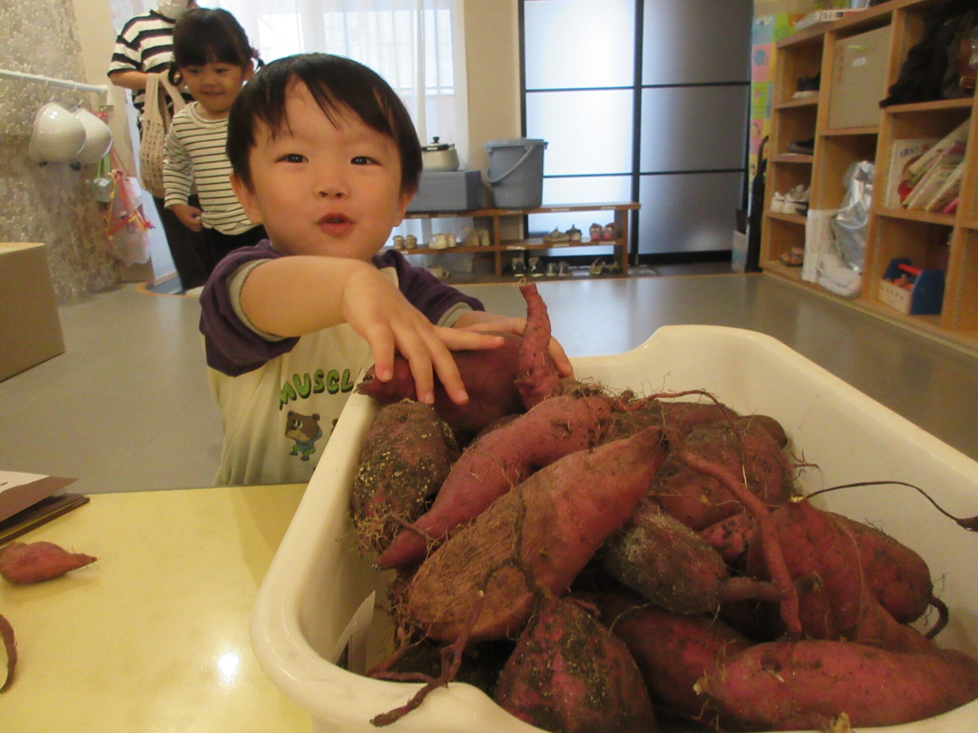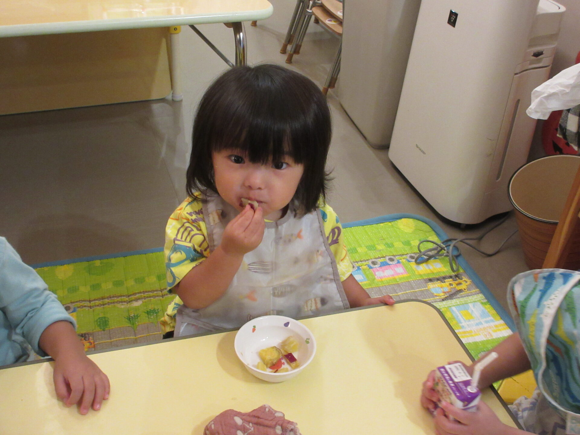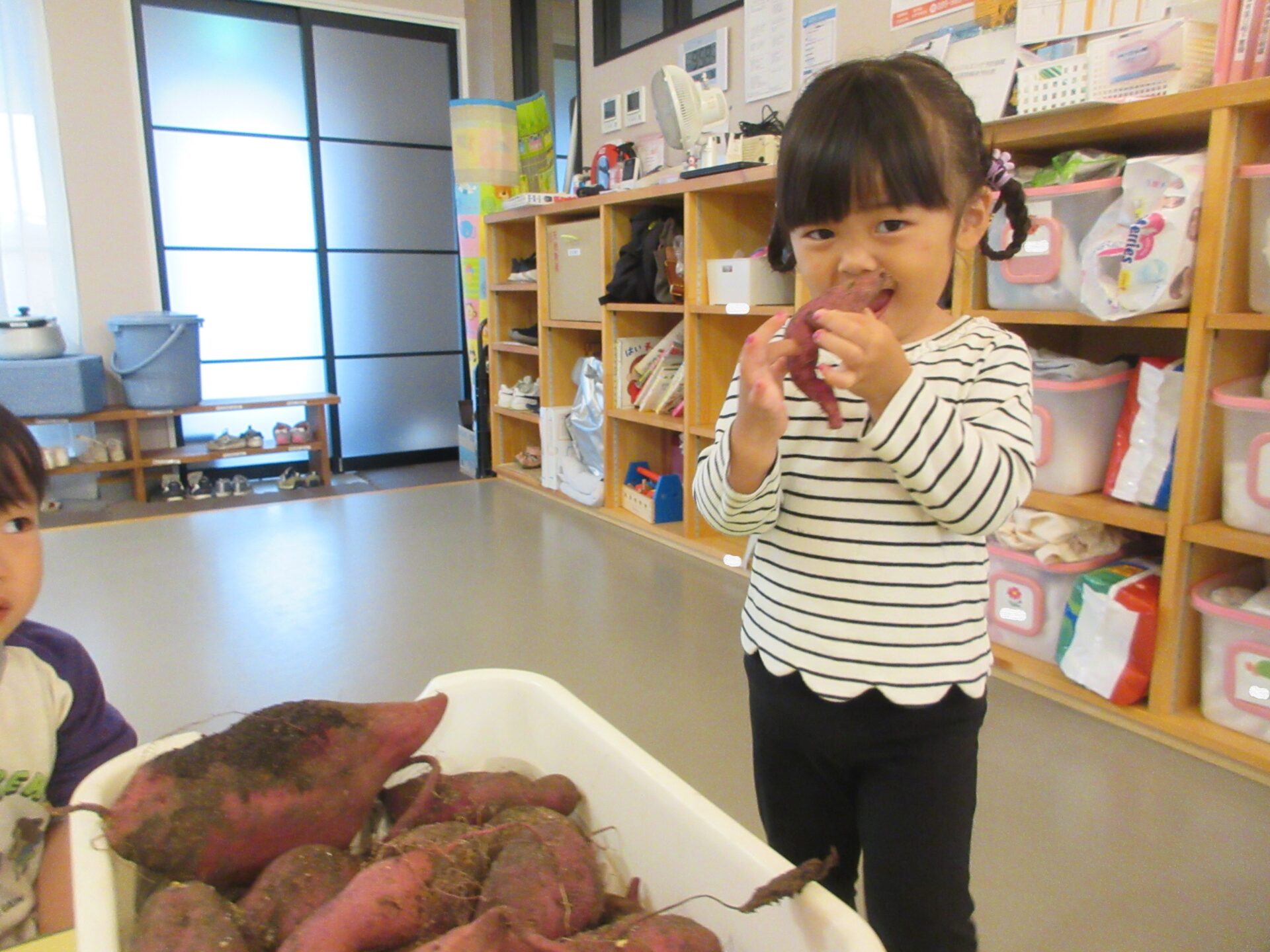 そして、おやつの時間には、給食のりぼんさんがふかしてくれた、さつまいもを食べました。
