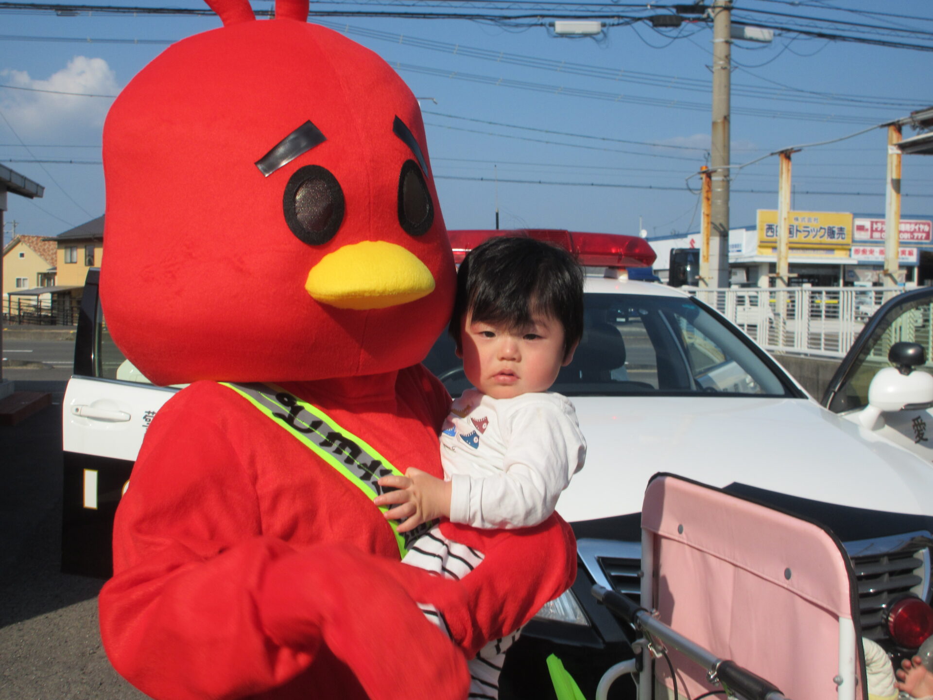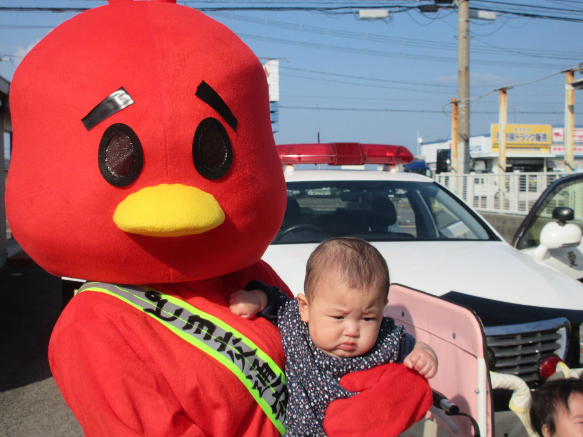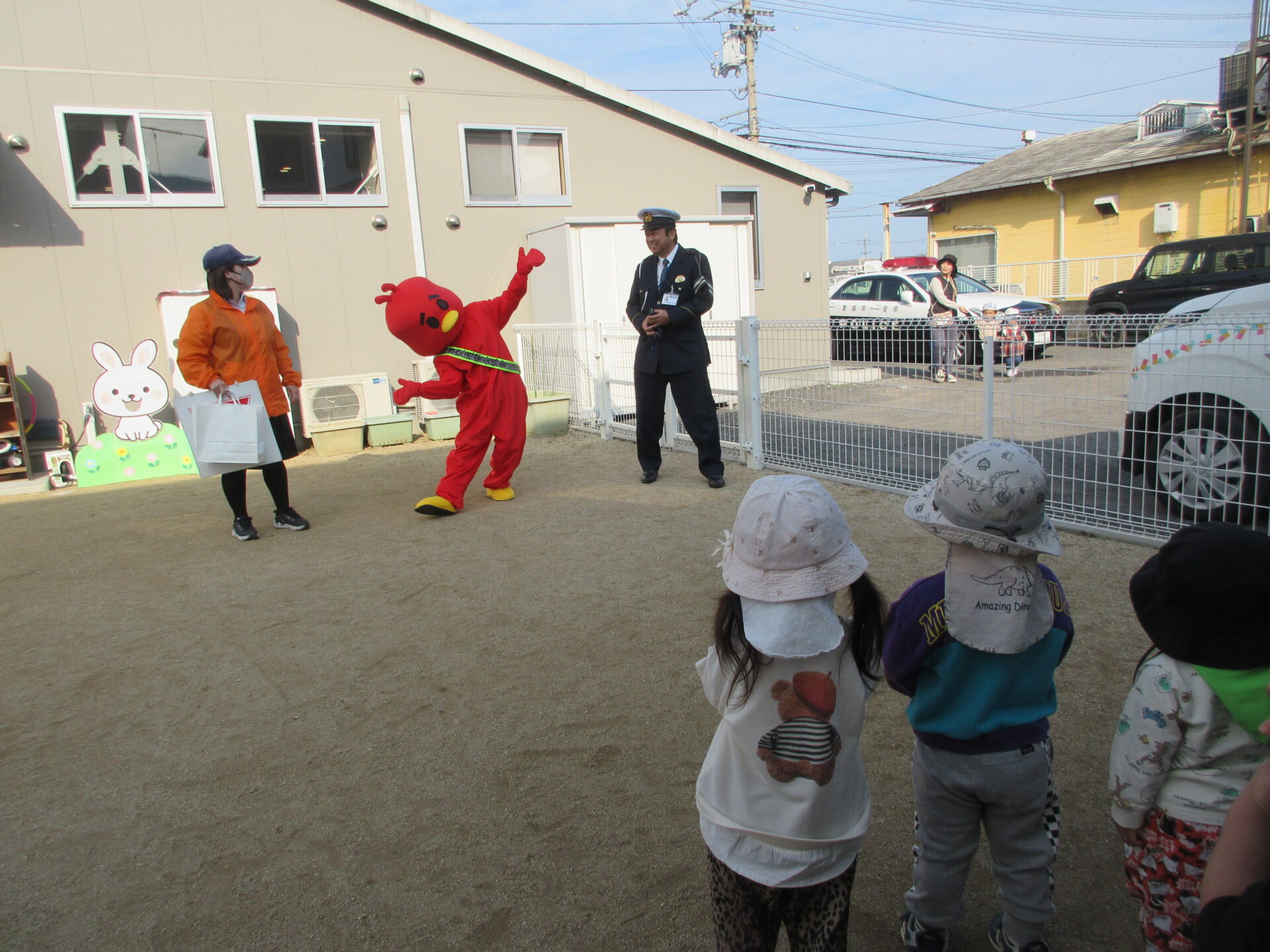 パトカーから、おまわりさん、お姉さん、マスコットのピヨちゃんの登場で、子どもたち大喜び。
