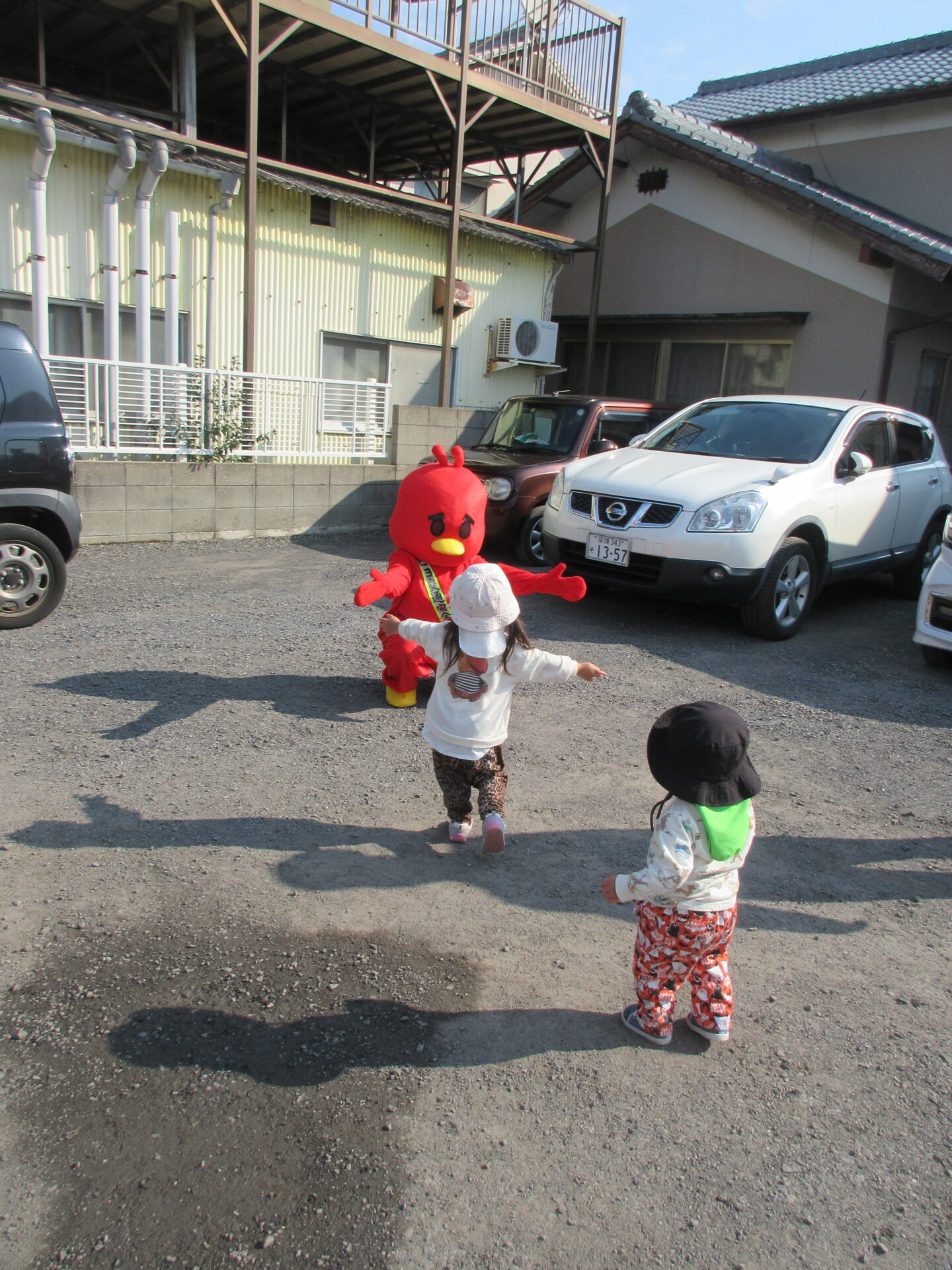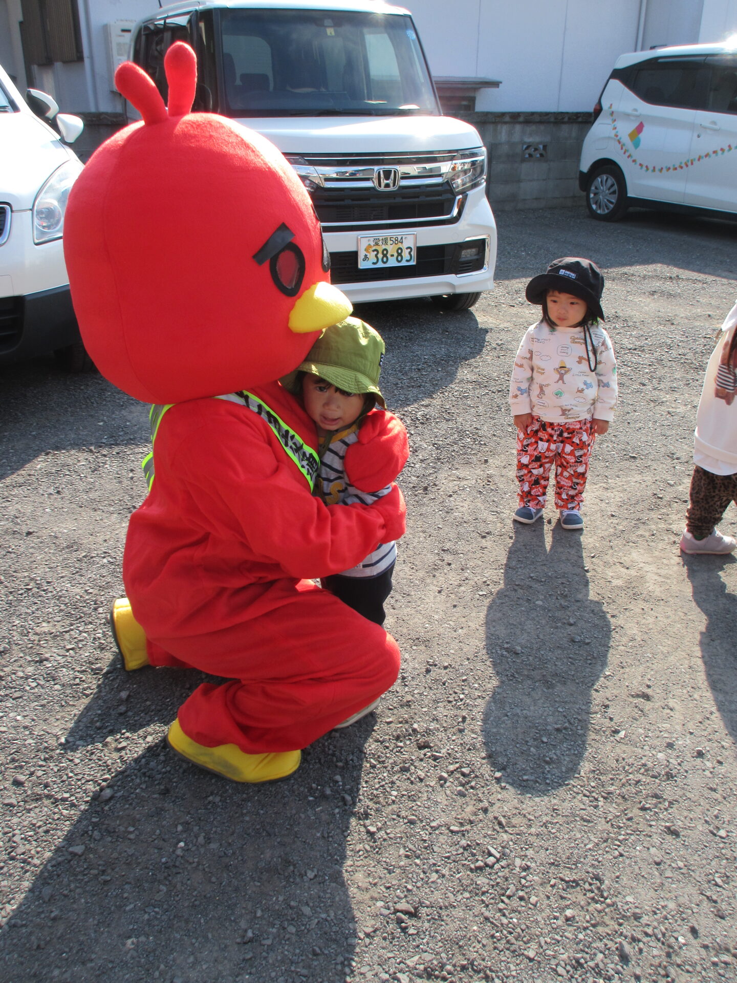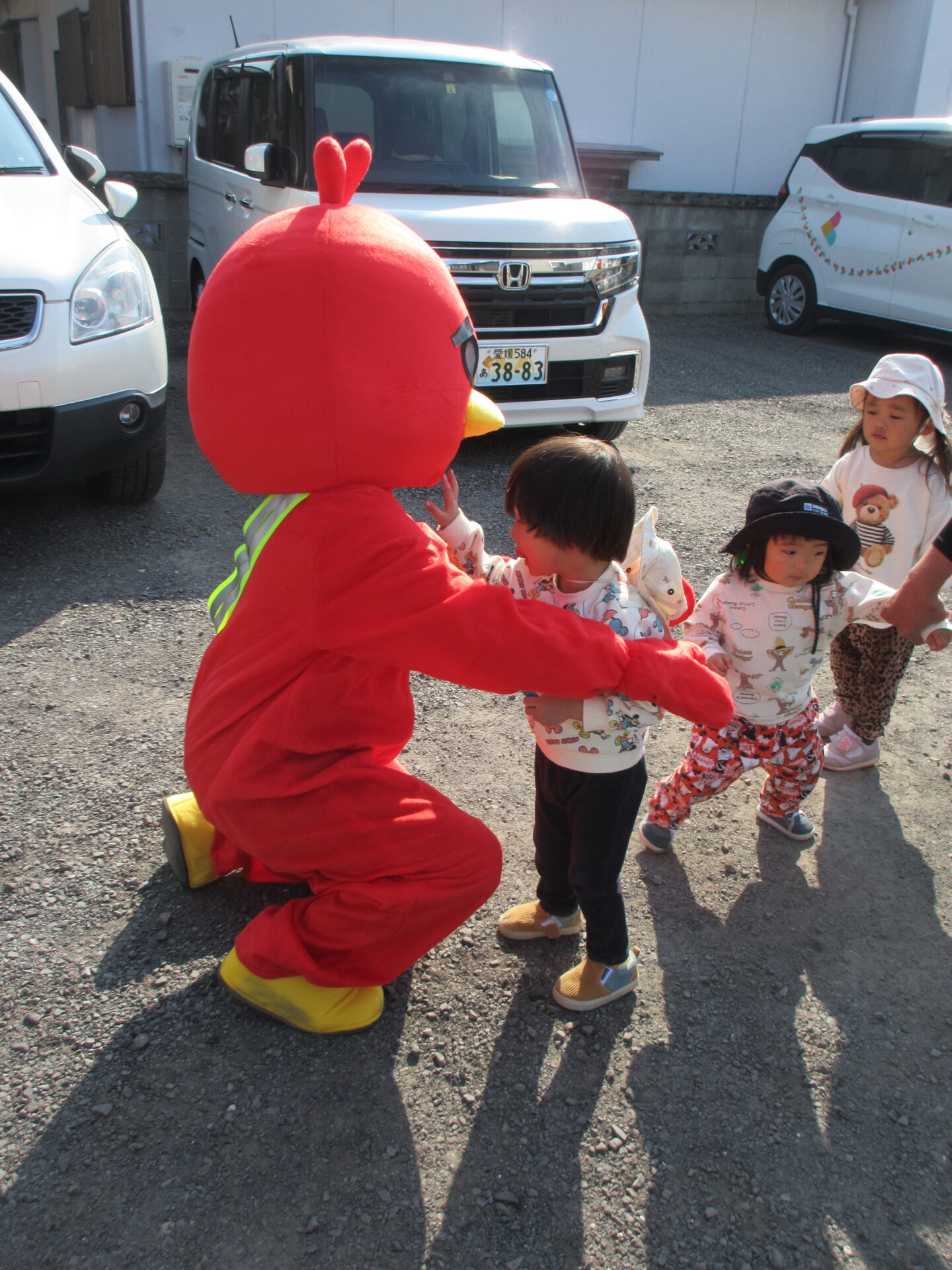 パトカーから、おまわりさん、お姉さん、マスコットのピヨちゃんの登場で、子どもたち大喜び。