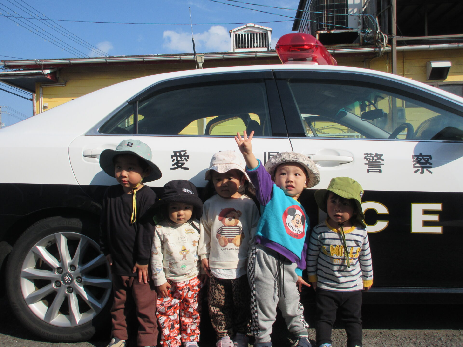 1,2歳児はパトカー🚔の前で、ごくろうさんポーズ、決まっていました。