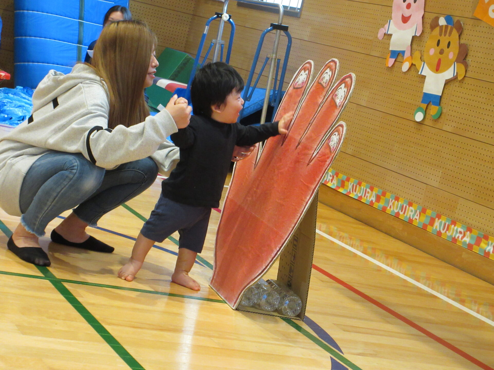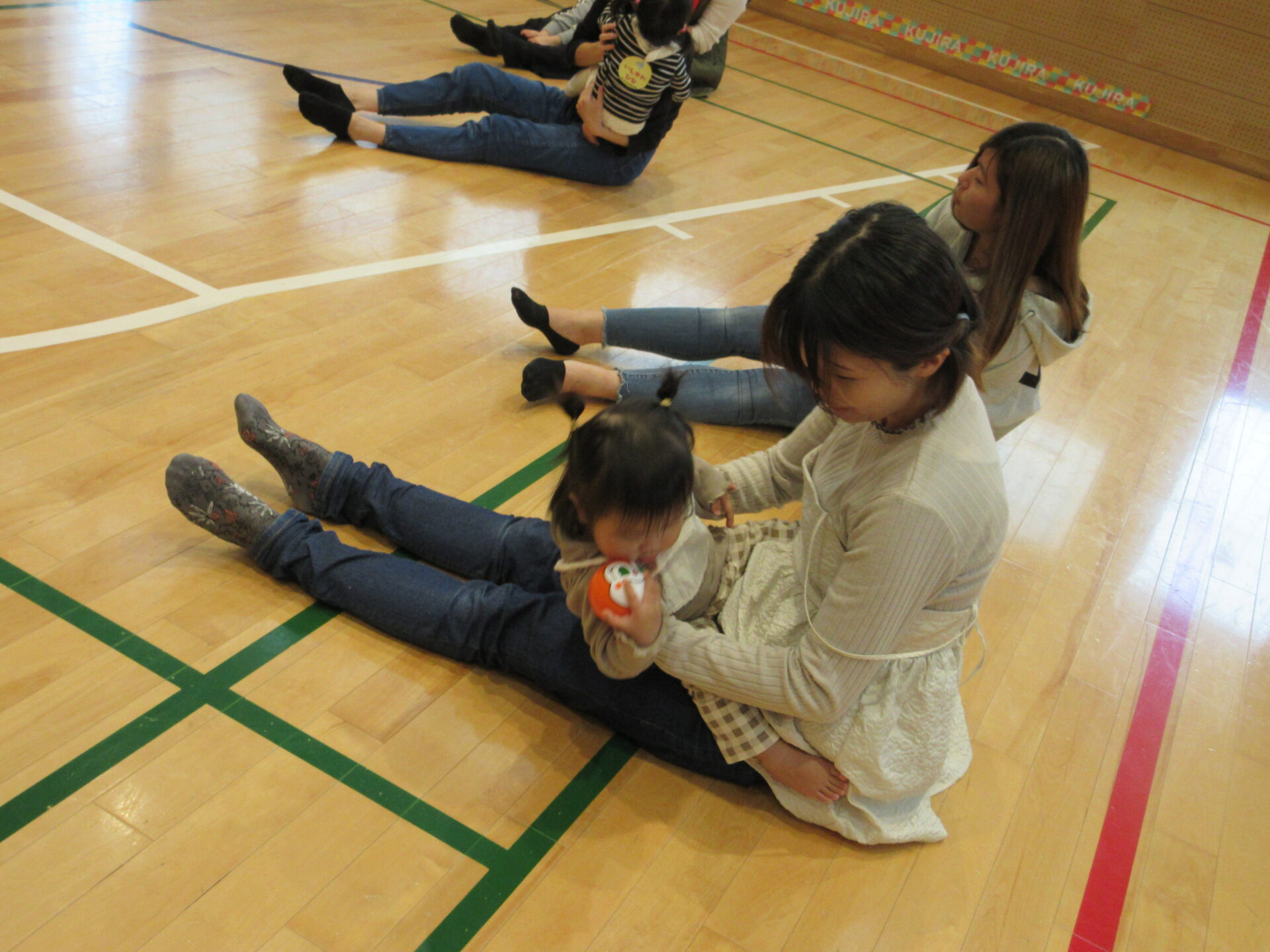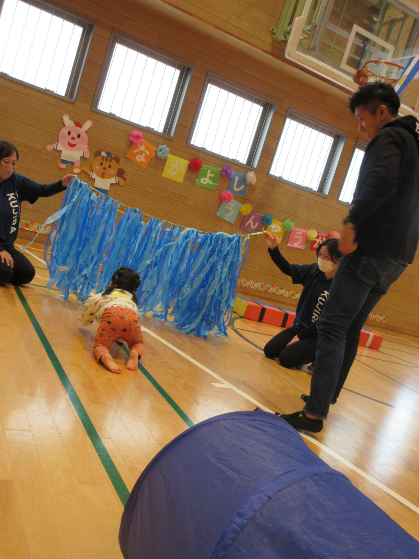 最初は、泣いてなかなかお家のひとから離れられなかった子どもたちですが、徐々にお家の人が見てくれている安心感を感じ、頑張ってする姿は、この半年で随分成長したんだなと感じました。