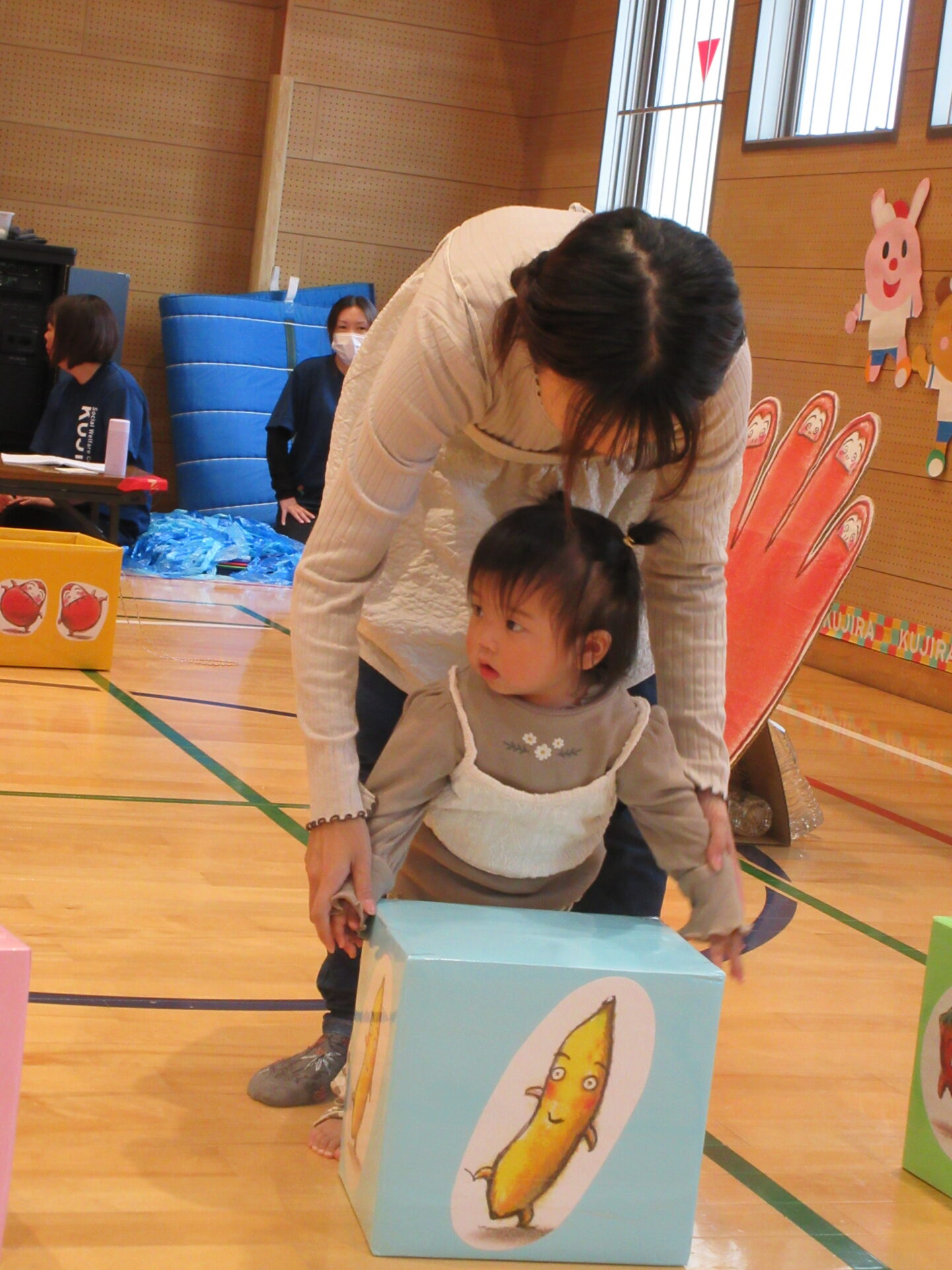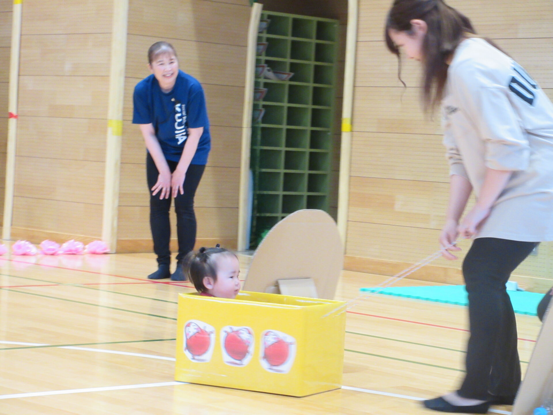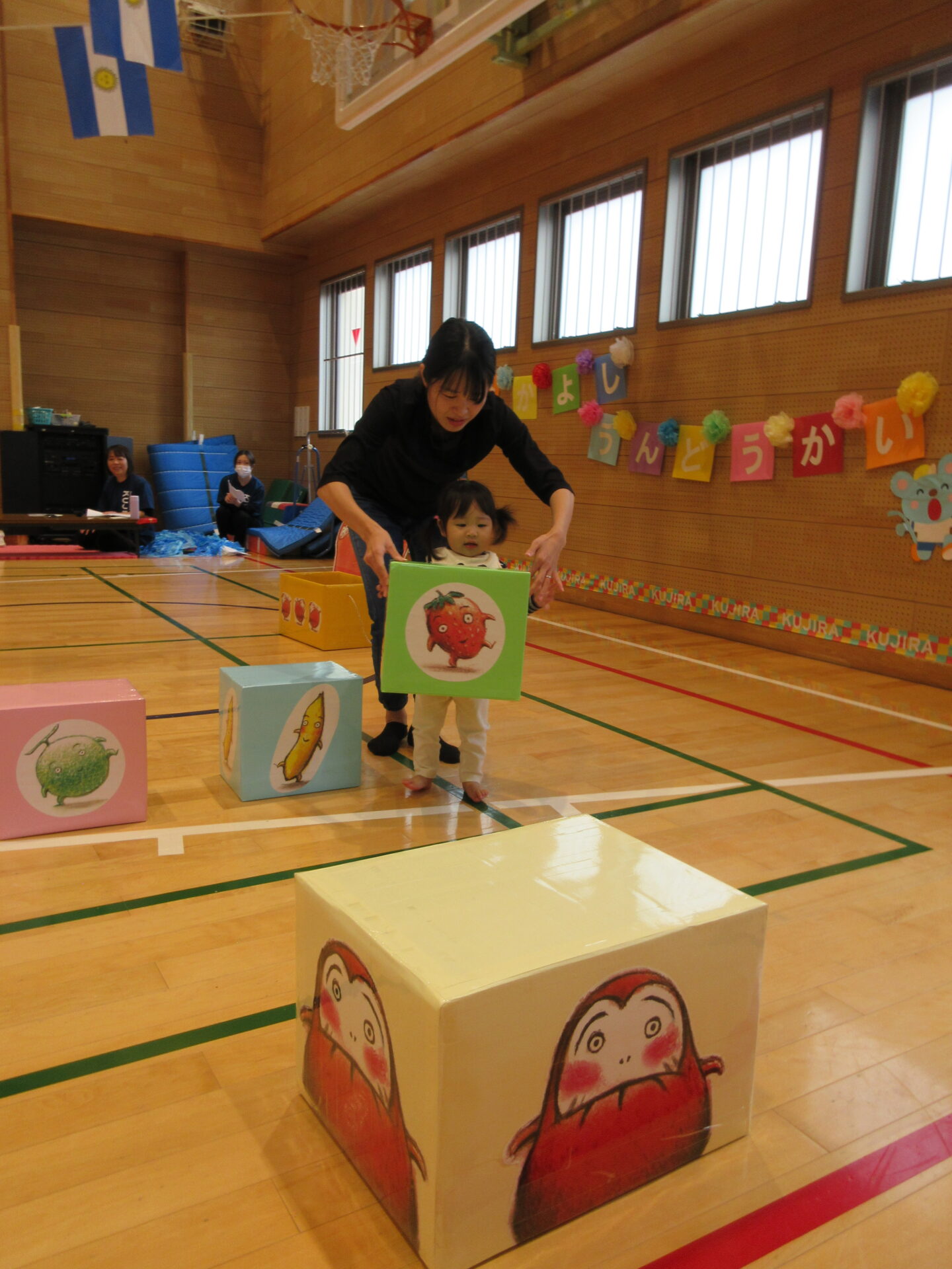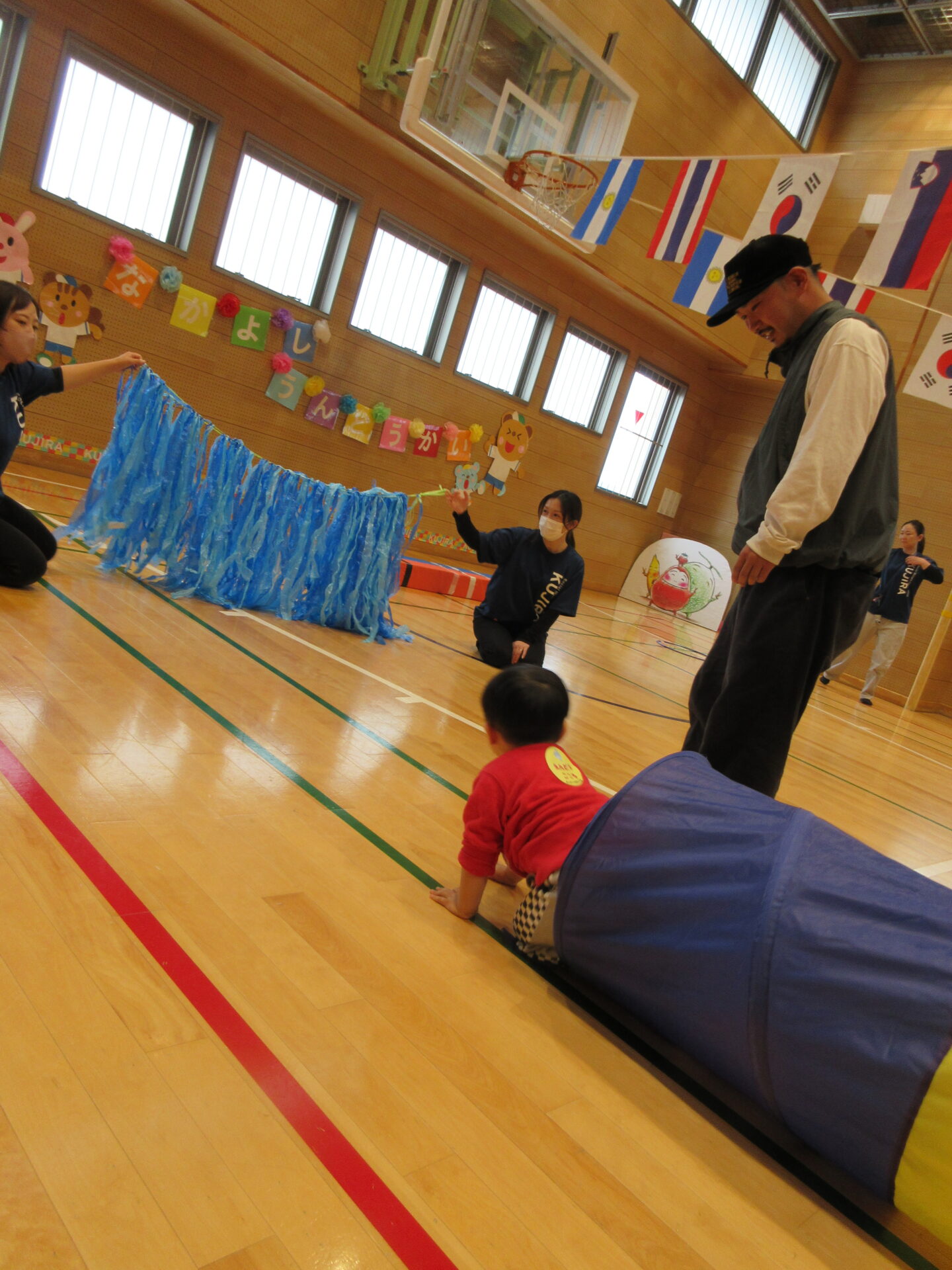 最初は、泣いてなかなかお家のひとから離れられなかった子どもたちですが、徐々にお家の人が見てくれている安心感を感じ、頑張ってする姿は、この半年で随分成長したんだなと感じました。