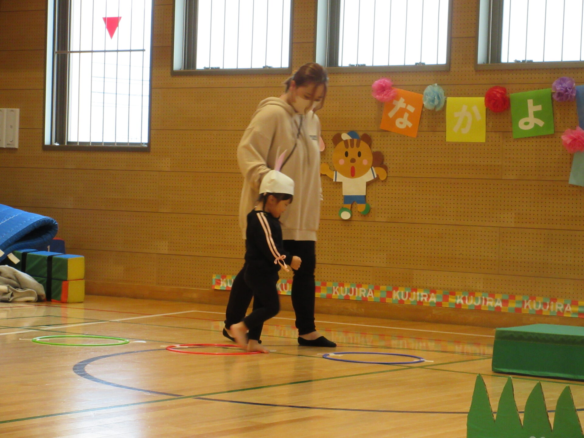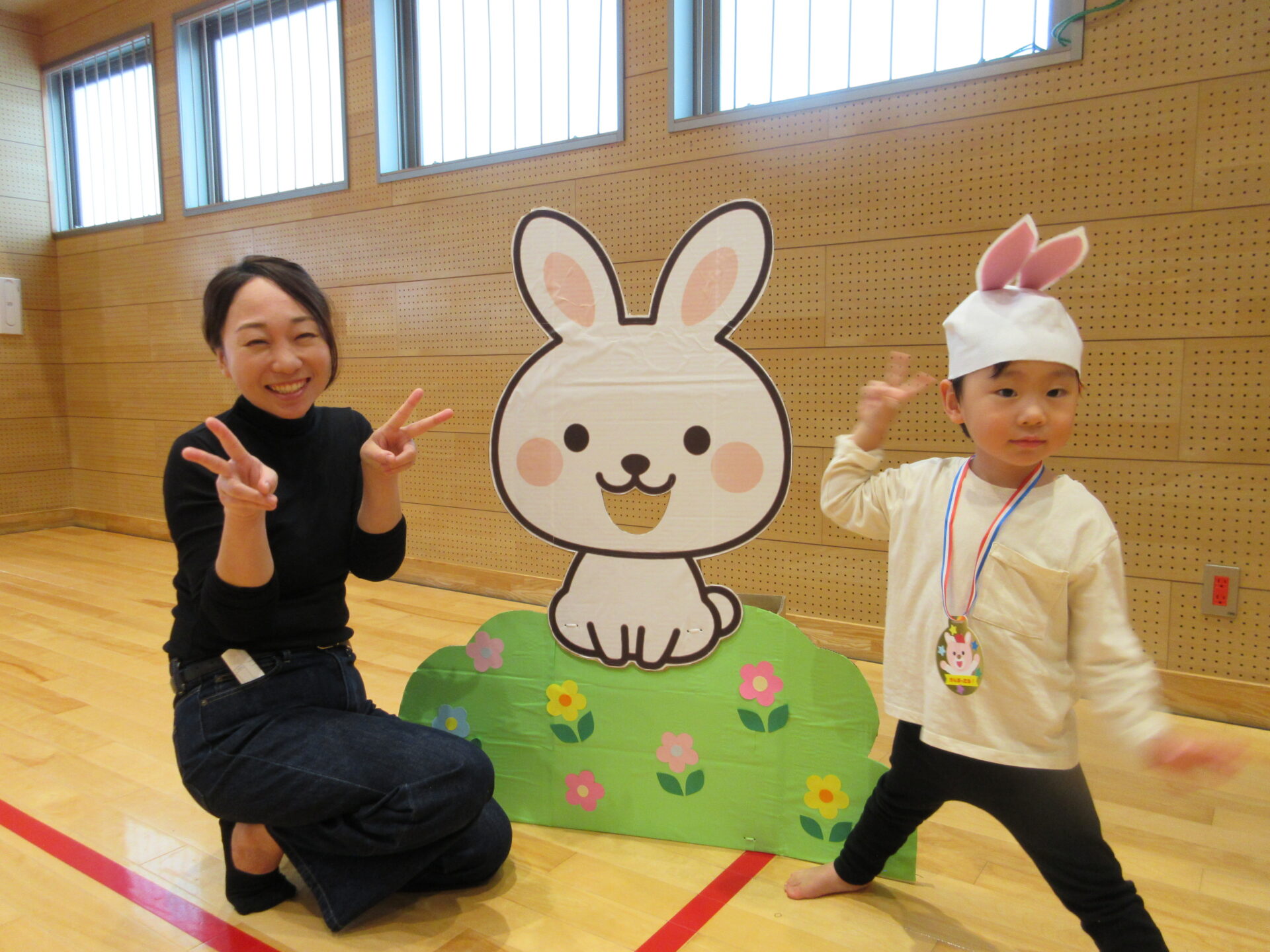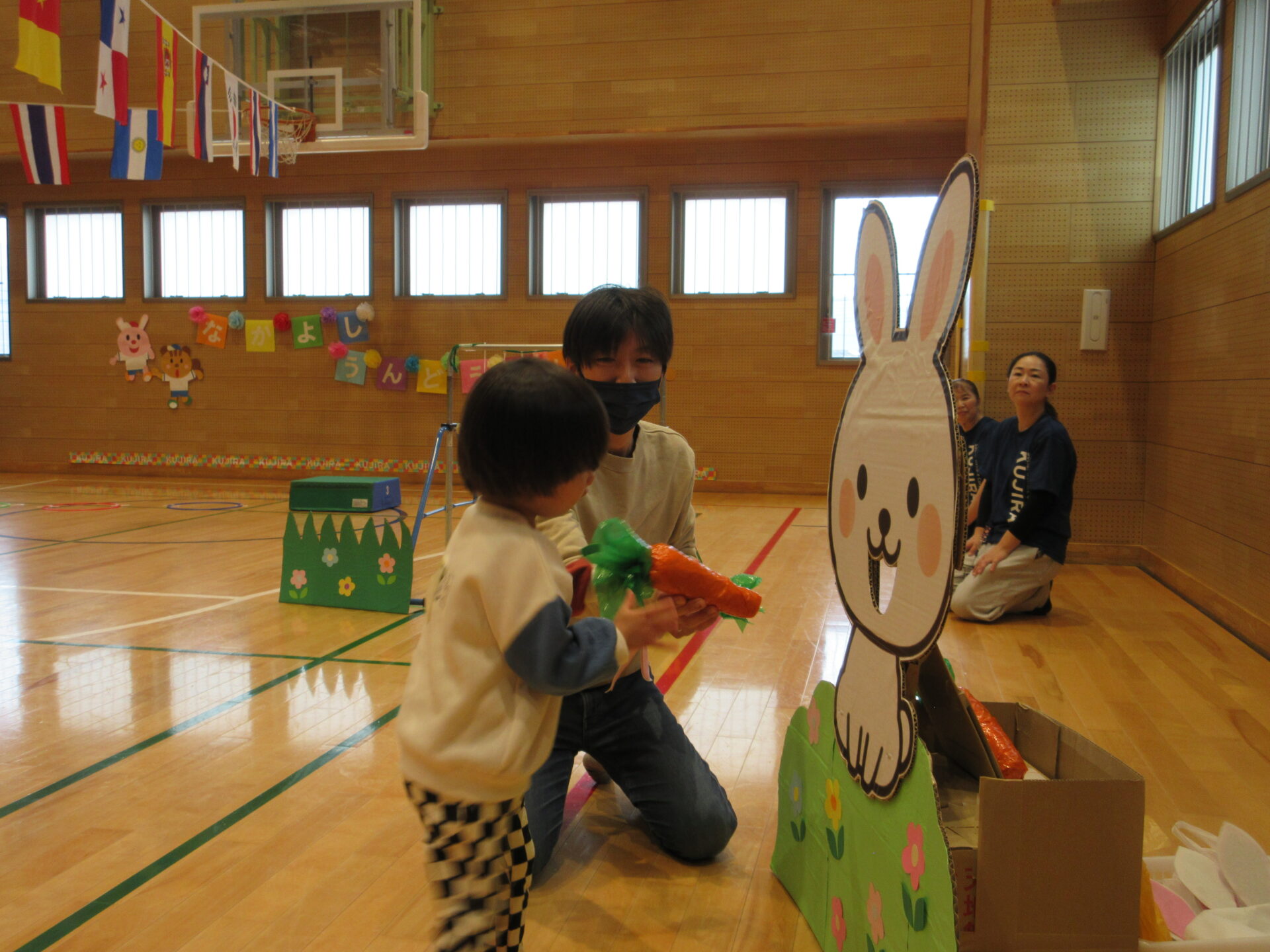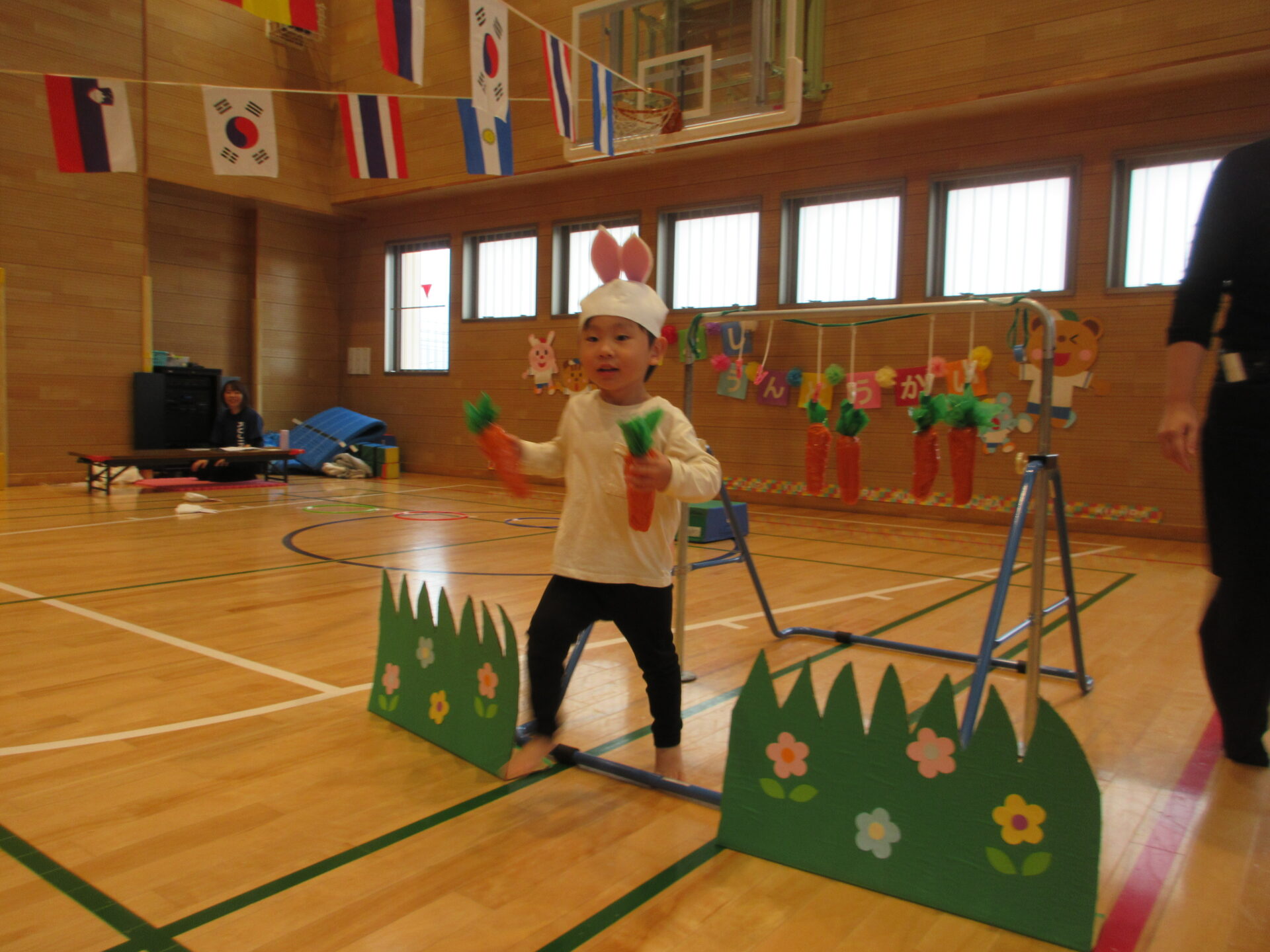 体を動かすことが大好きなまんぼう組さん。うさぎに変身して、大好きな人参をゲットしに行きます。