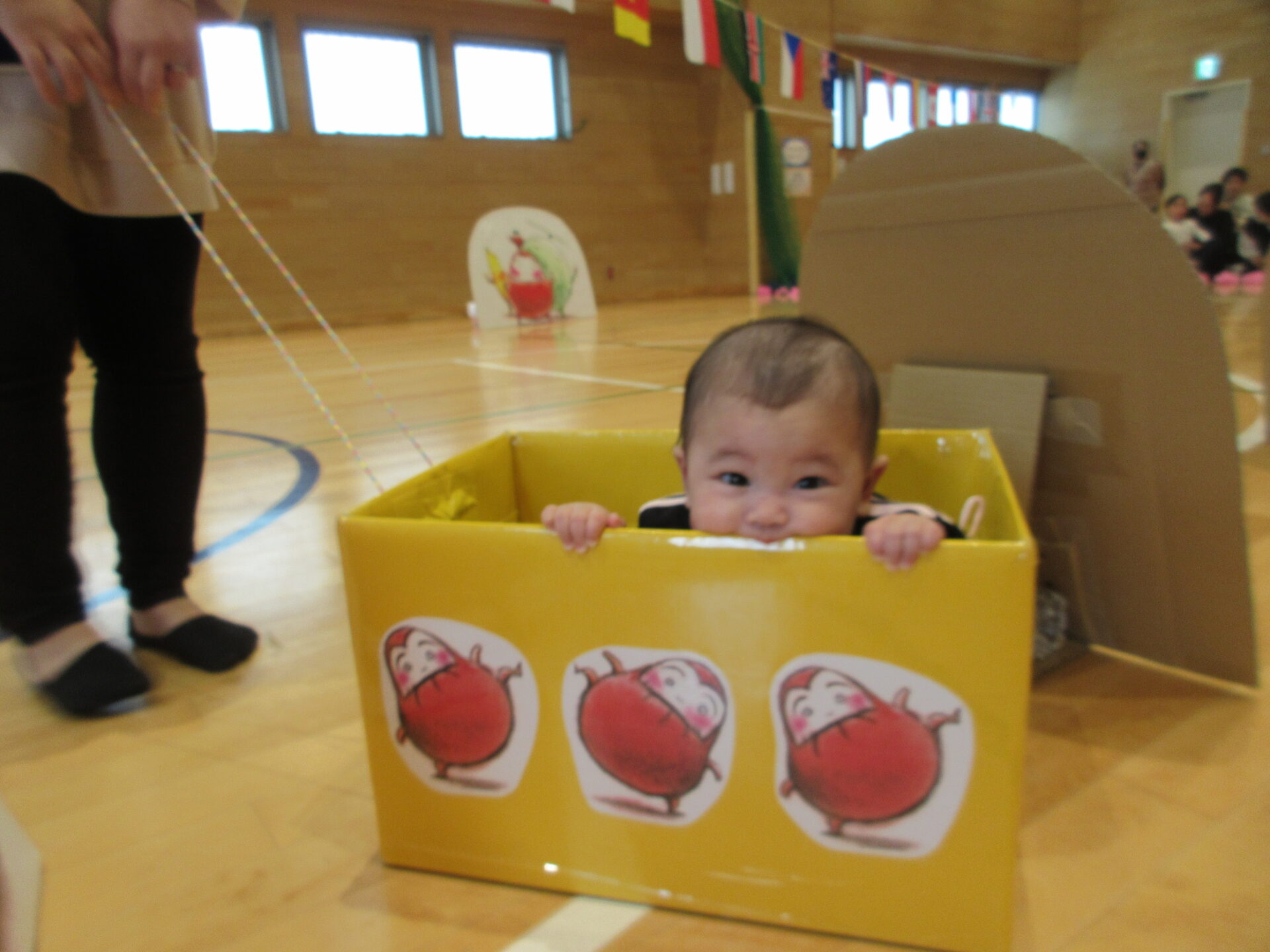 うみ組(0歳児)は、「だるまさんが」のシリーズの絵本が大好きで、始まると、いつも体を揺らして見ています。大好きなだるまさんの世界に、お家の人と一緒に出発です!!