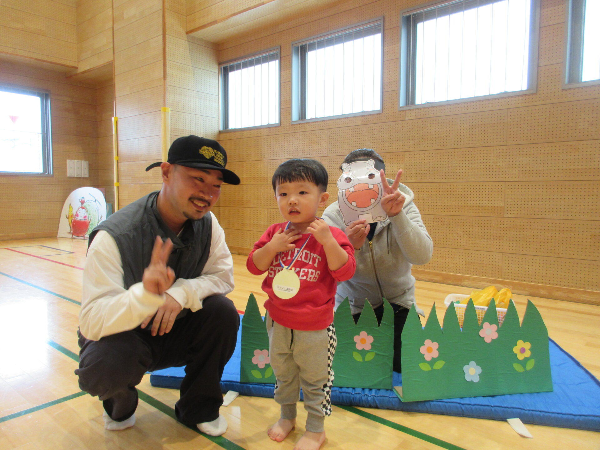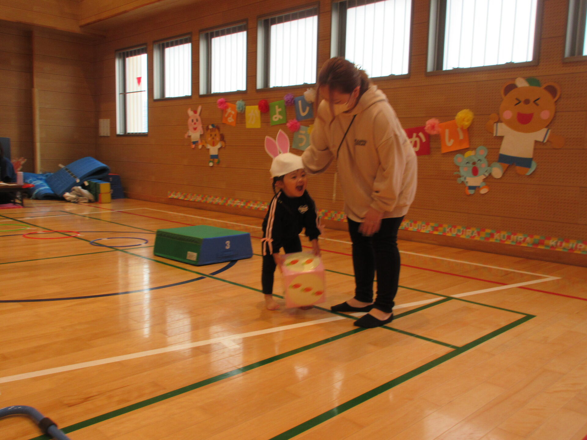 次は、まんぼう組(2歳児)「ぴょんぴょんレース」です。