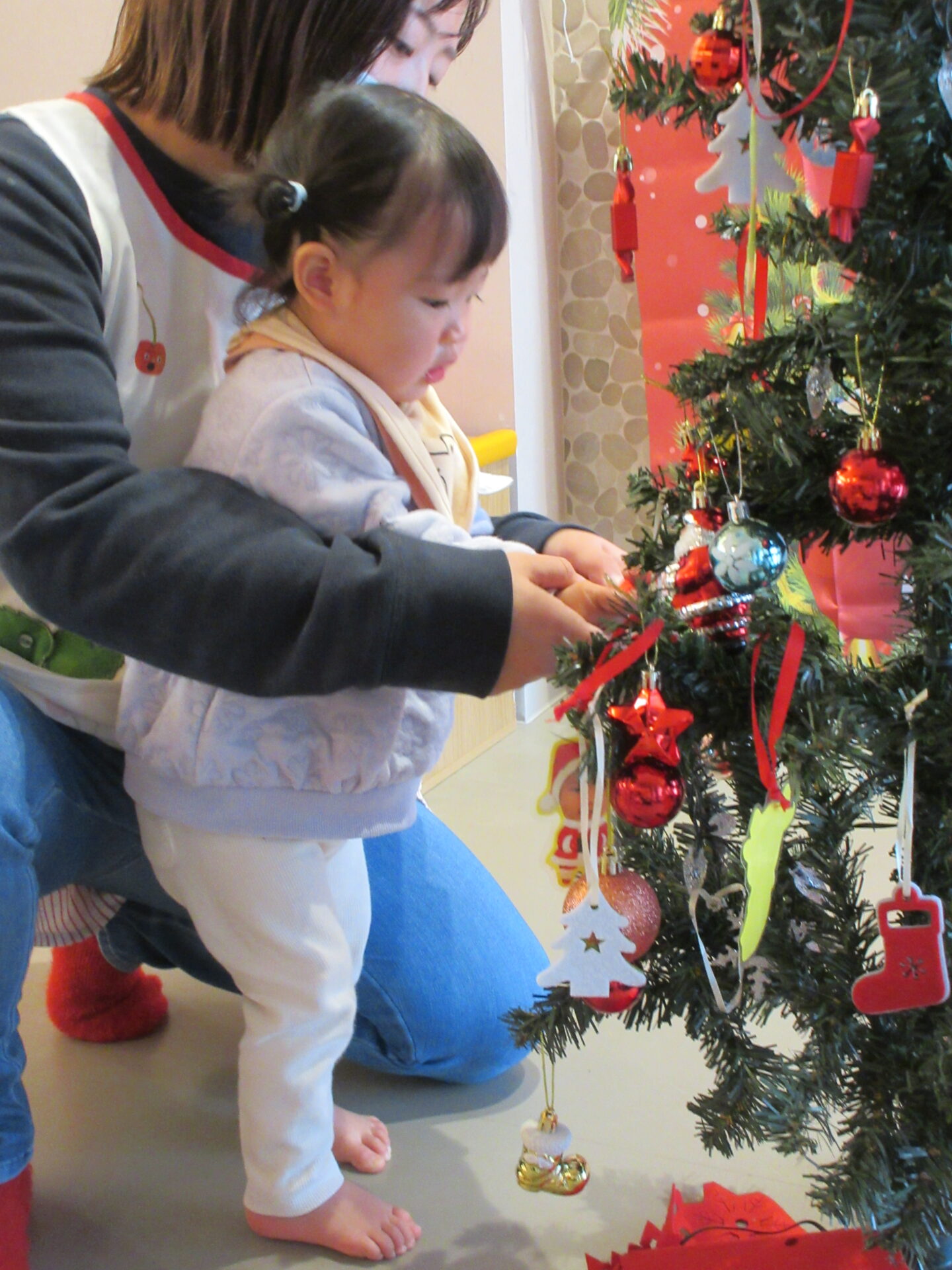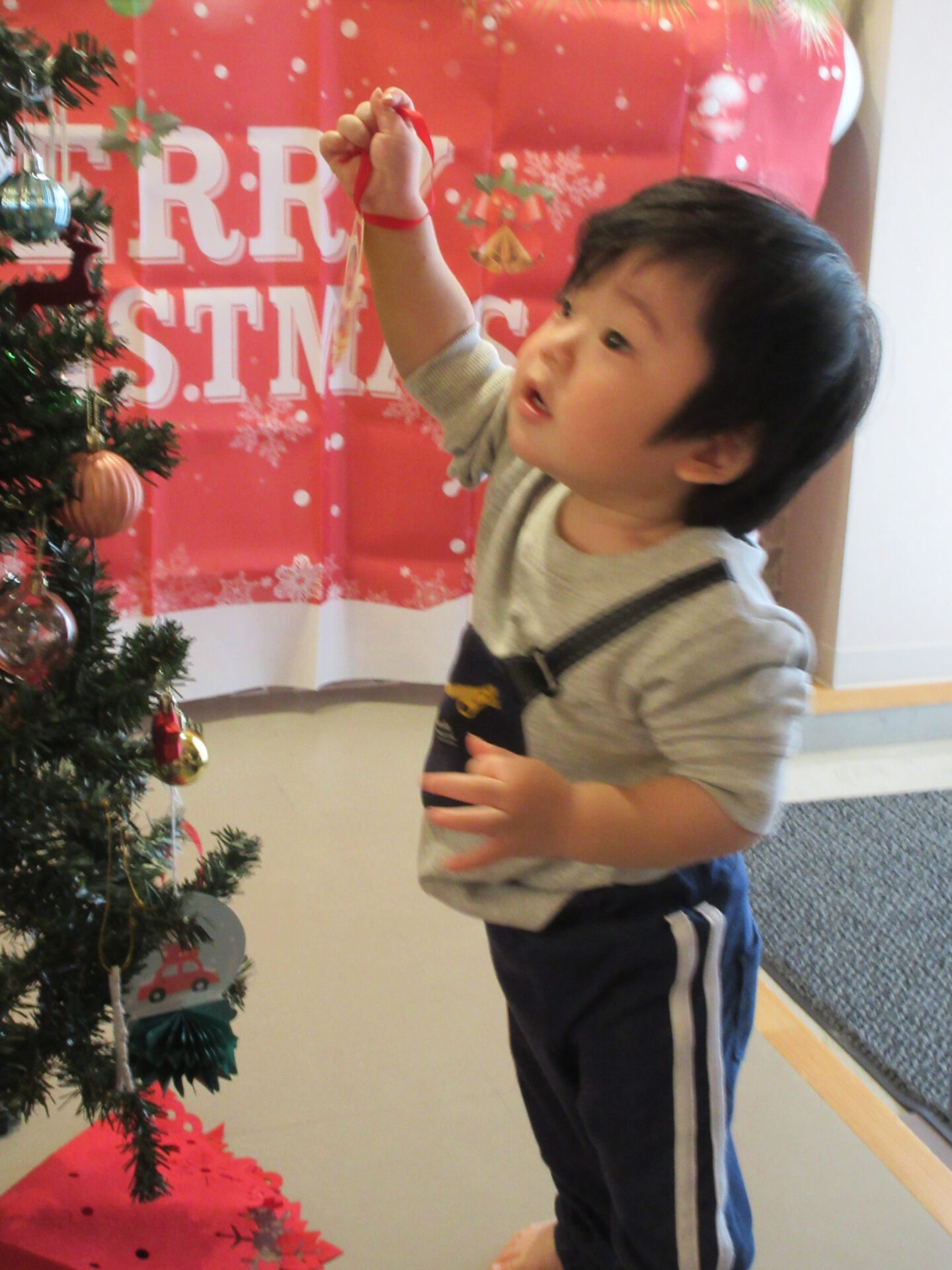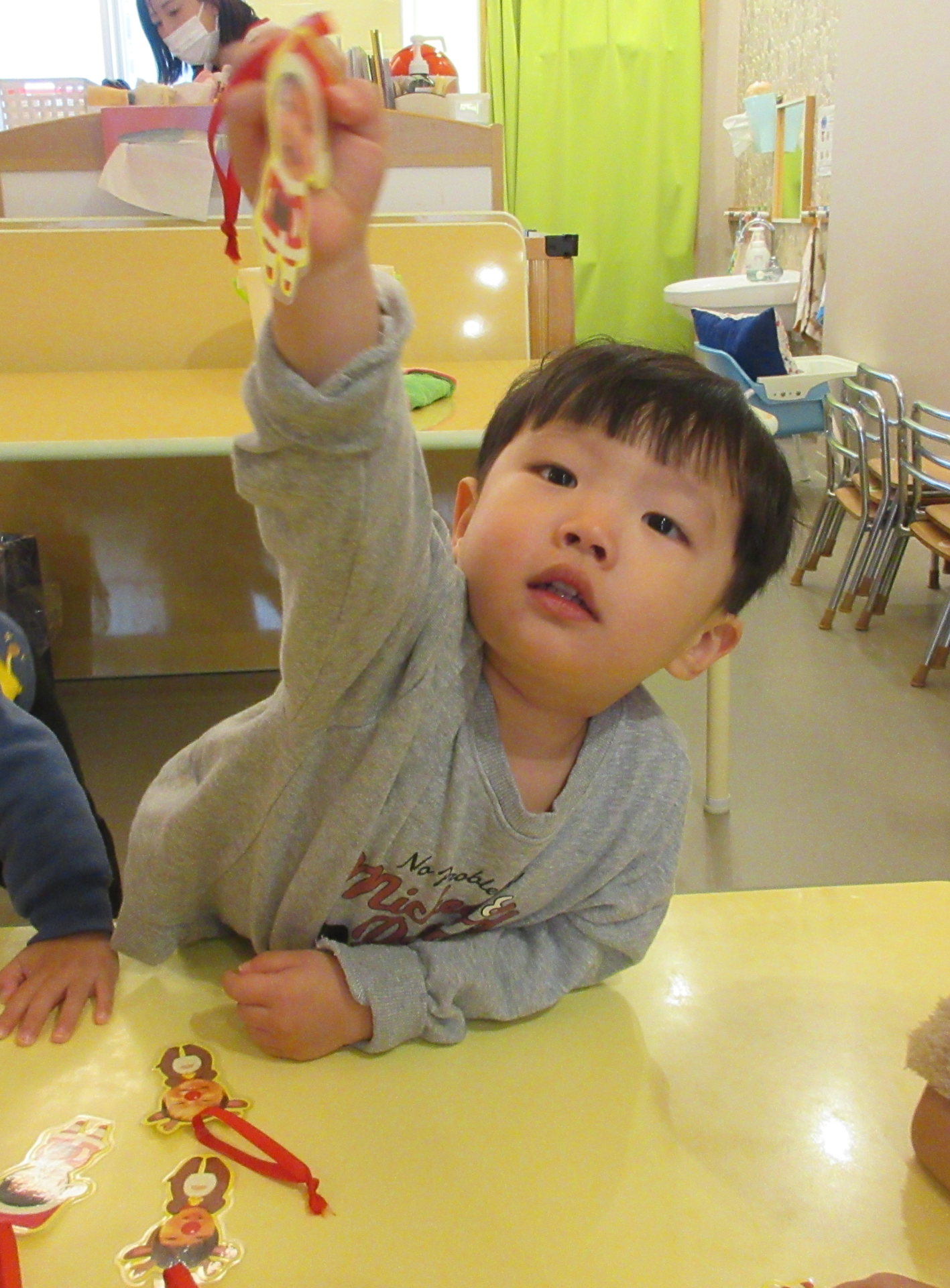 飾る前に、トナカイ、サンタクロースのオーナメントを並べ、「自分のサンタさん取って」と伝えると、自分の顔が分かるようで、取っていました。