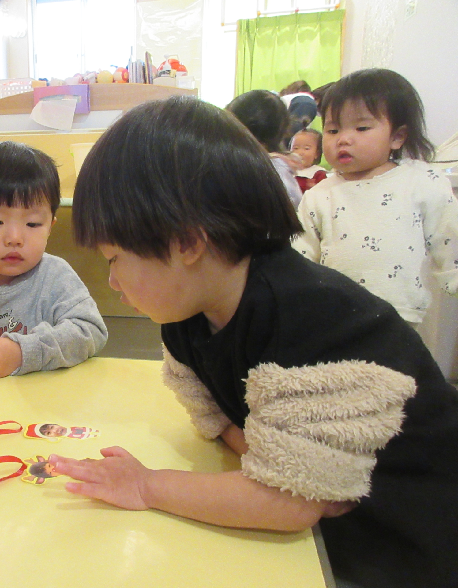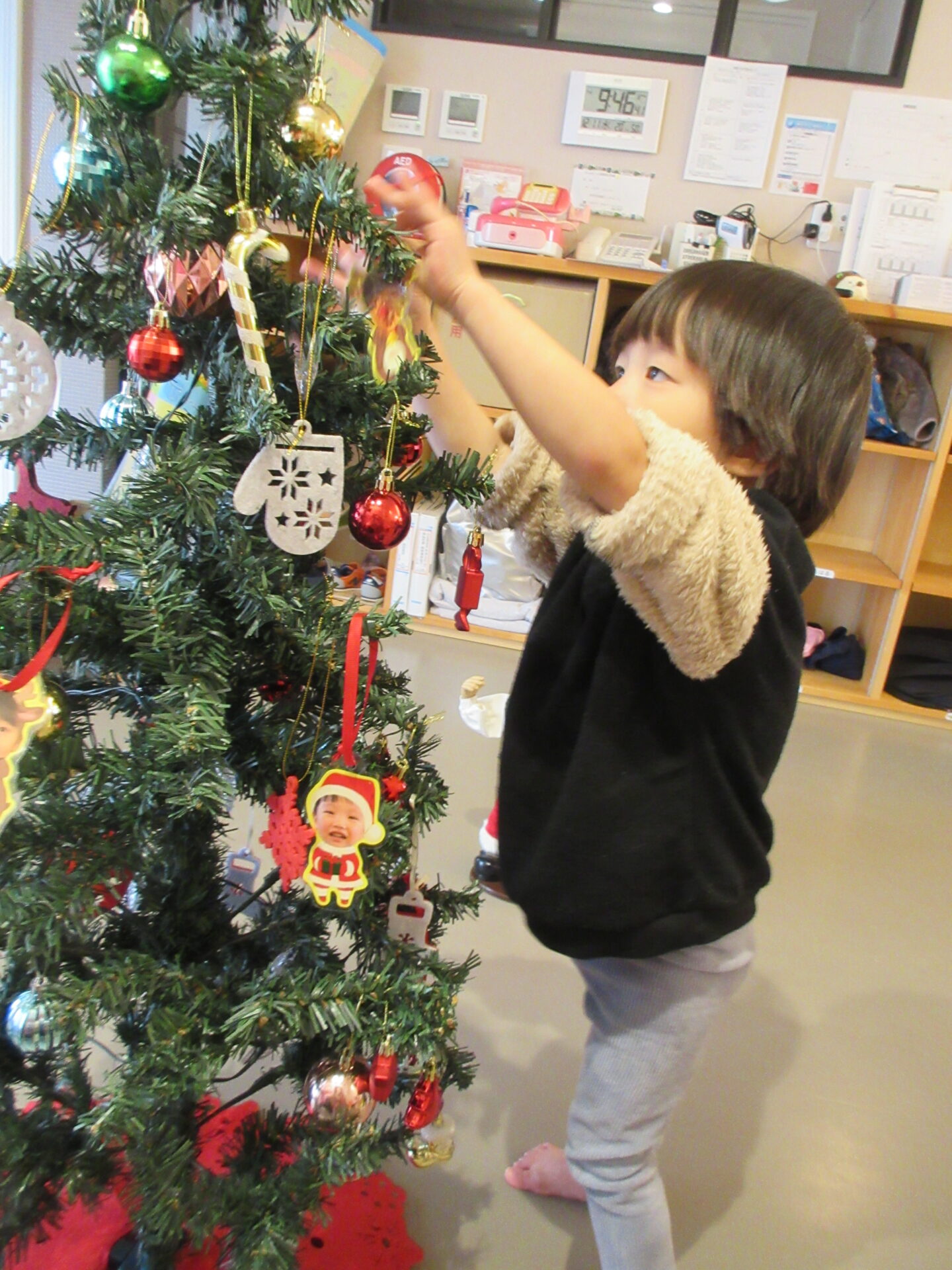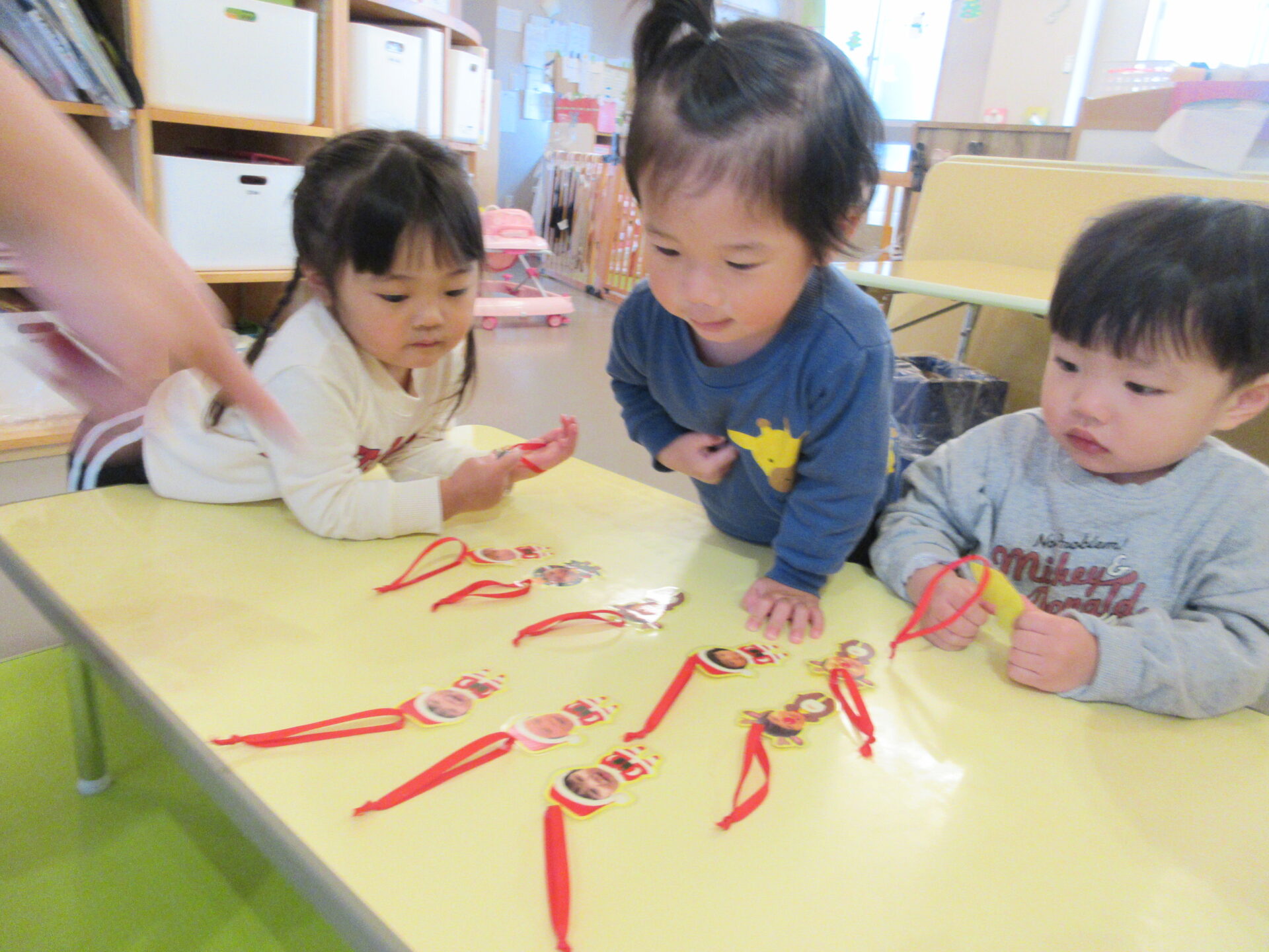 飾る前に、トナカイ、サンタクロースのオーナメントを並べ、「自分のサンタさん取って」と伝えると、自分の顔が分かるようで、取っていました。