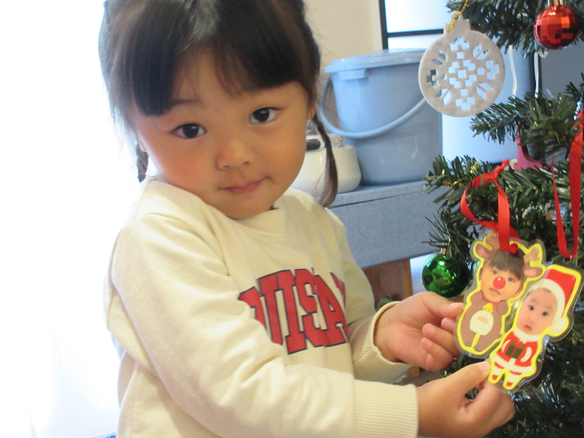 新たに、自分の顔のトナカイ、サンタクロースのオーナメントを作り、飾りました。