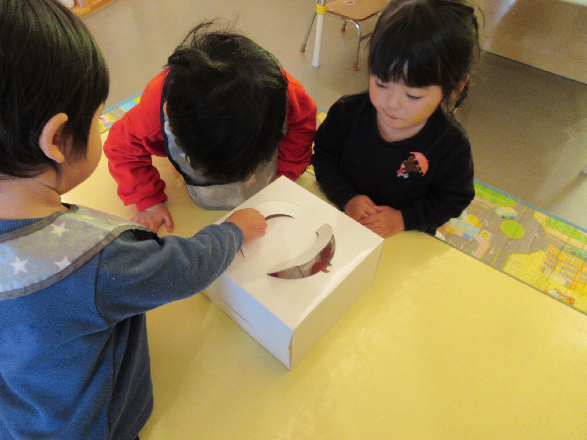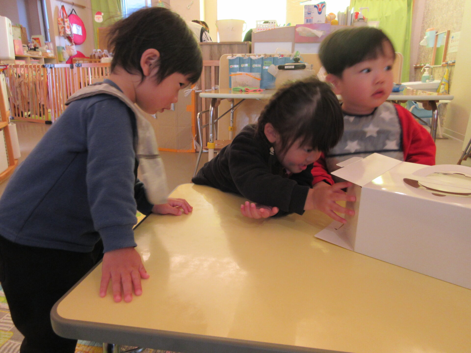 ケーキの箱が置いてあるのを見て、「ケーキがある」と喜んで、箱をのぞき込んでいました。