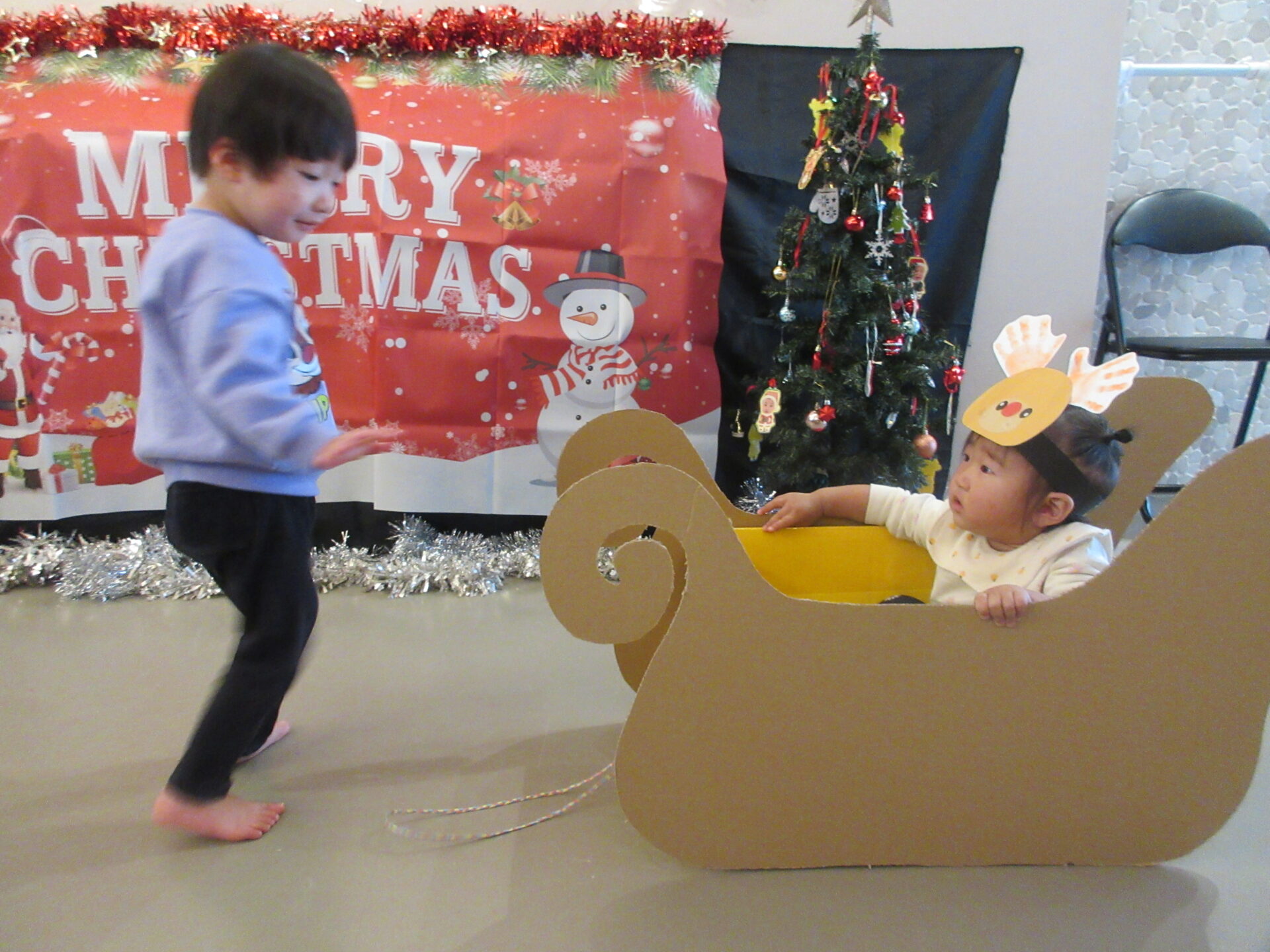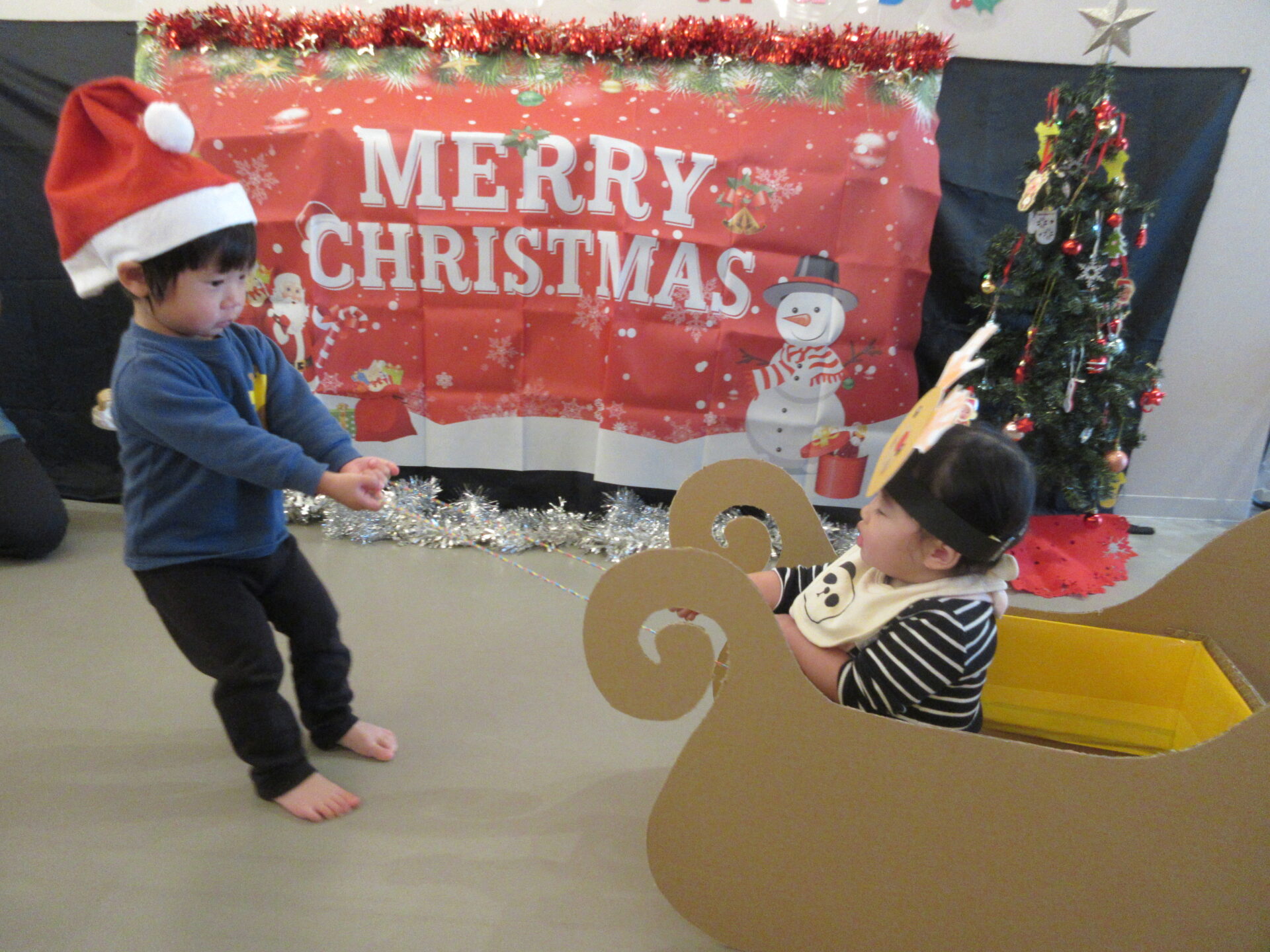まんぼう組・そら組はサンタの三角帽子、うみ組はトナカイのお面をつけて、そりゲームをしました。