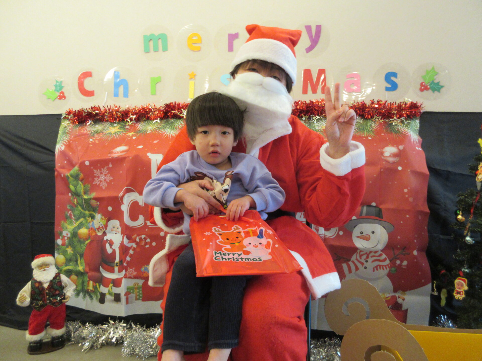 まんぼう組・そら組は、「ありがとう」と、しっかりとお礼を言って、サンタさんと抱っこして写真をとりました。
