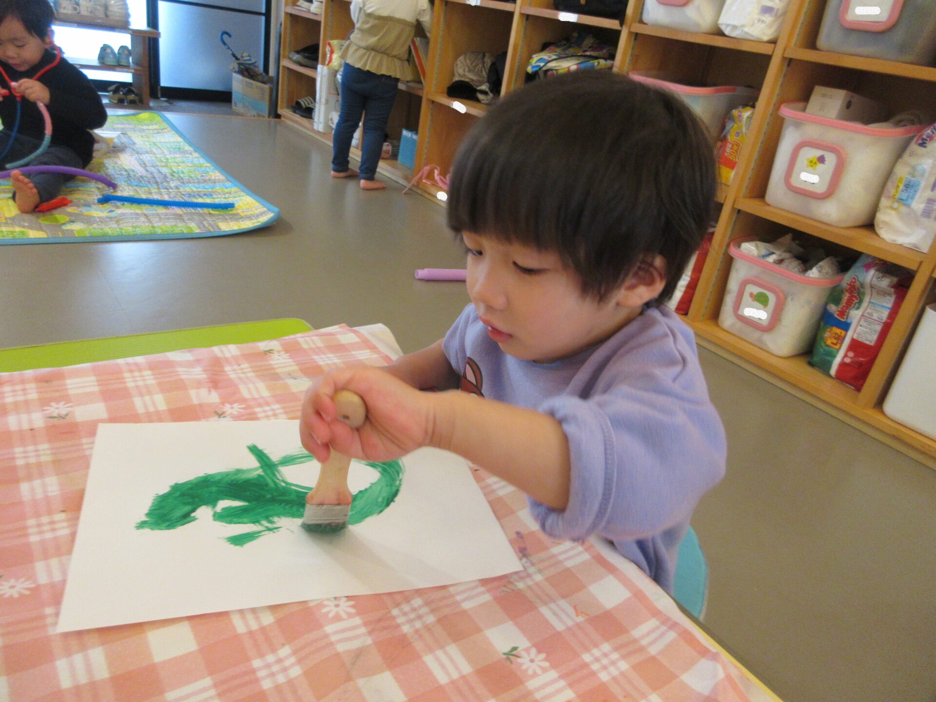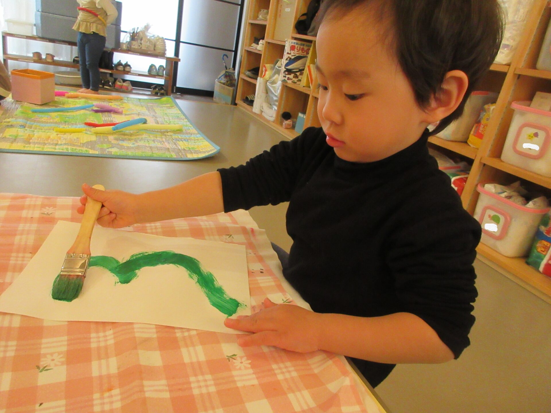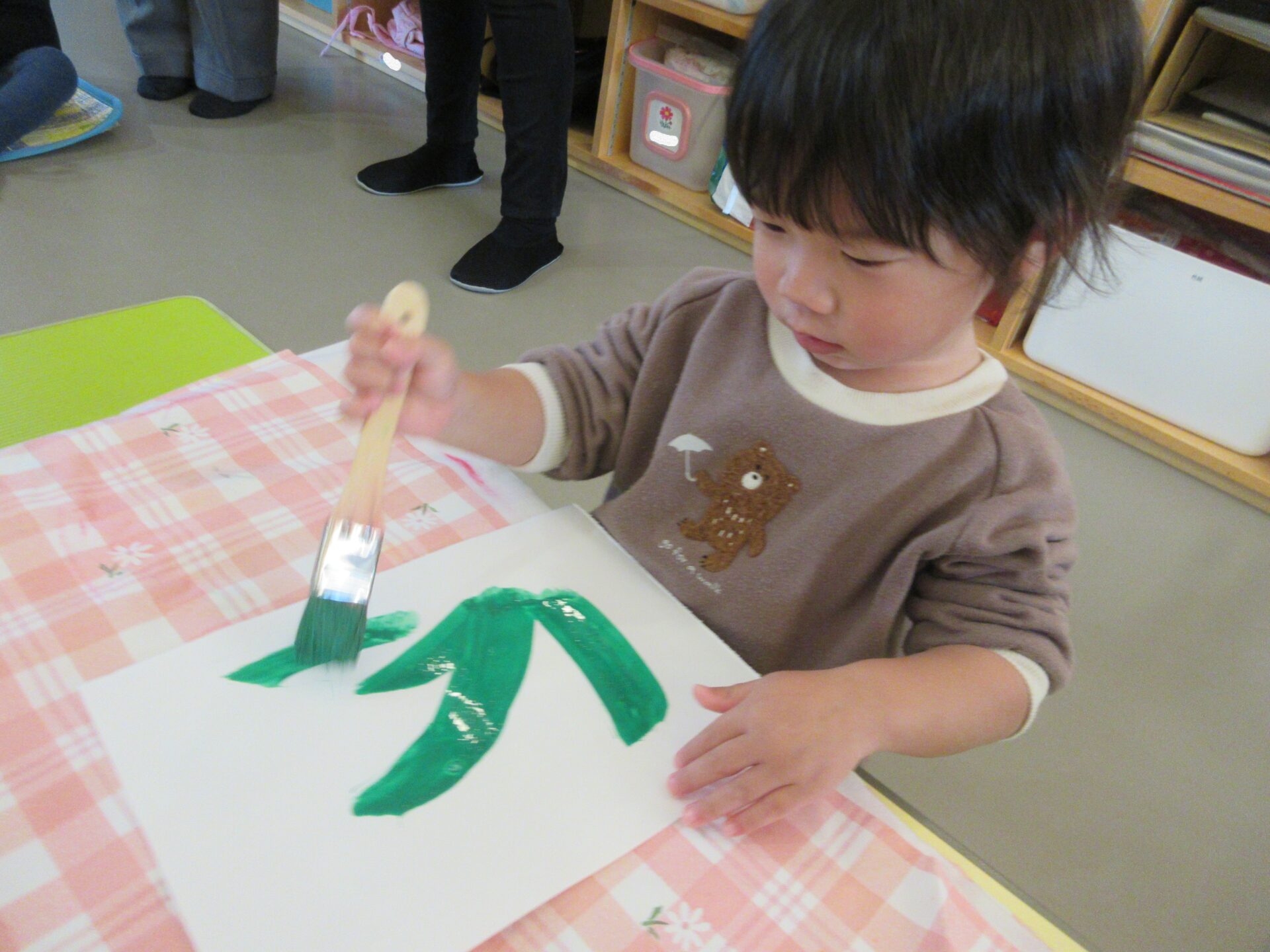 その後、1,2歳児は書初めをしたり、コマを回して遊んだり、正月ならではの遊びを楽しんでいます。