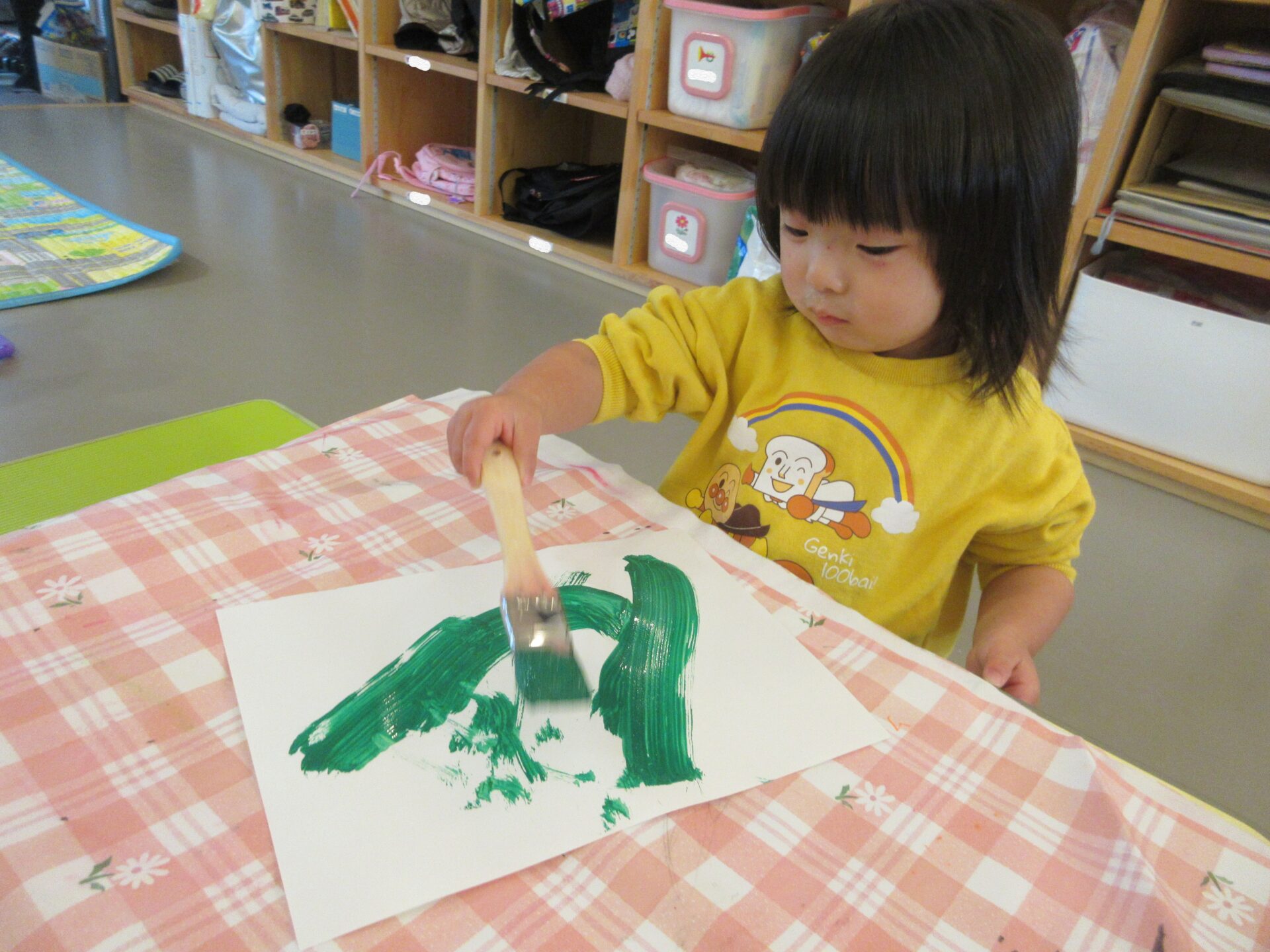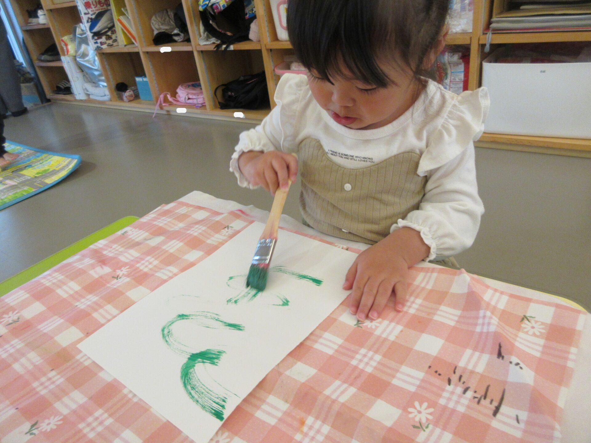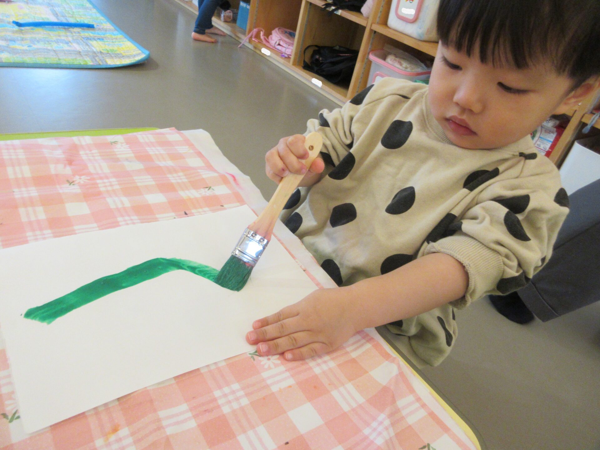 その後、1,2歳児は書初めをしたり、コマを回して遊んだり、正月ならではの遊びを楽しんでいます。