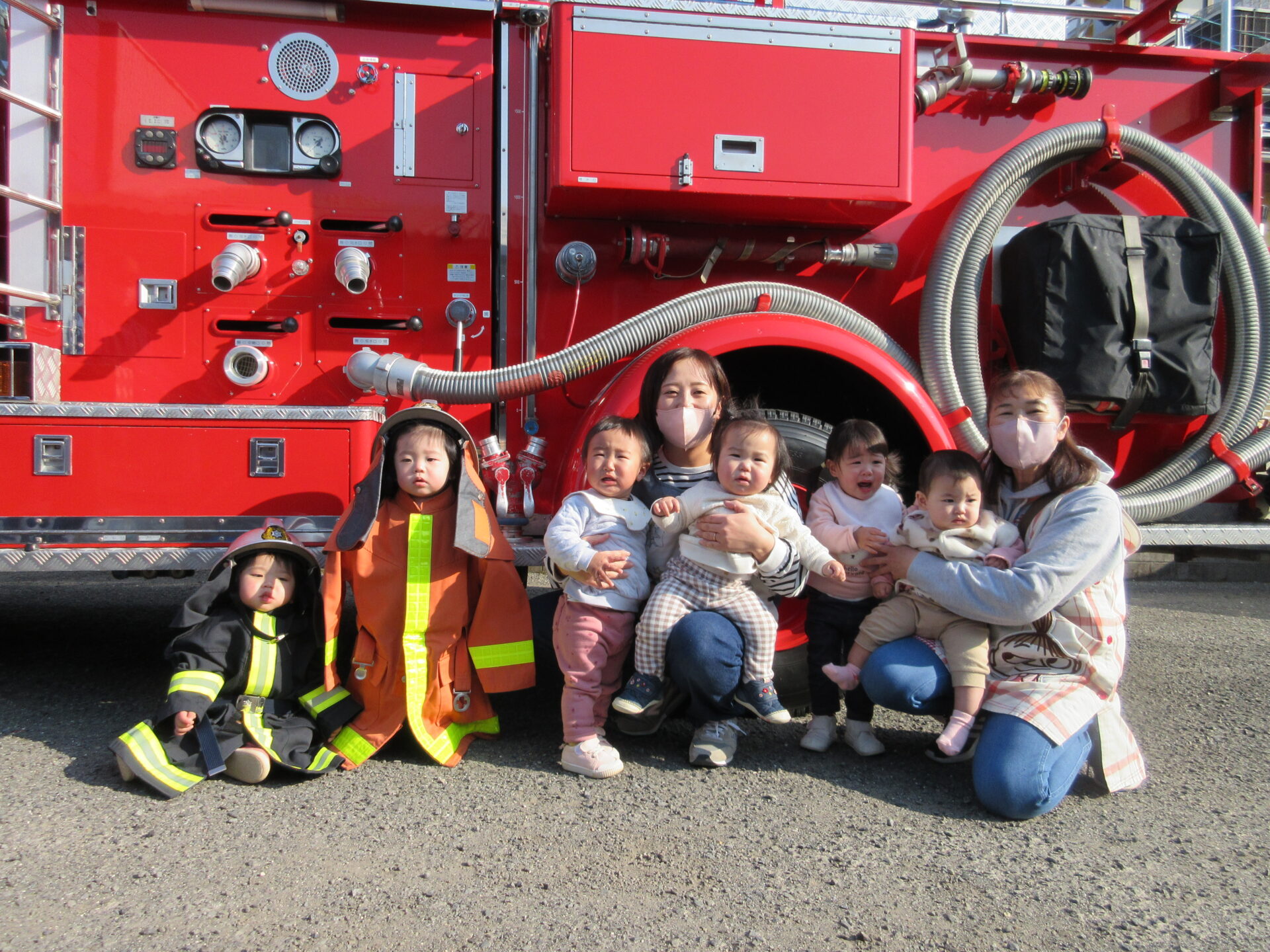 子どもたちは、消防車が来て大喜びでした。消防士さんが、保育園の中に入ってくると、0歳児は、人見知りが発動して、大泣きでした。