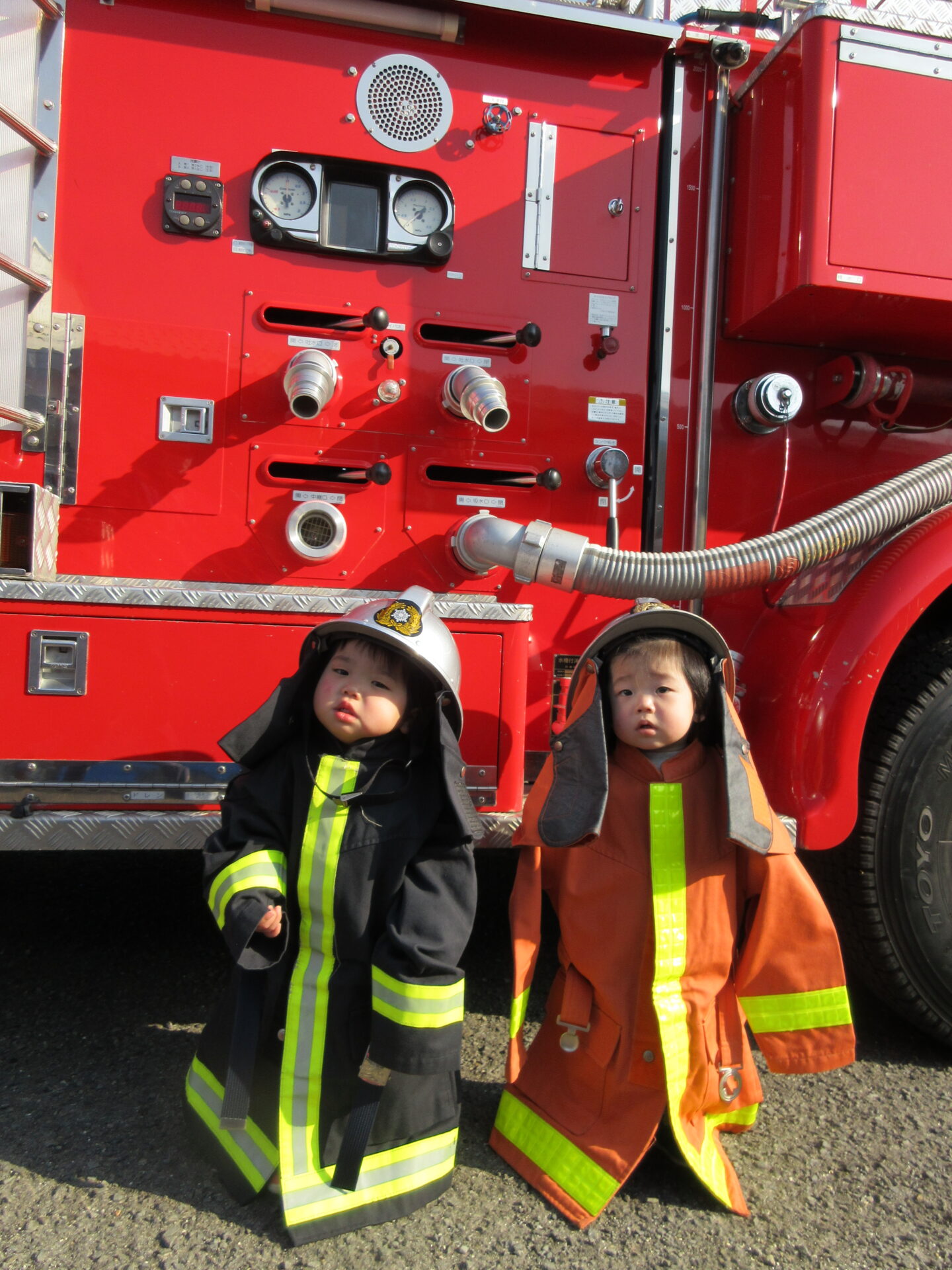 消防服を着せてもらい、消防車の前で写真を撮りました。