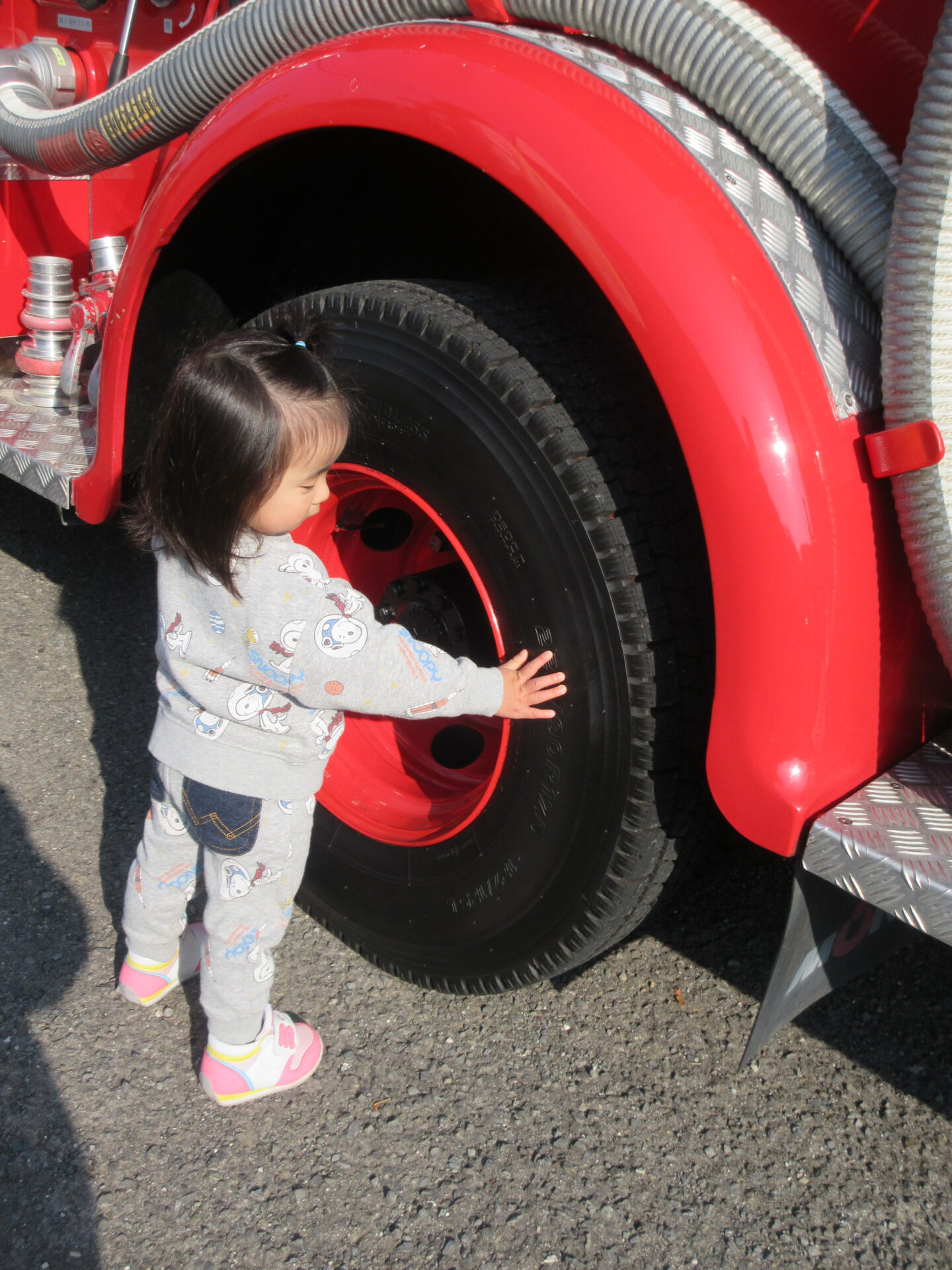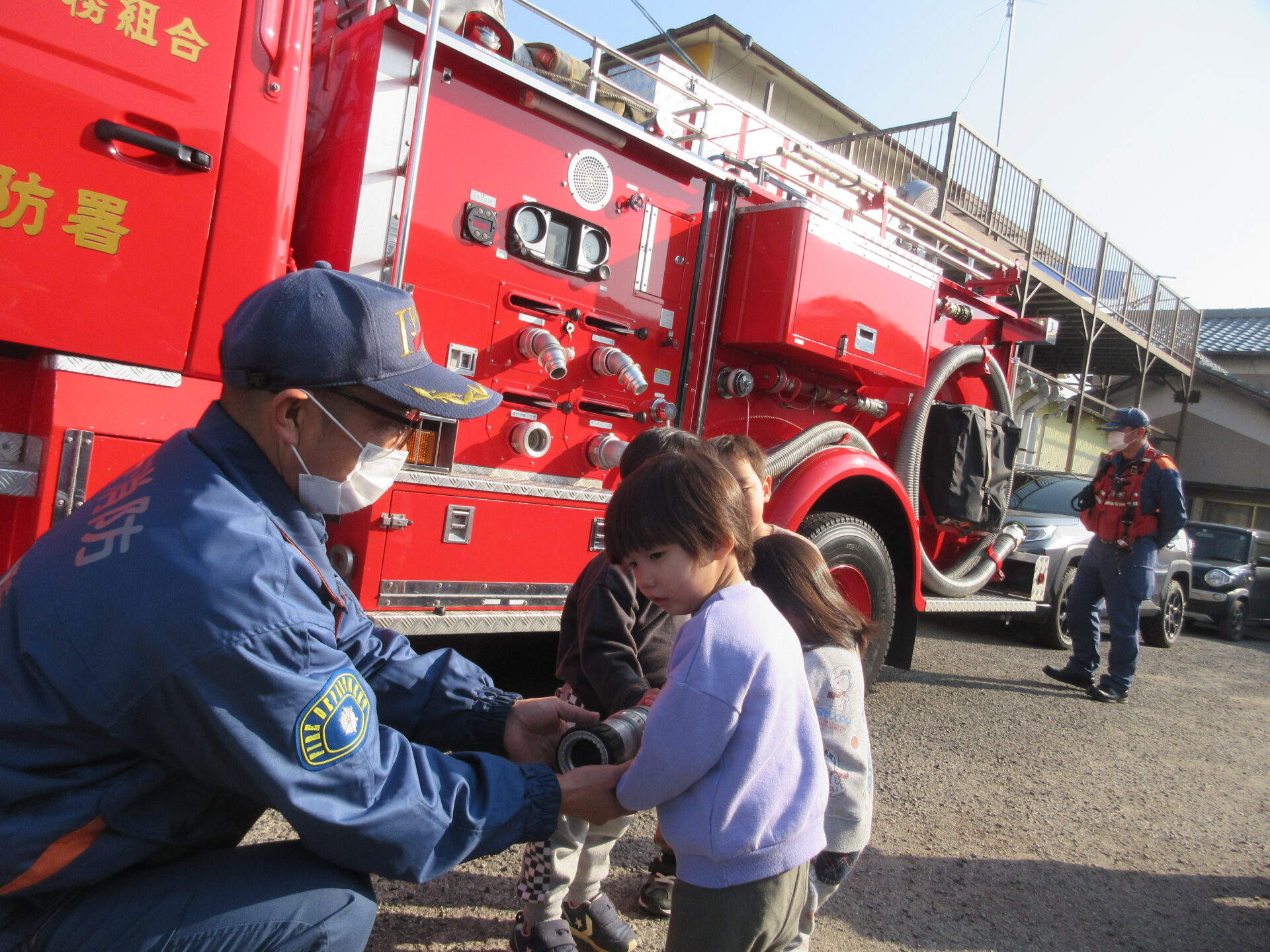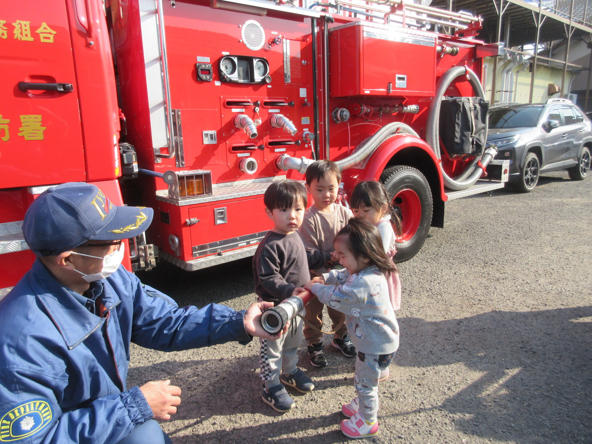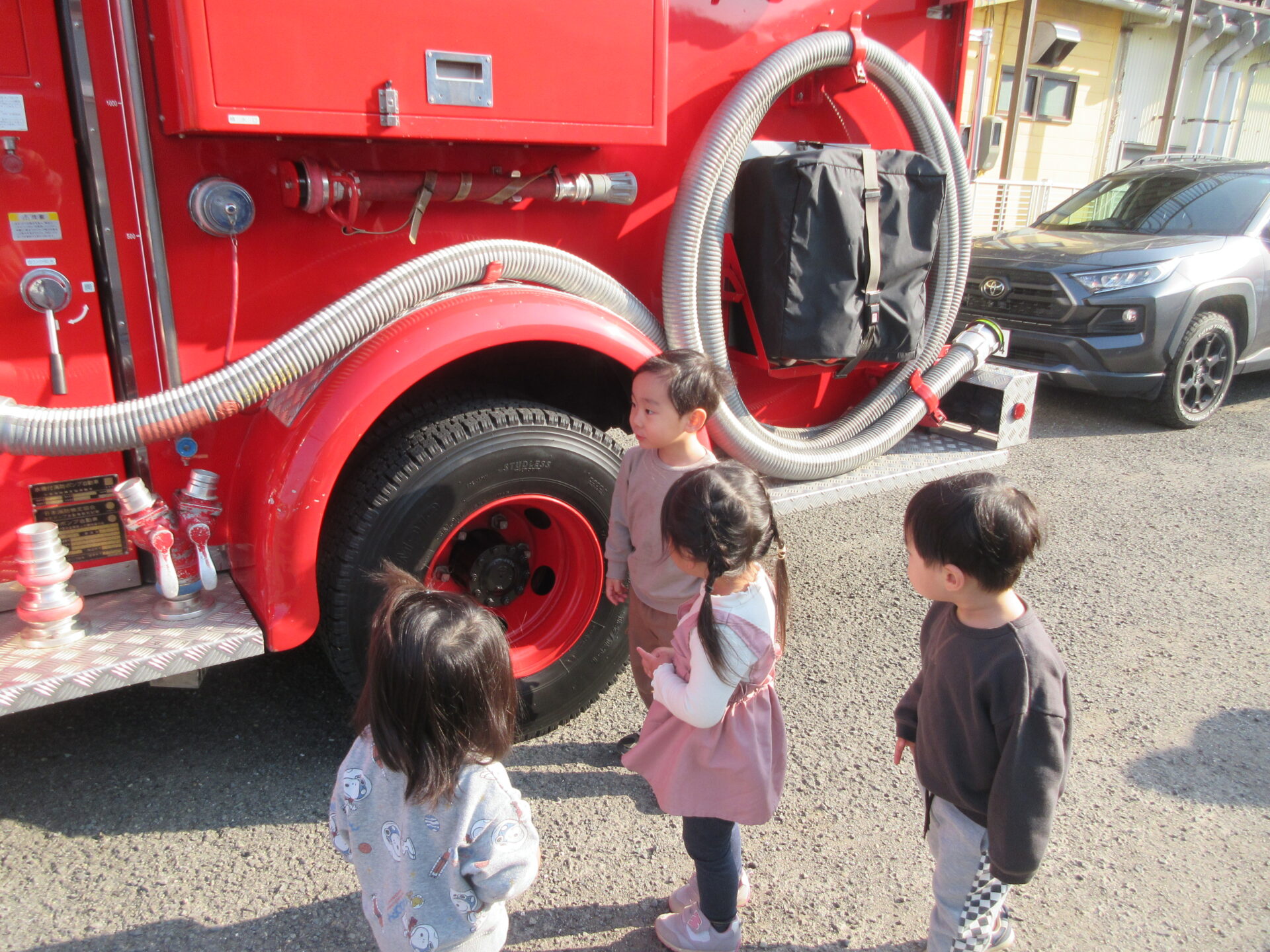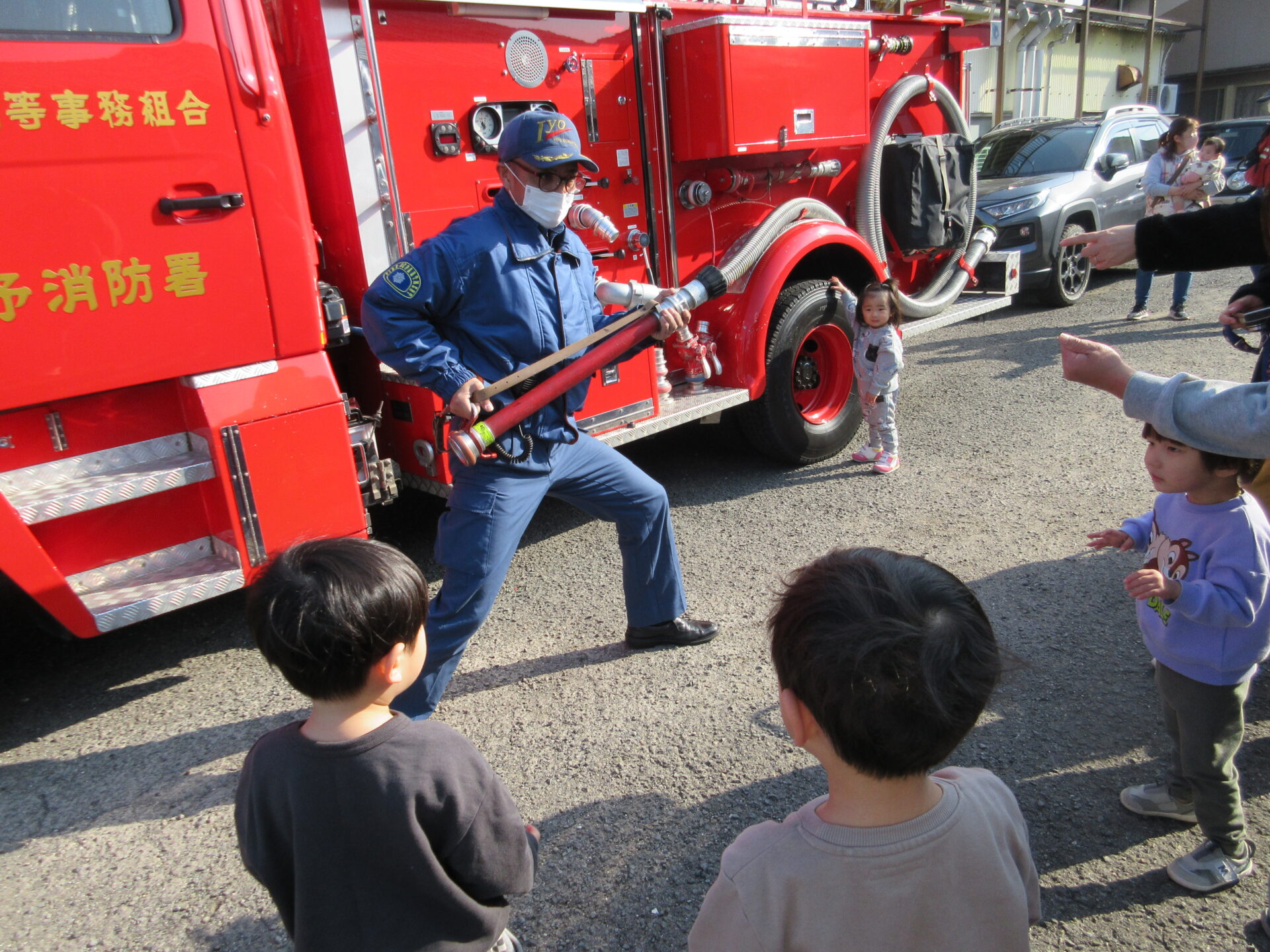 いつも窓越しに見ている消防車が、保育園にやって来てくれました。