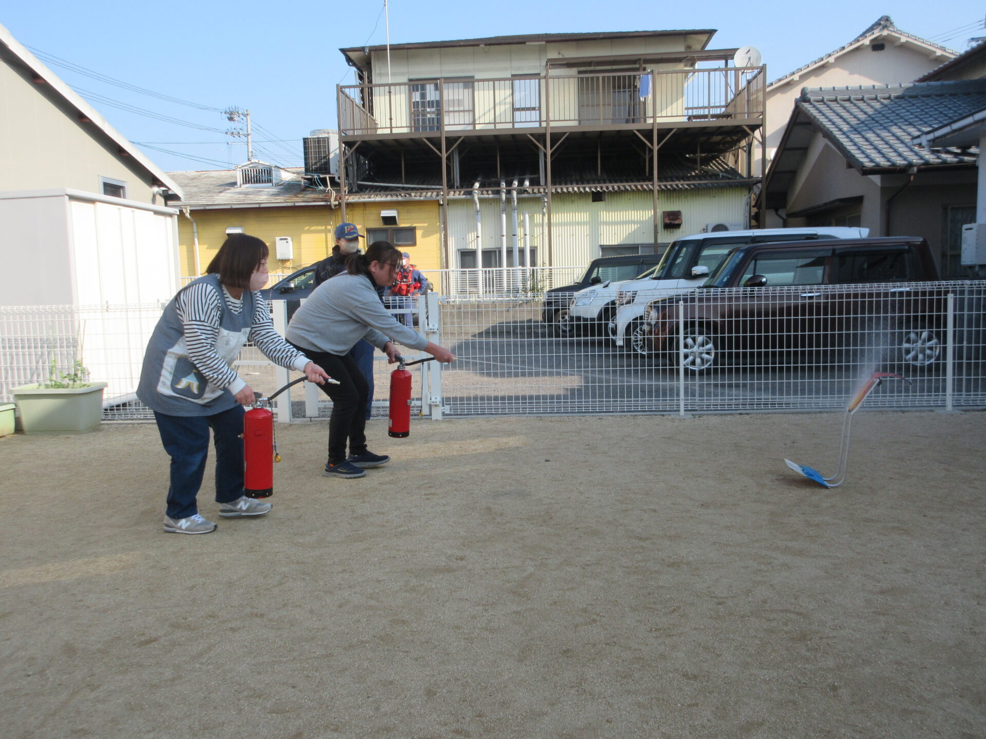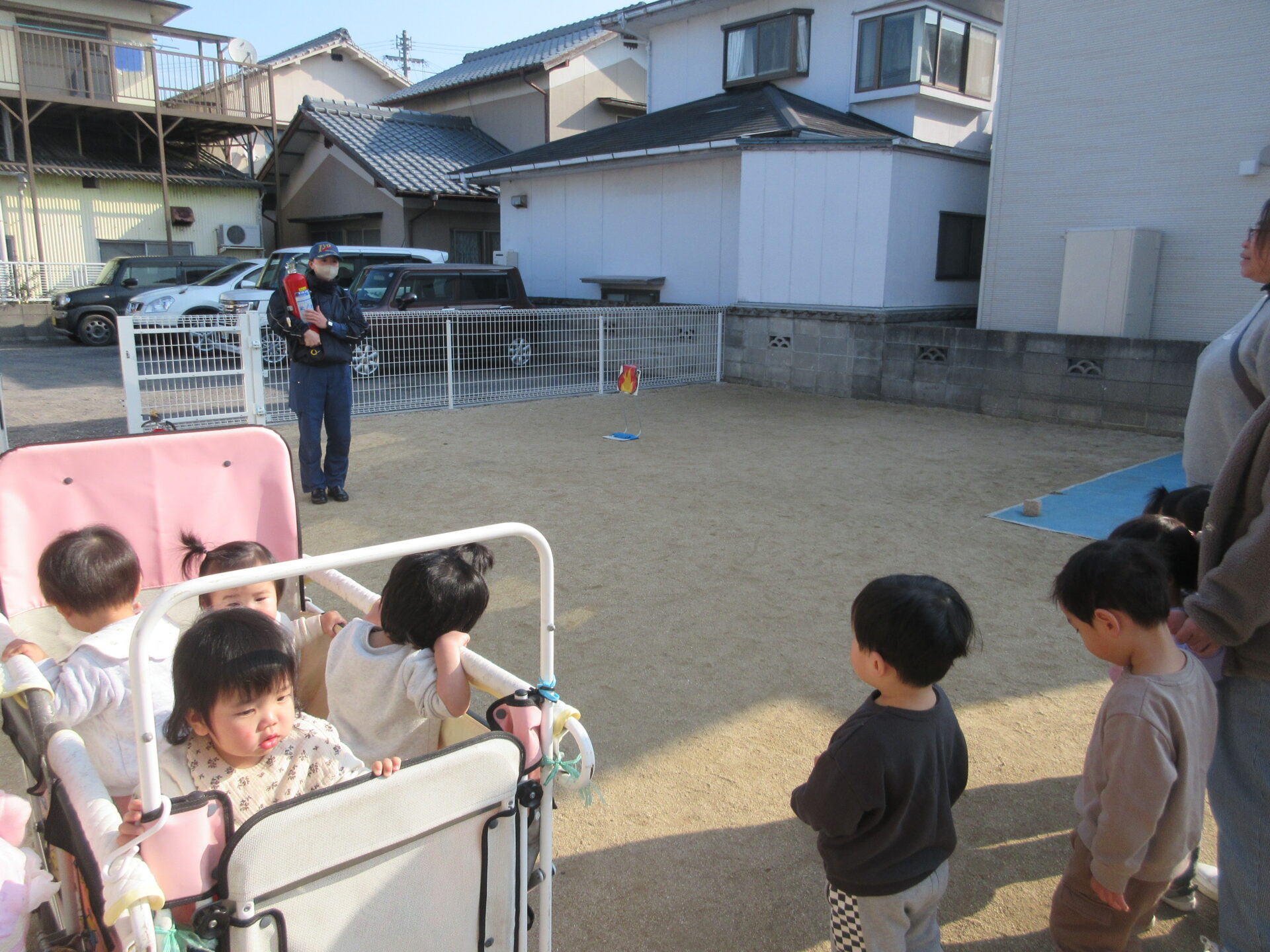 その後、園庭に行き、消火器の使い方を教えてもらい、保育士の消火訓練を見ました。
