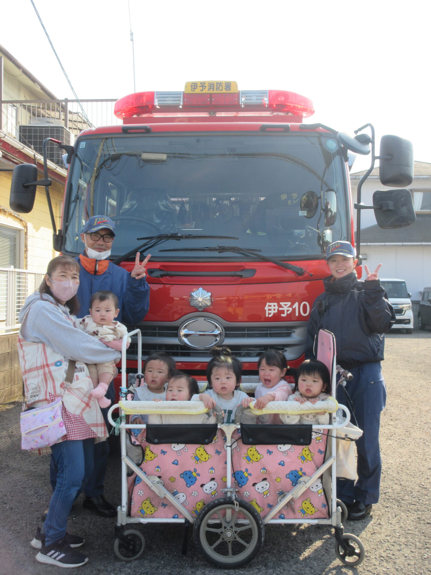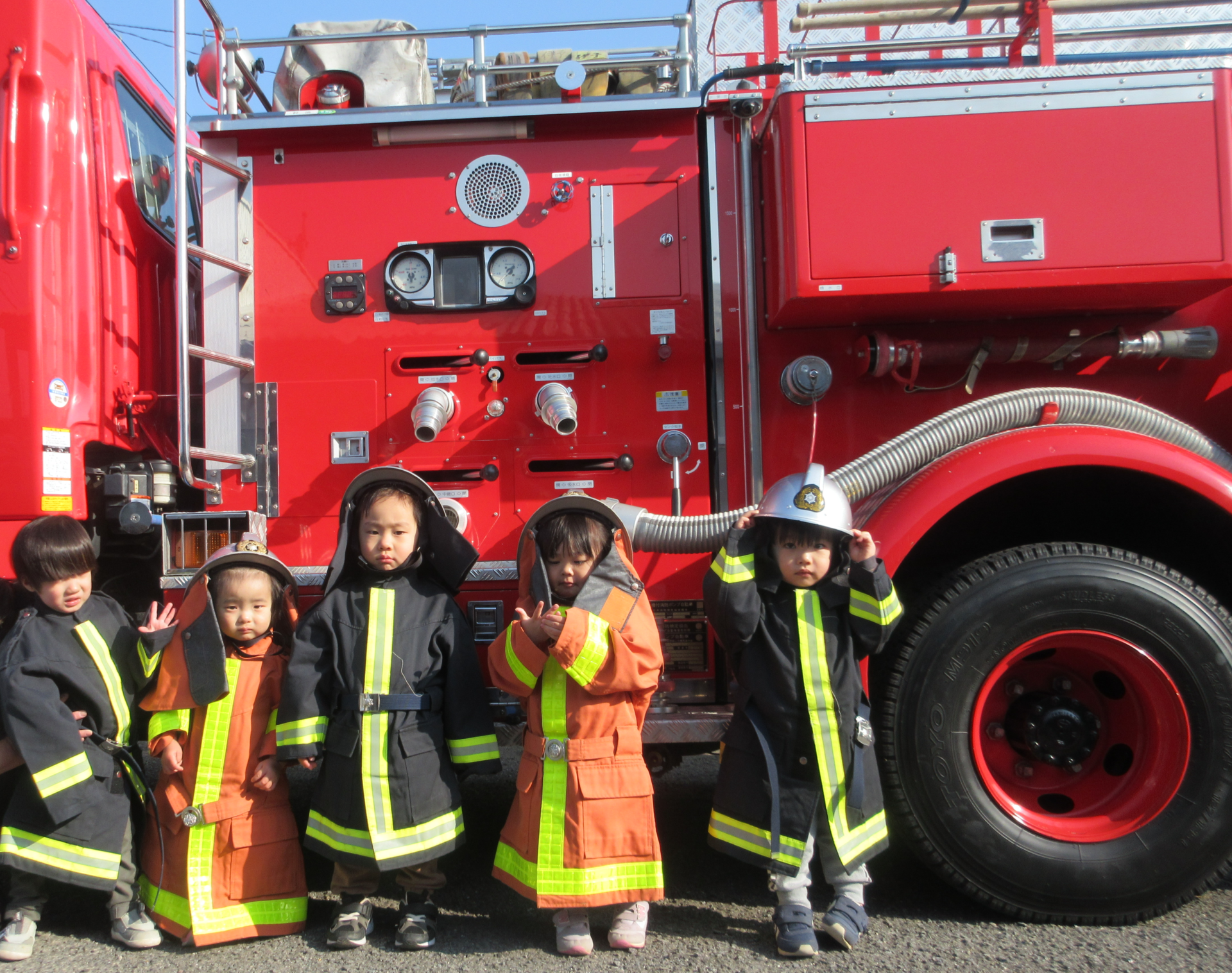 いつもと違って、消防士さんが見守る中での避難訓練で、子どもたちも泣いたり、保育士も緊張したりしましたが、消防車が見れて、とても良い思い出になりました。