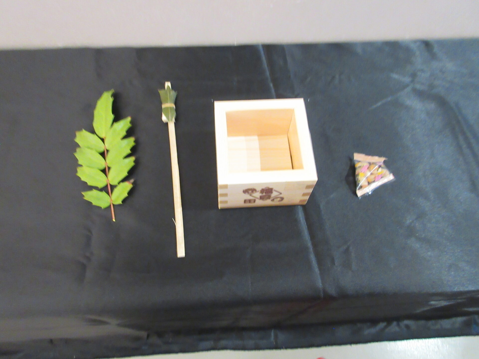 鬼の苦手な、豆まきの豆や、鬼ぐい、柊の葉っぱ、いわしなど、本物を実際に見たり触ったり、臭ったりしました。