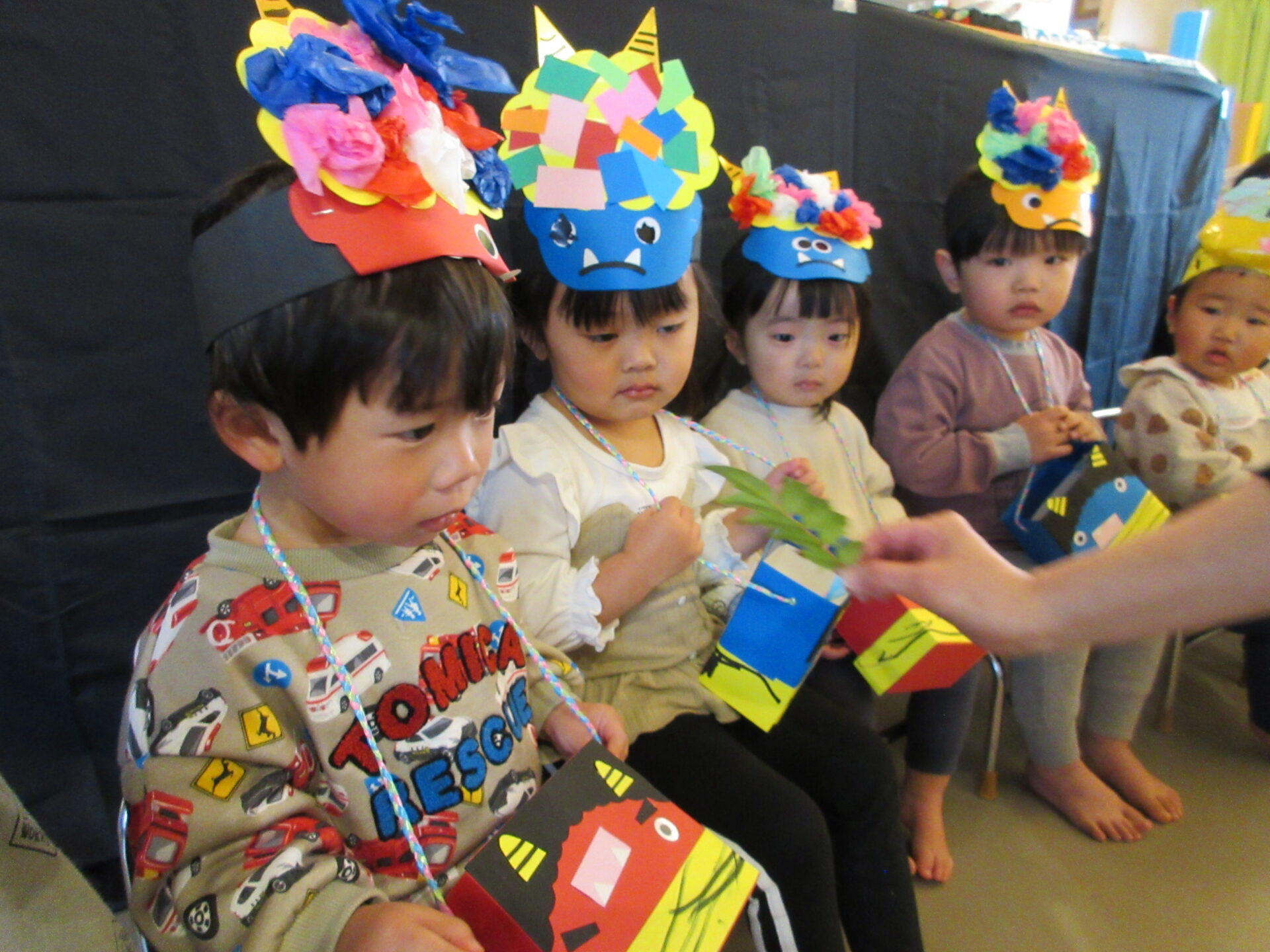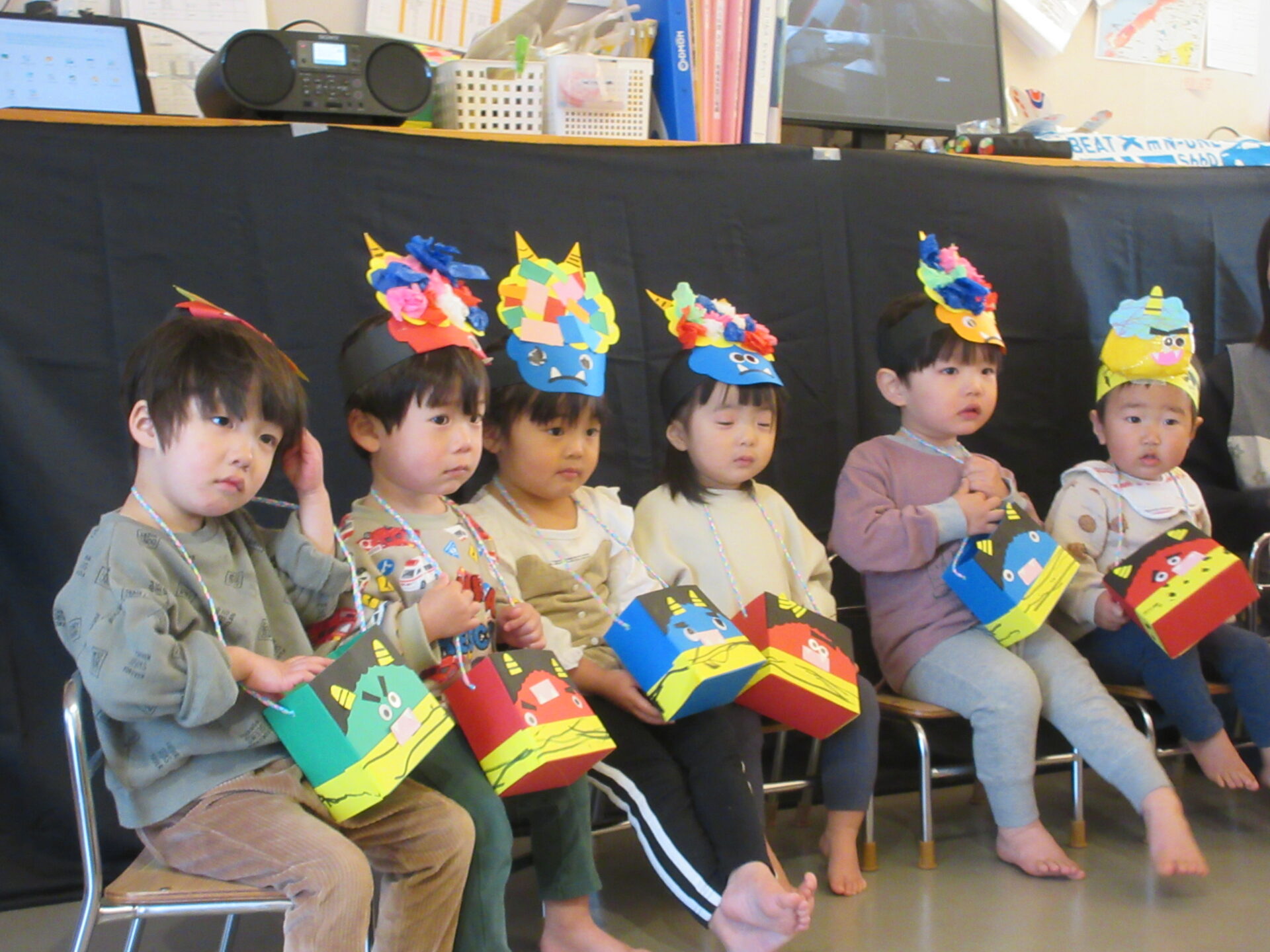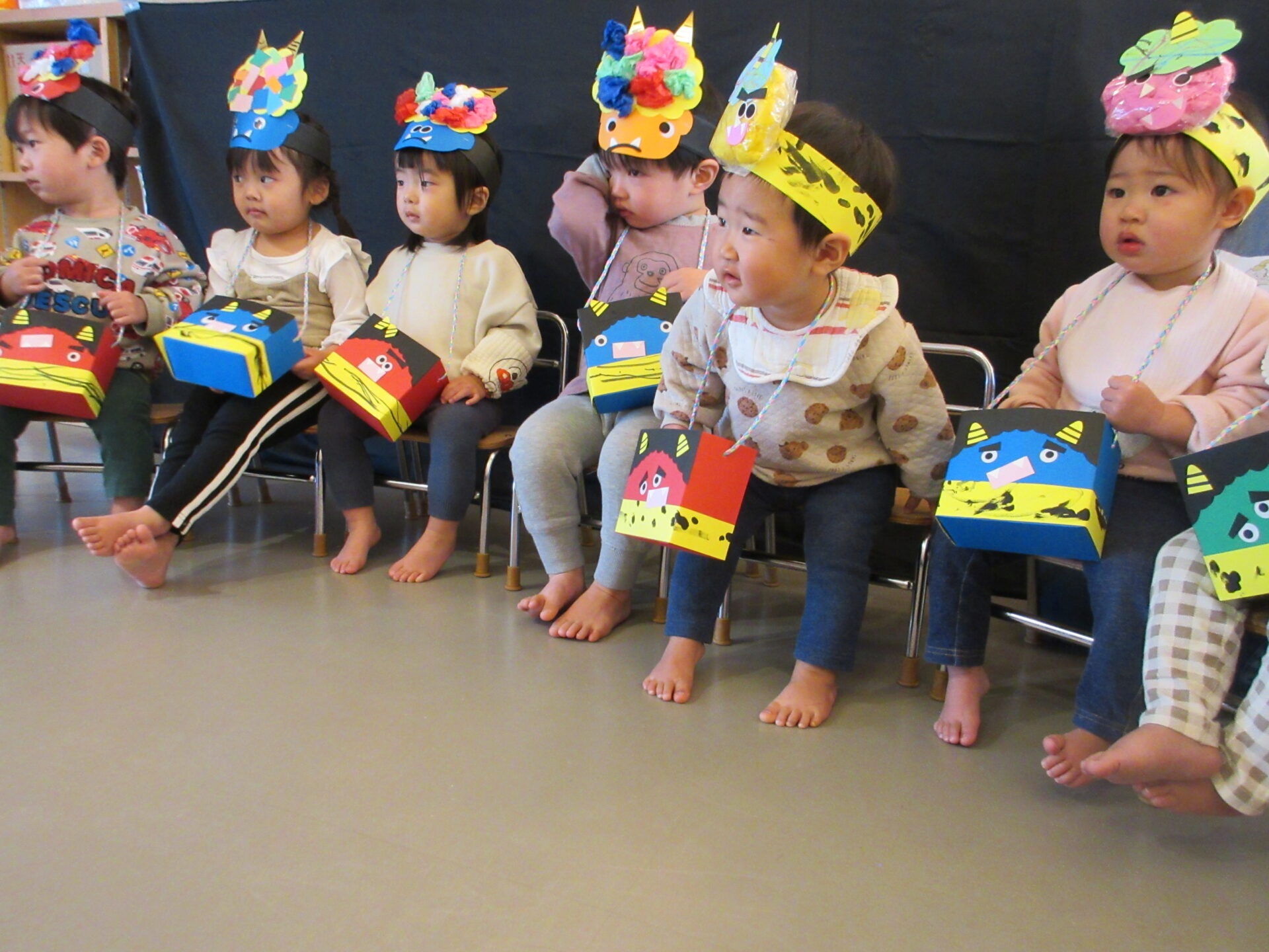 自分たちで作った鬼のお面と豆入れを付けてみんなで集まり、節分の話を真剣に聞きました。