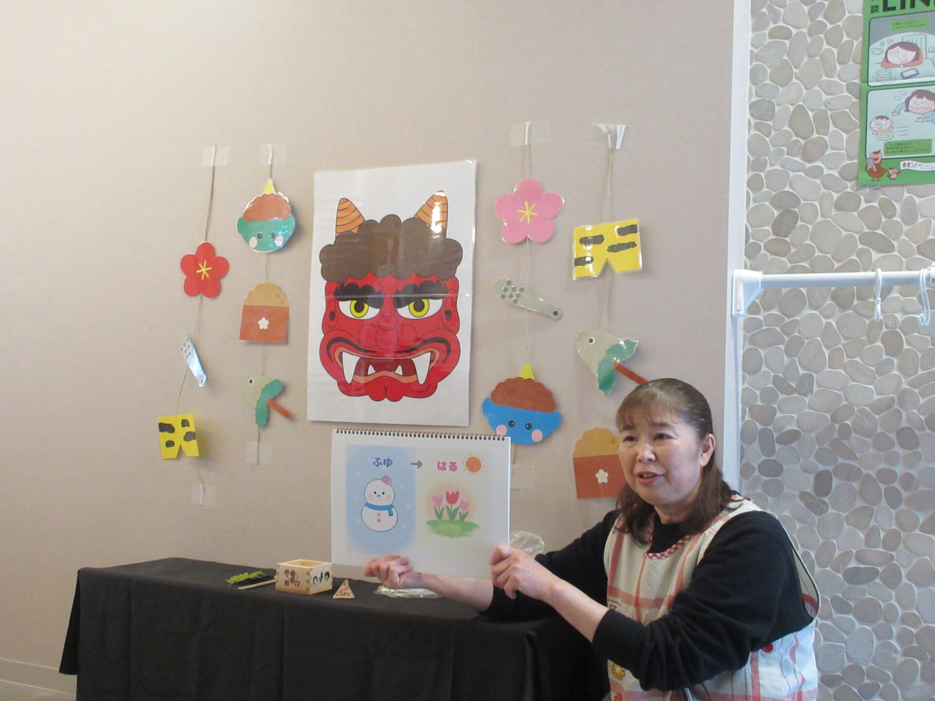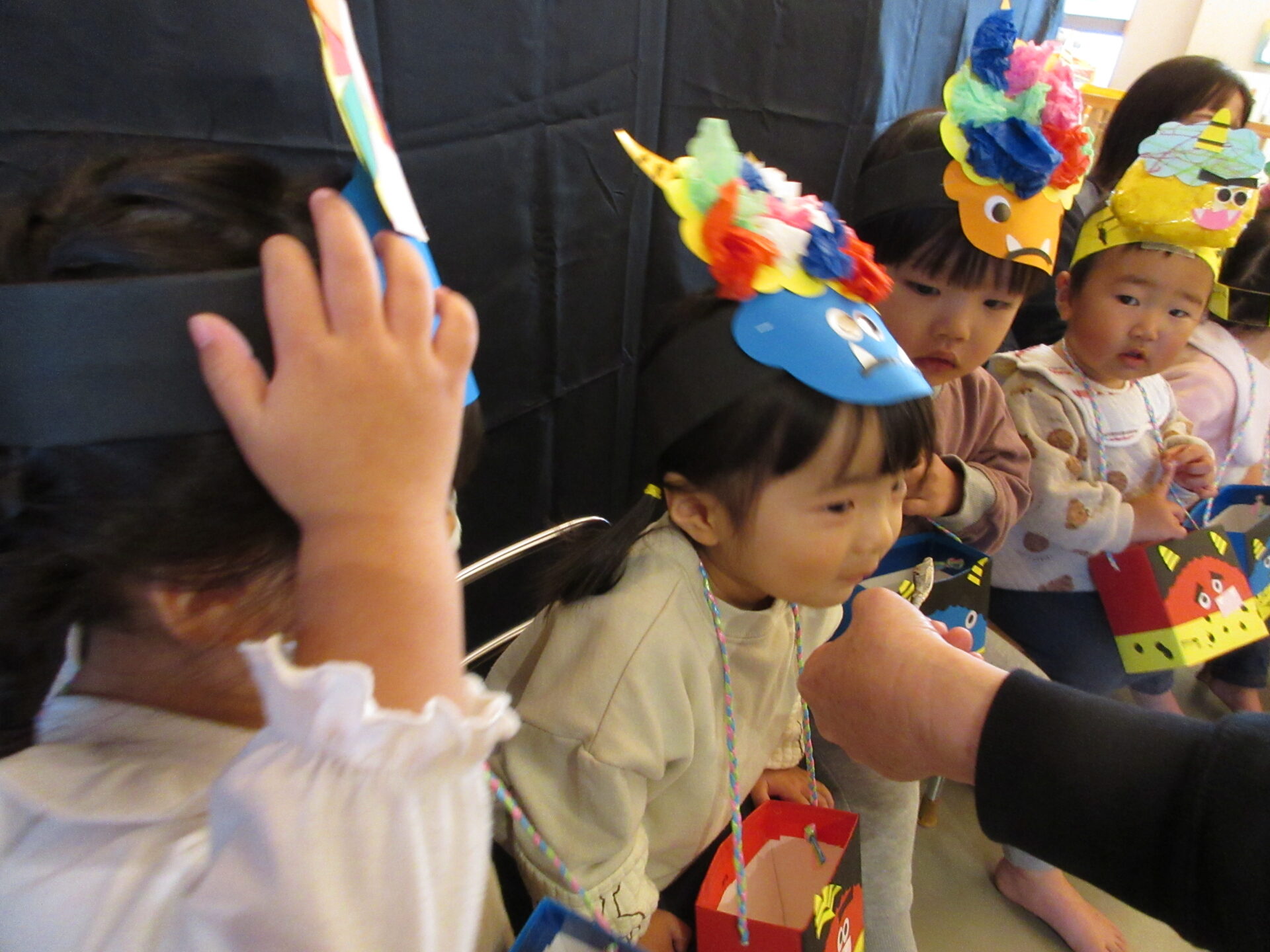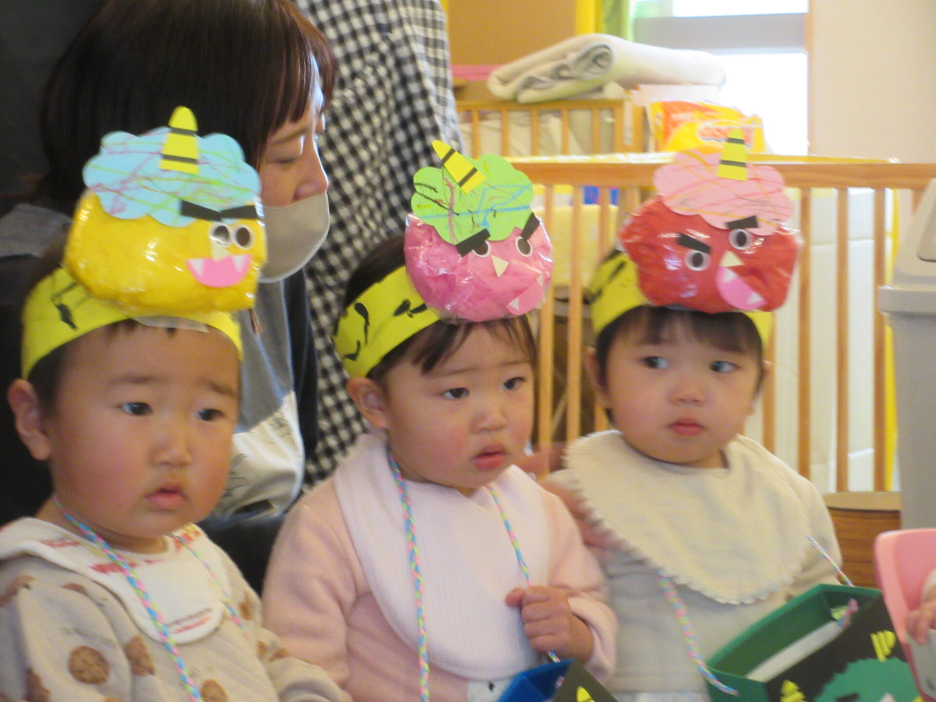 自分たちで作った鬼のお面と豆入れを付けてみんなで集まり、節分の話を真剣に聞きました。