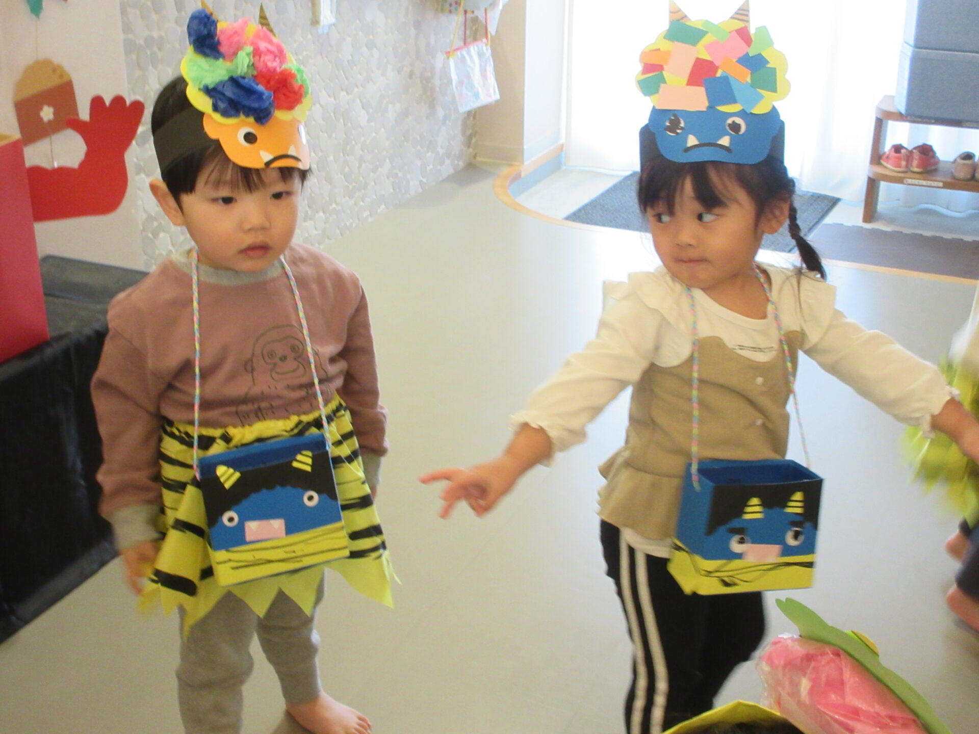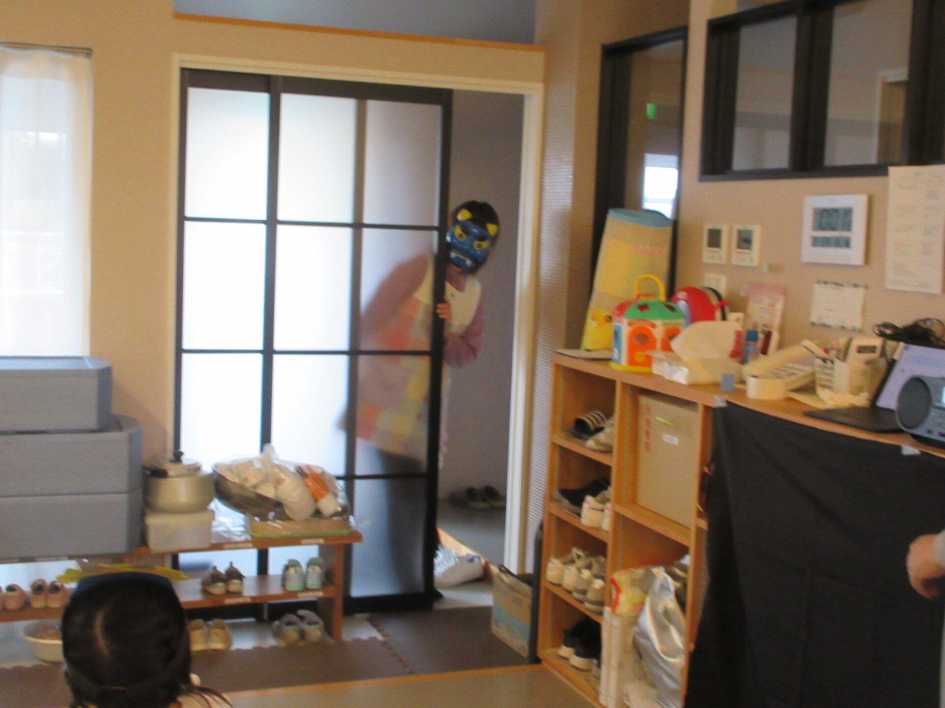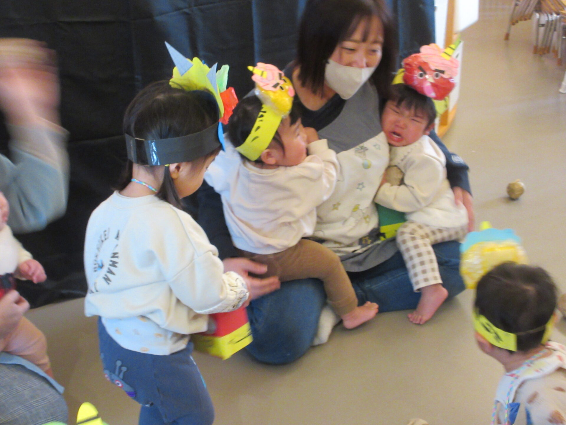 前もって、「先生が鬼になるよ!」と伝えていたものの、実際に入ってくると泣き出したり、先生のところに避難するお友だちも・・・😫