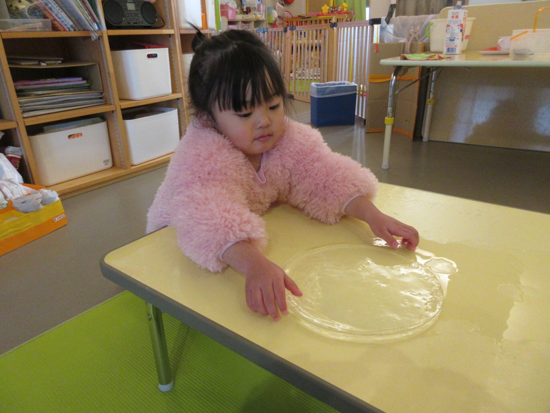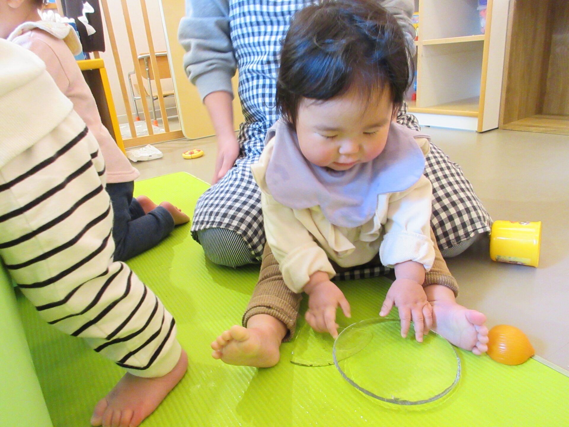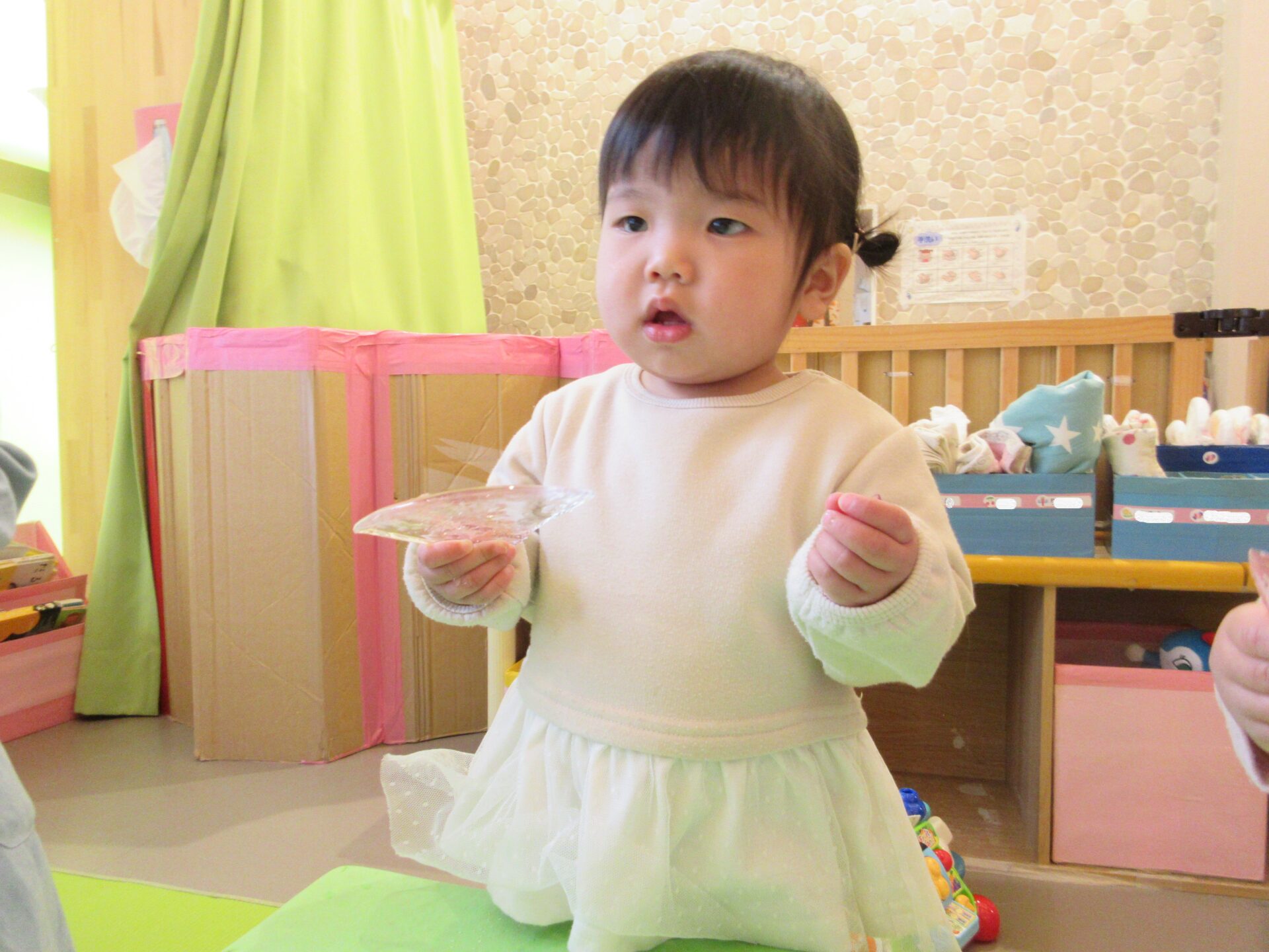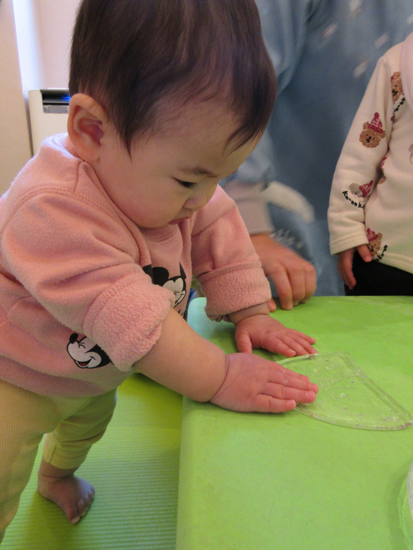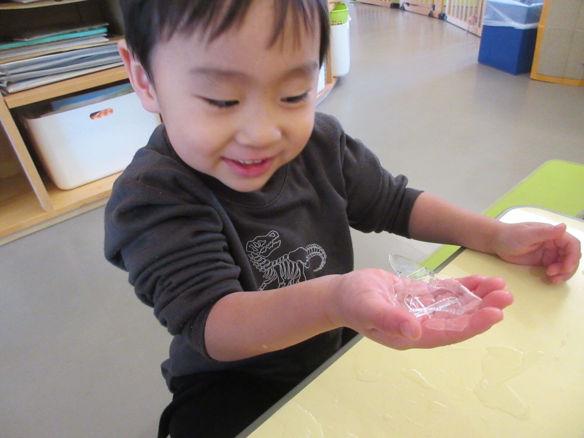 1,2歳児の子どもたちは、氷を滑らせたり、氷を持って向こう側をのぞいたりして、楽しんでいました。