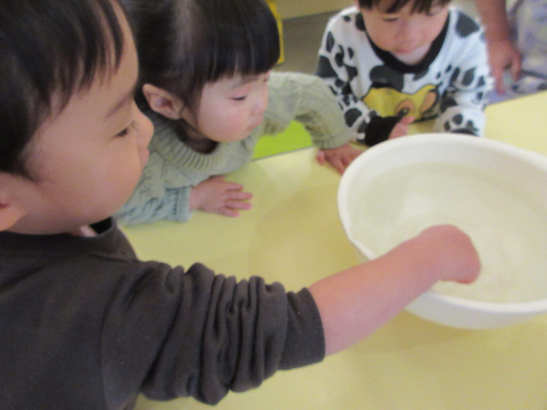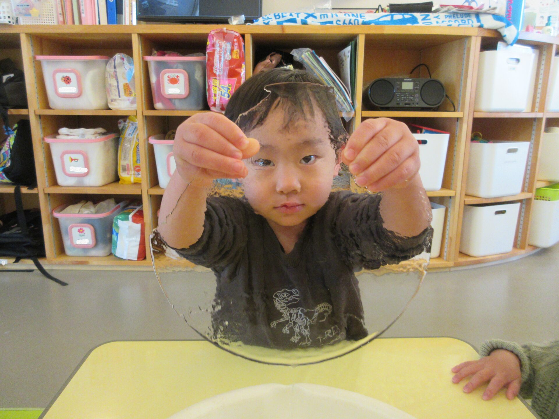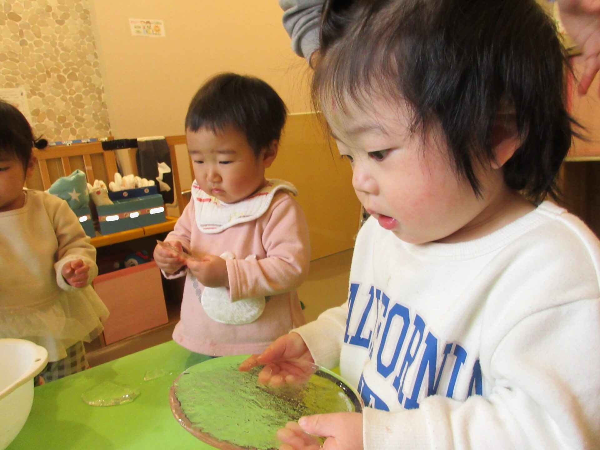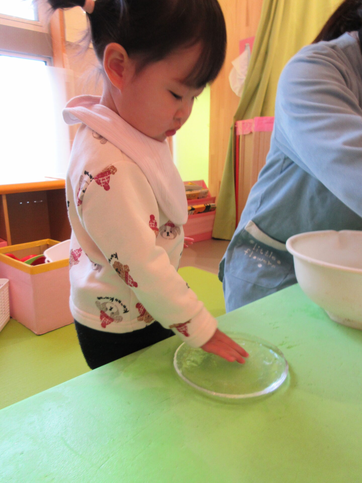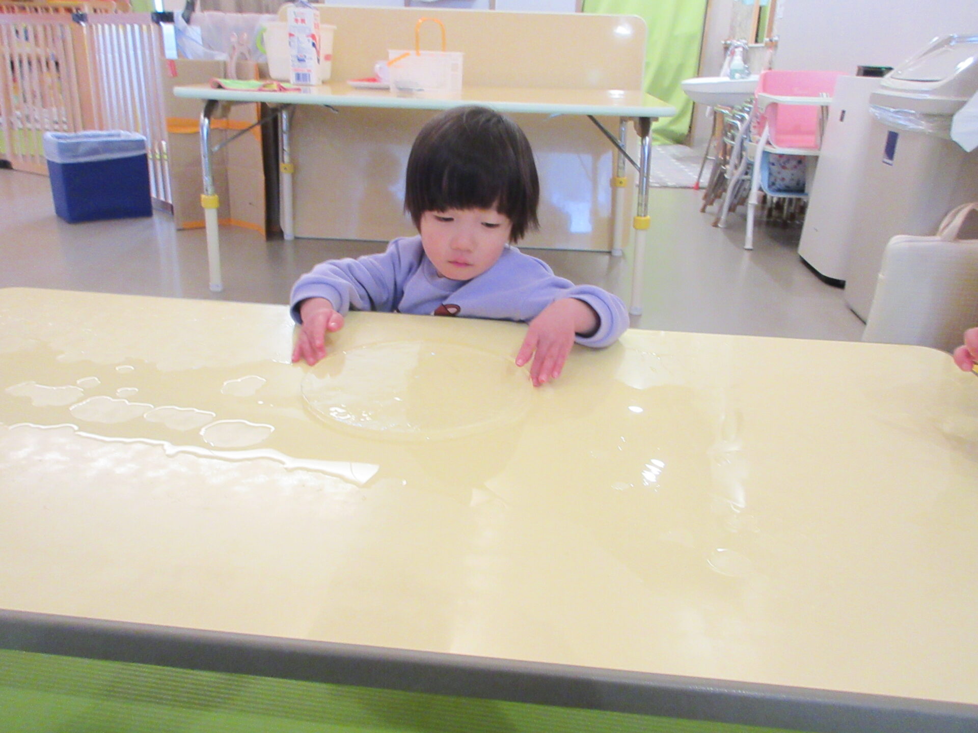 1,2歳児の子どもたちは、氷を滑らせたり、氷を持って向こう側をのぞいたりして、楽しんでいました。
