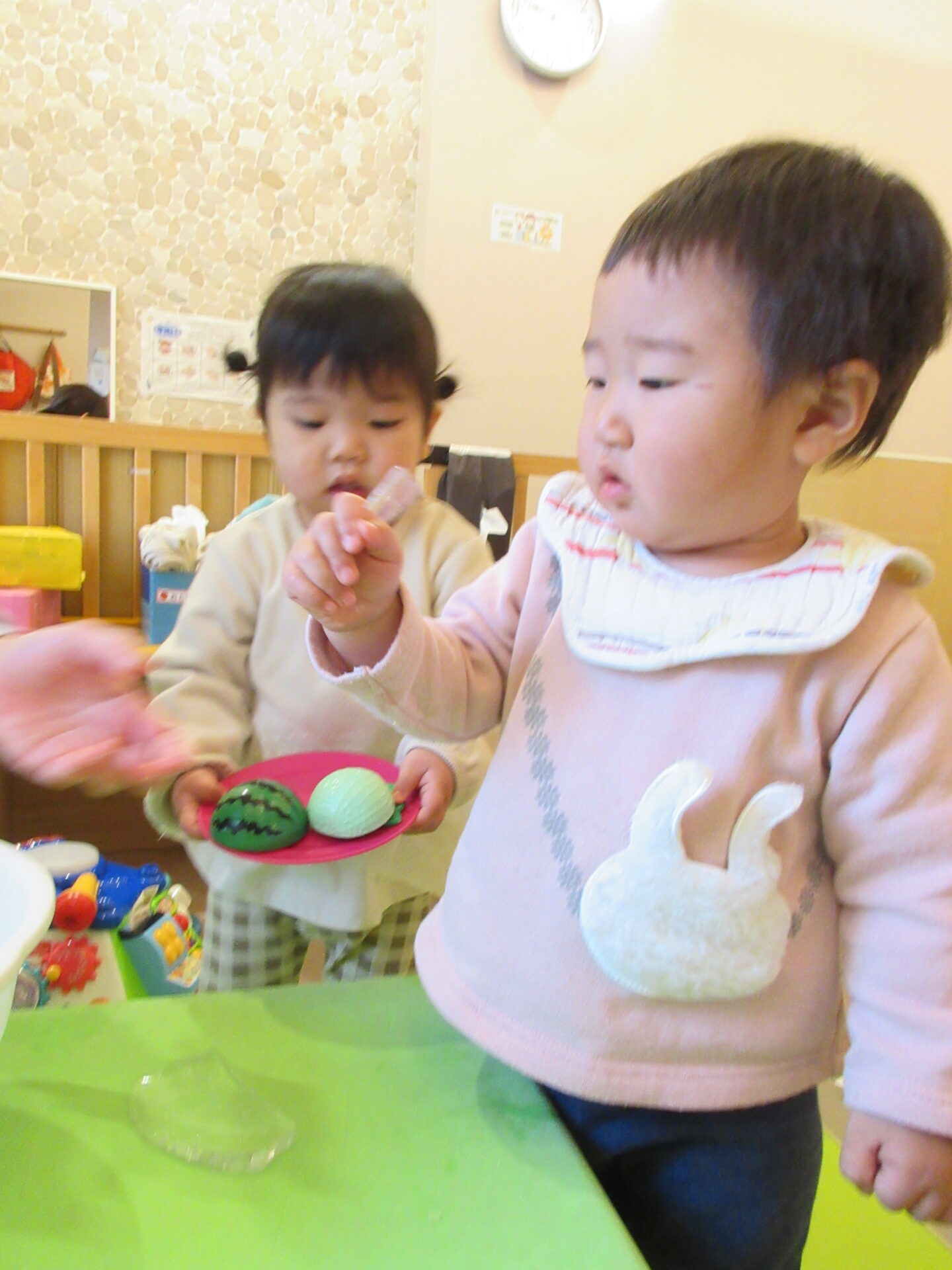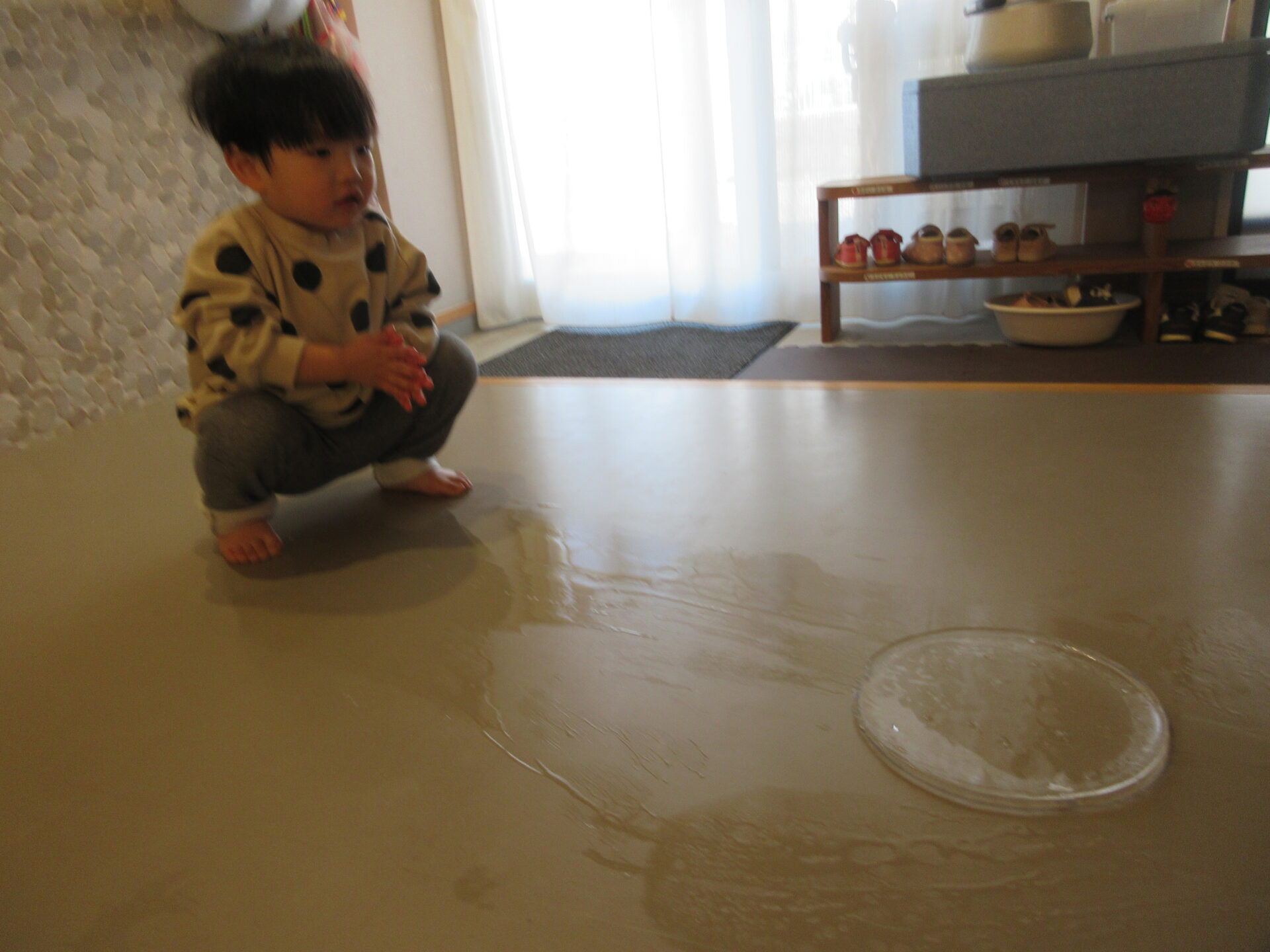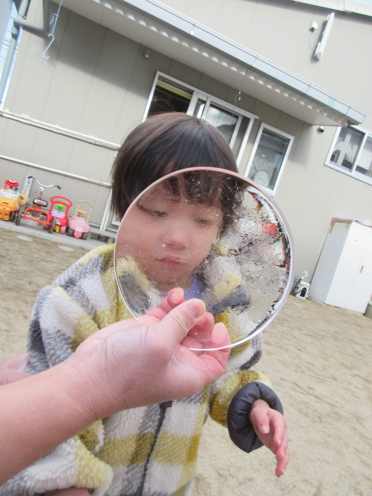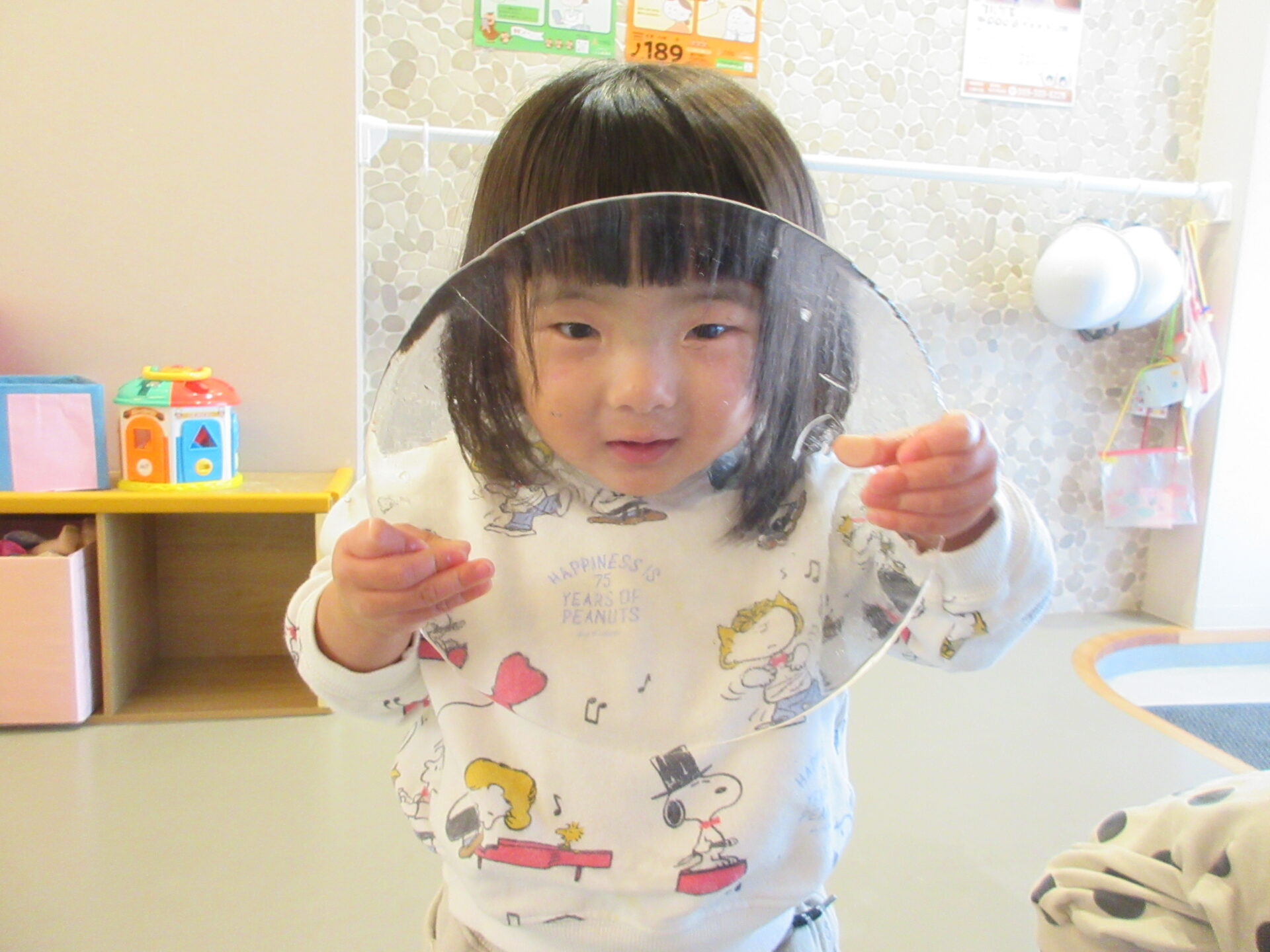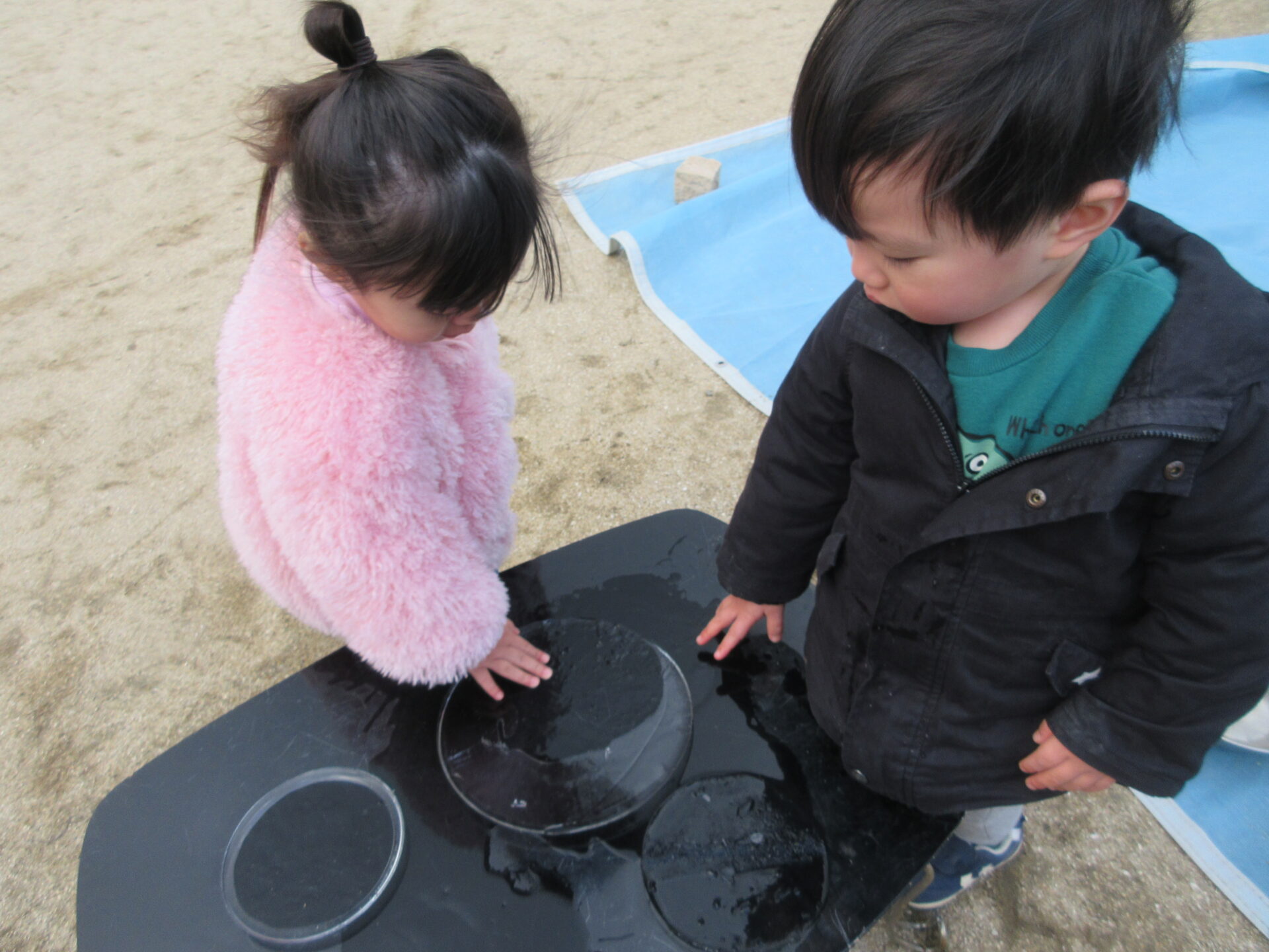 1,2歳児の子どもたちは、氷を滑らせたり、氷を持って向こう側をのぞいたりして、楽しんでいました。
