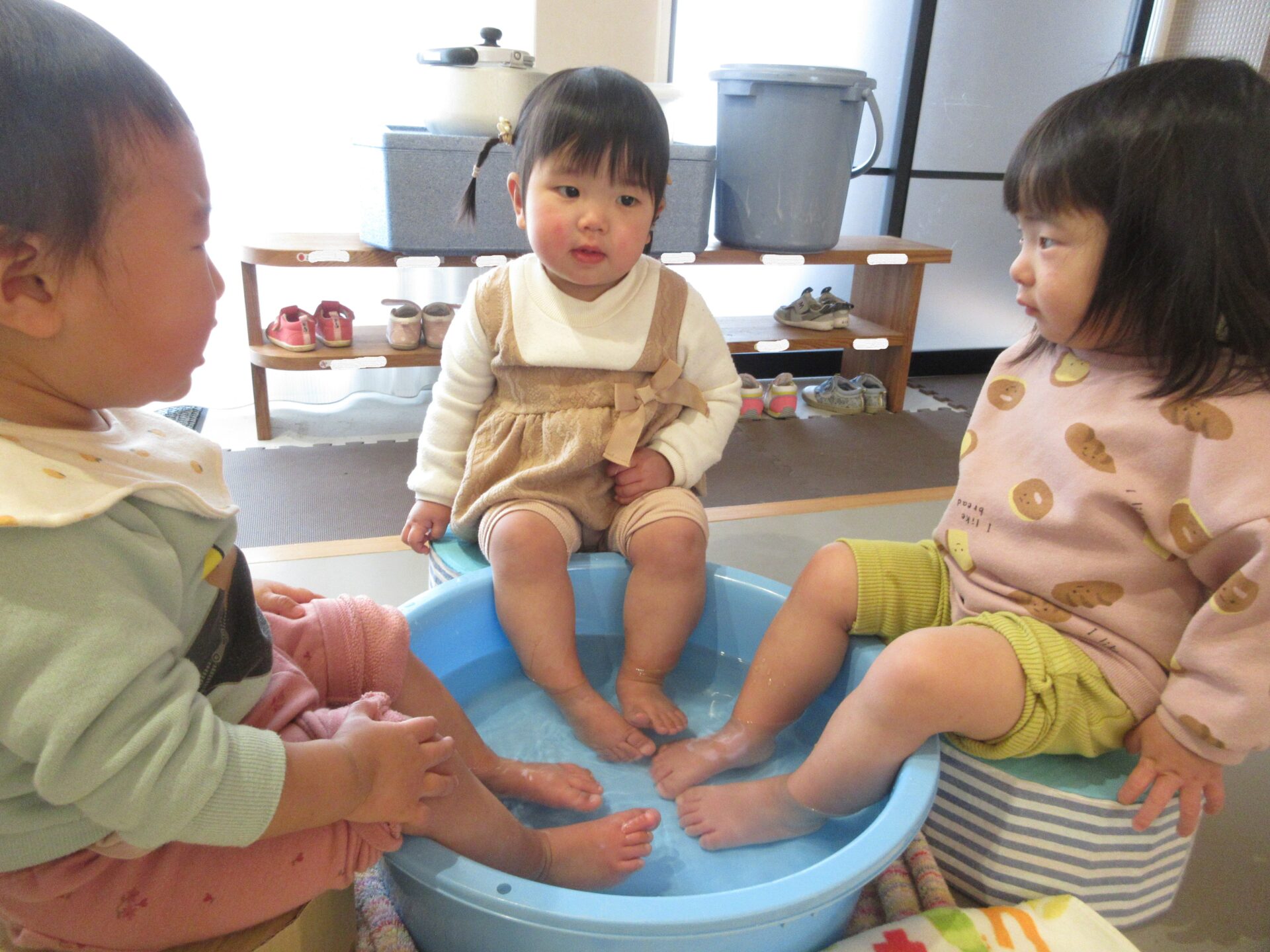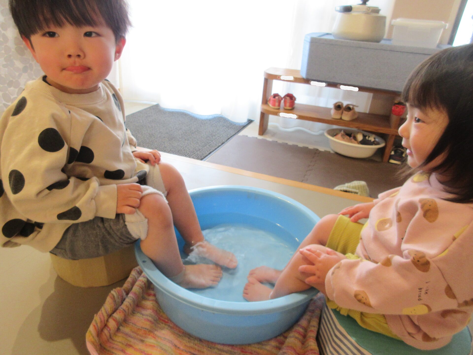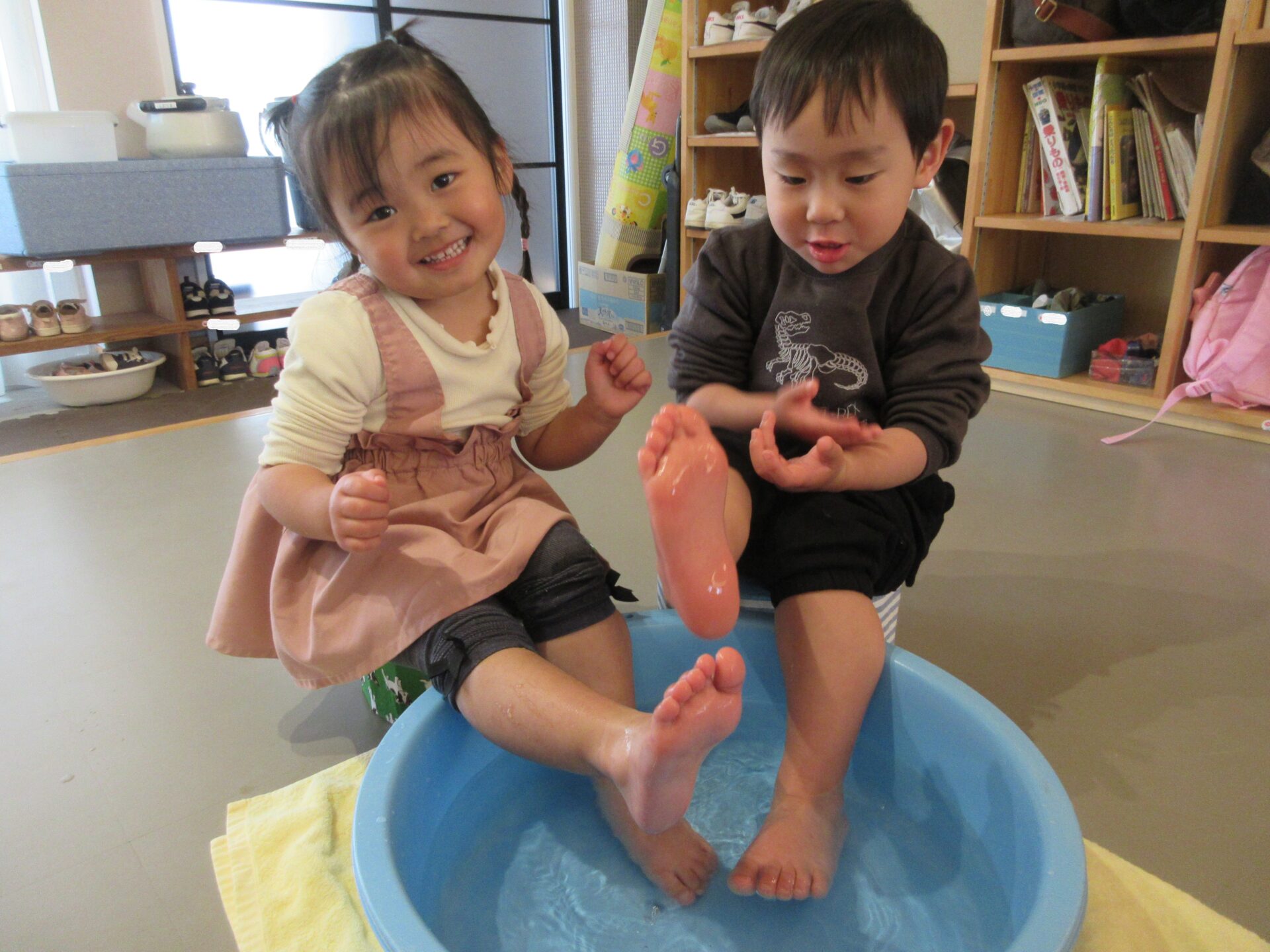 氷を触って遊んだ手が冷たくなり、体が冷えたので、タライにお湯を入れて、みんなで足湯をして体を温めました。