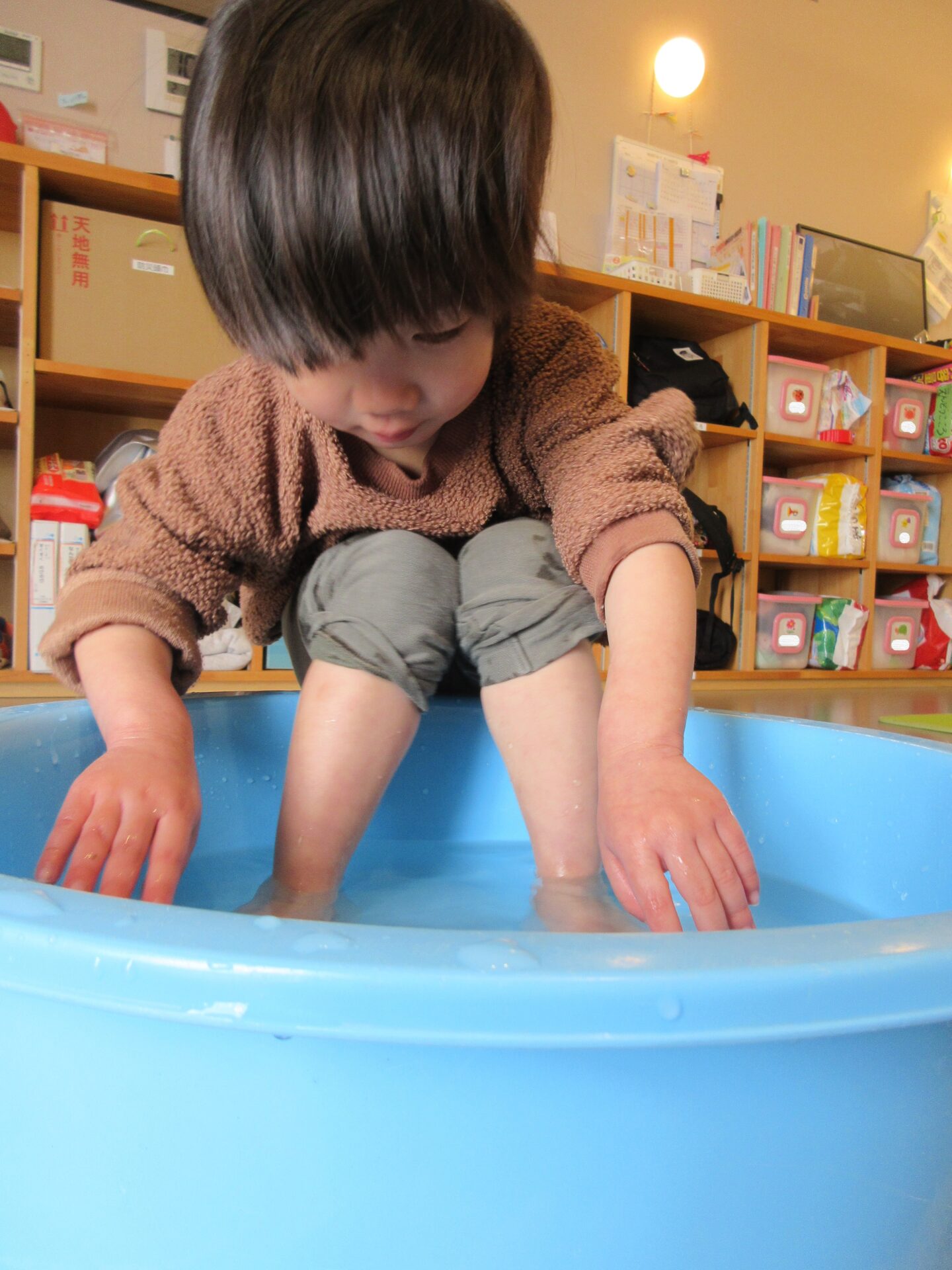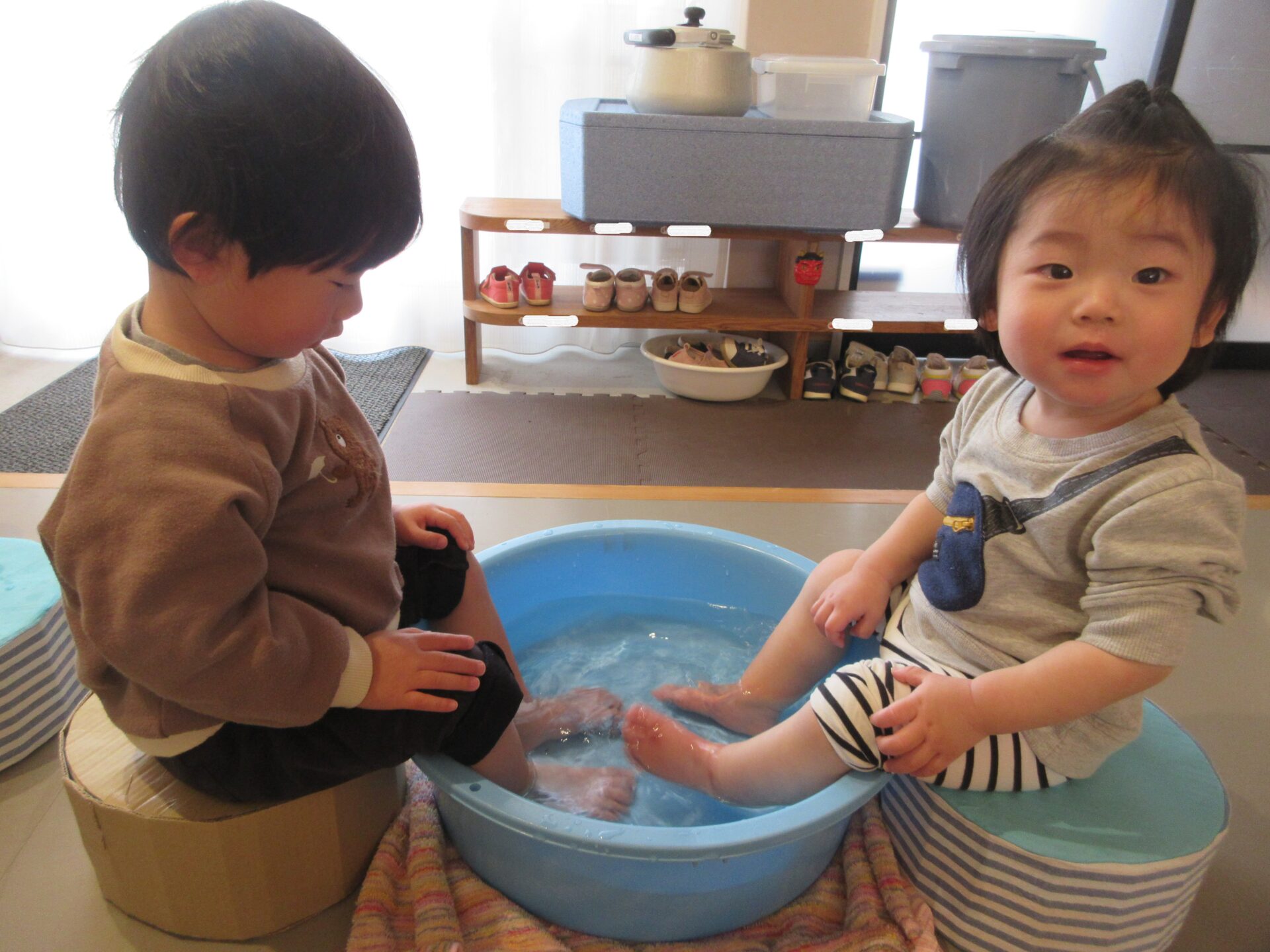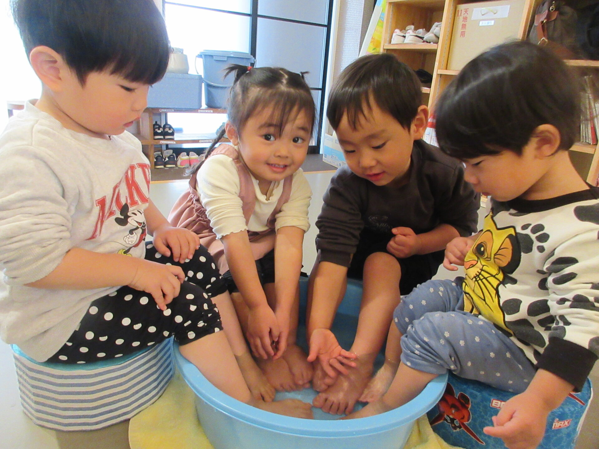 氷を触って遊んだ手が冷たくなり、体が冷えたので、タライにお湯を入れて、みんなで足湯をして体を温めました。