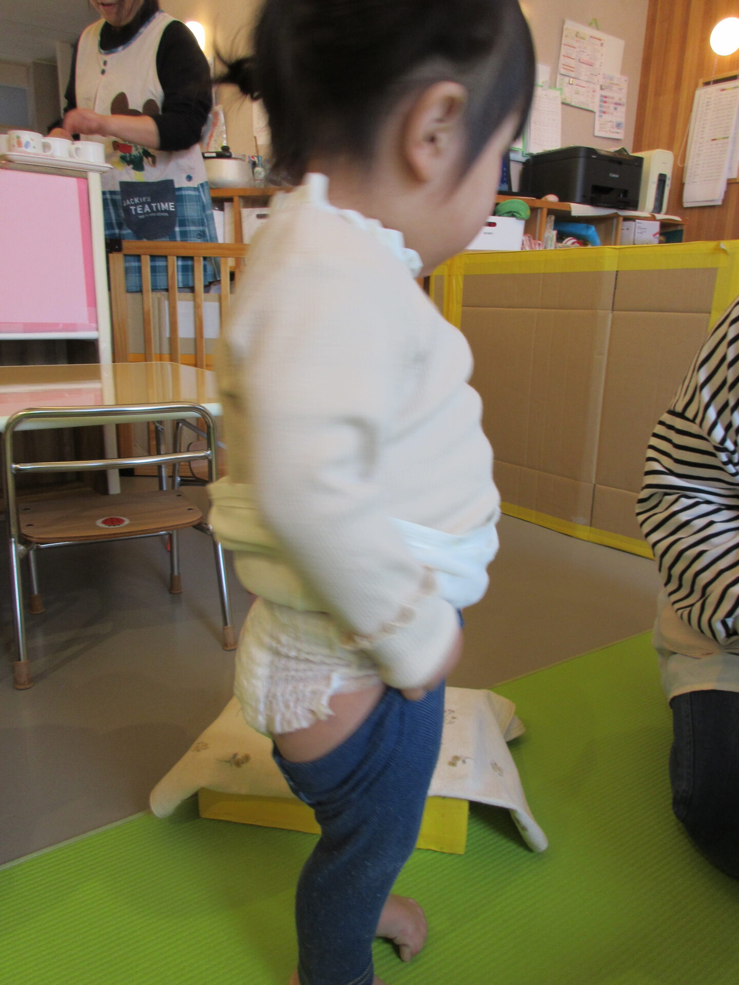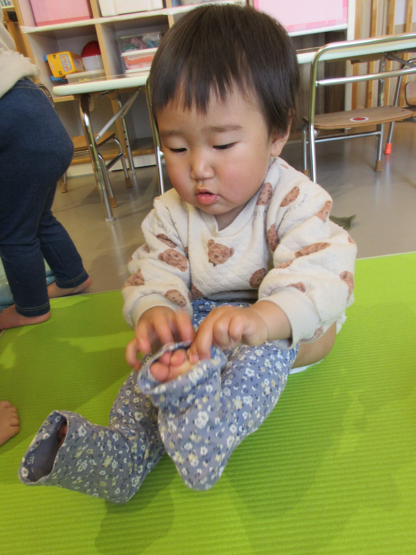 月齢が大きい子たちは、オムツやズボンの着脱ができるようになってきました。