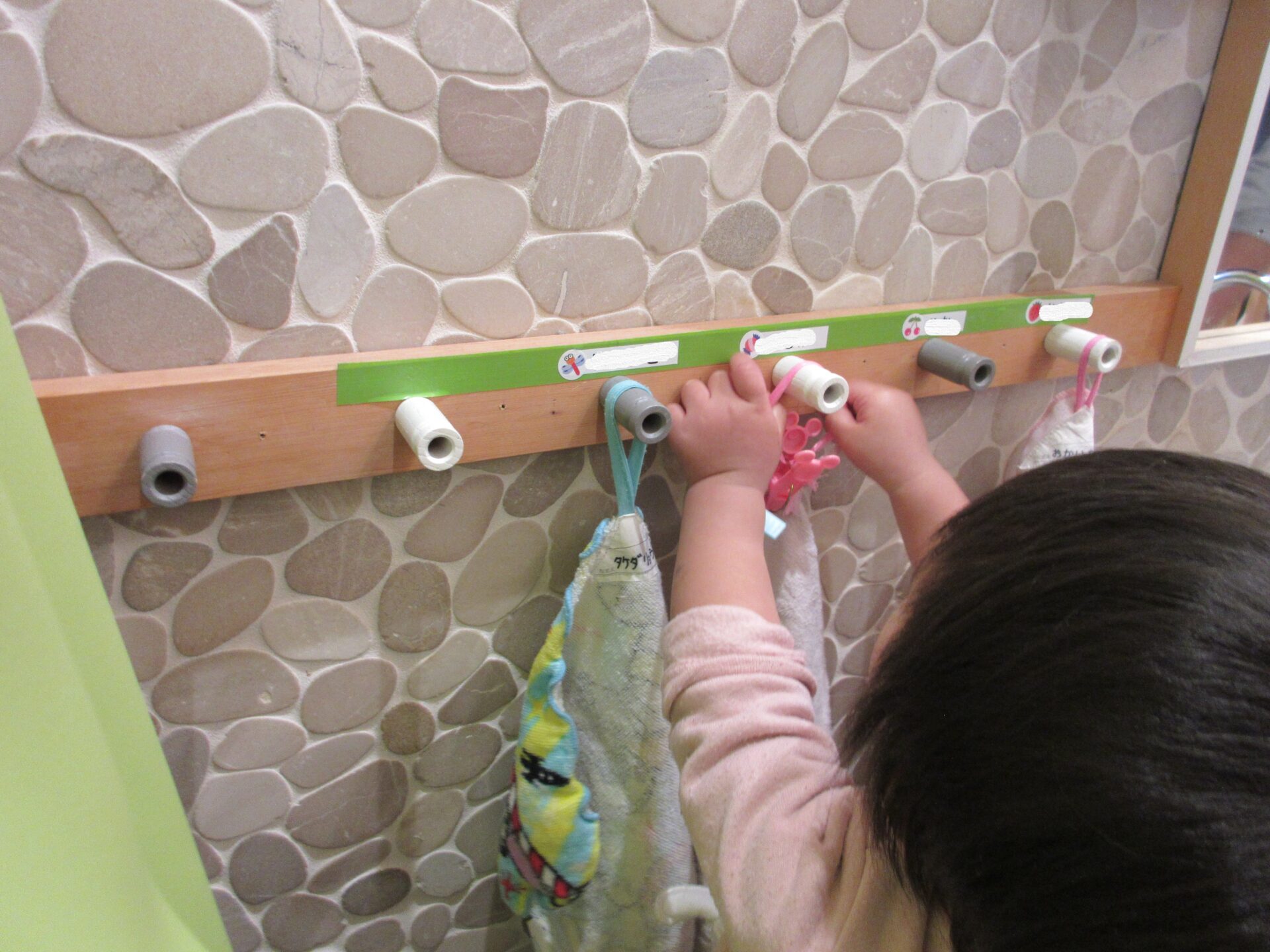 最近では、「手を洗いに行くよ」と声をかけると、自然に袖を腕まくりして、手洗い場まで来るようになったり、タオルを自分でかけに行ったりすることができるようになりました。
