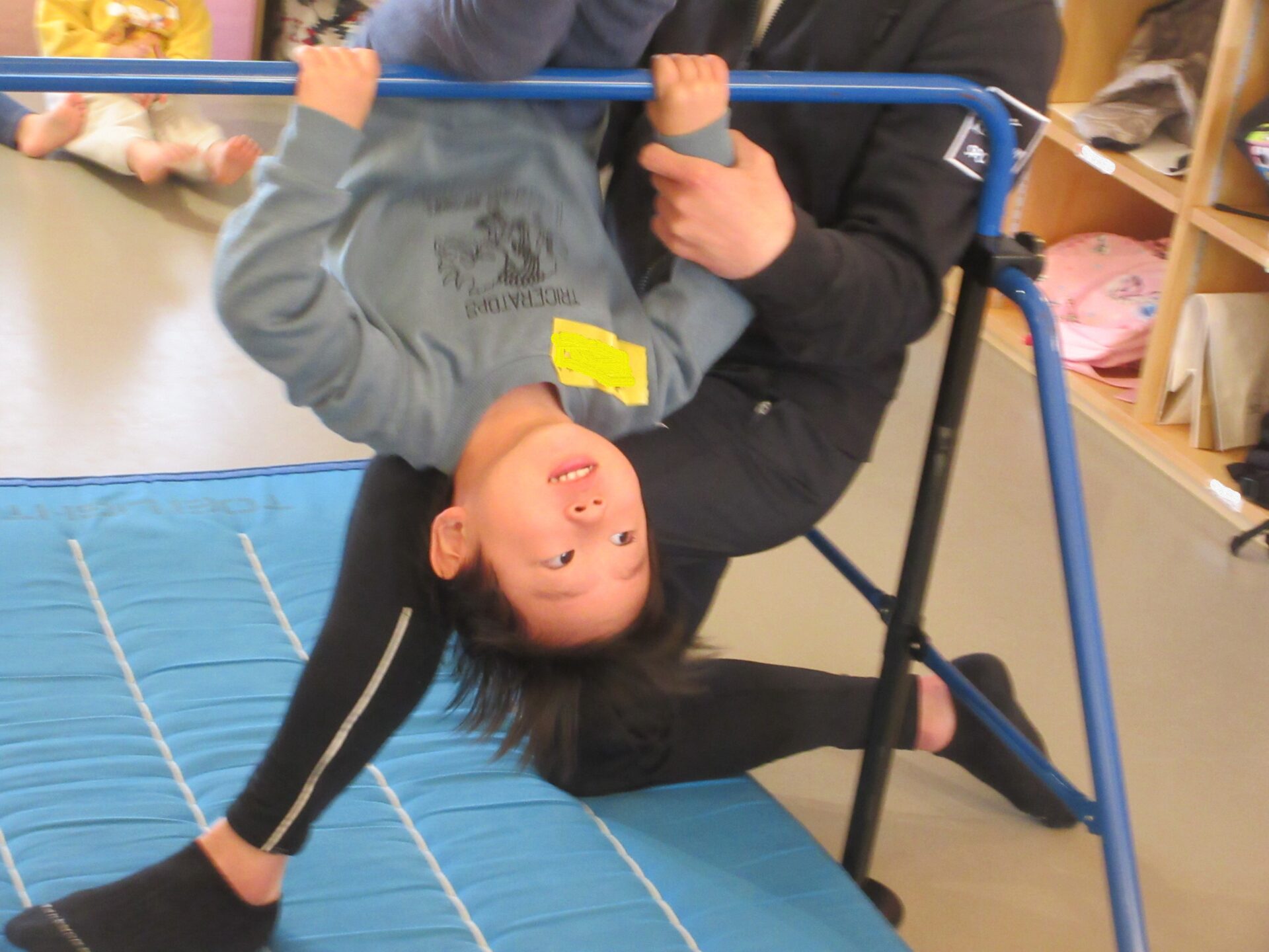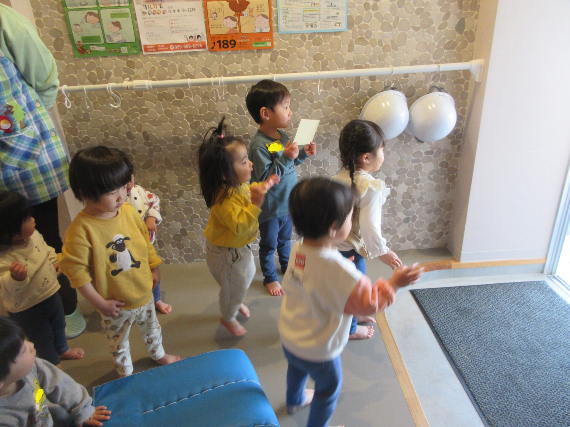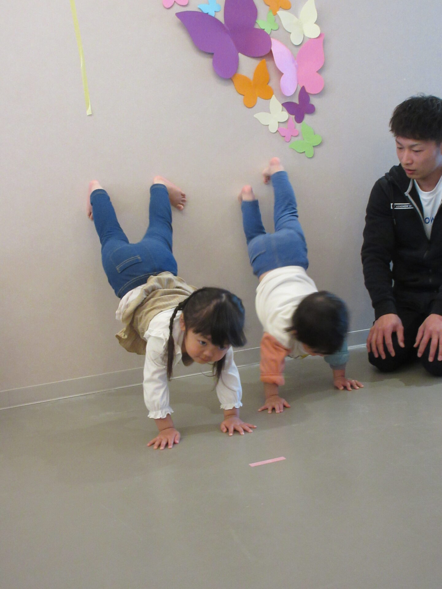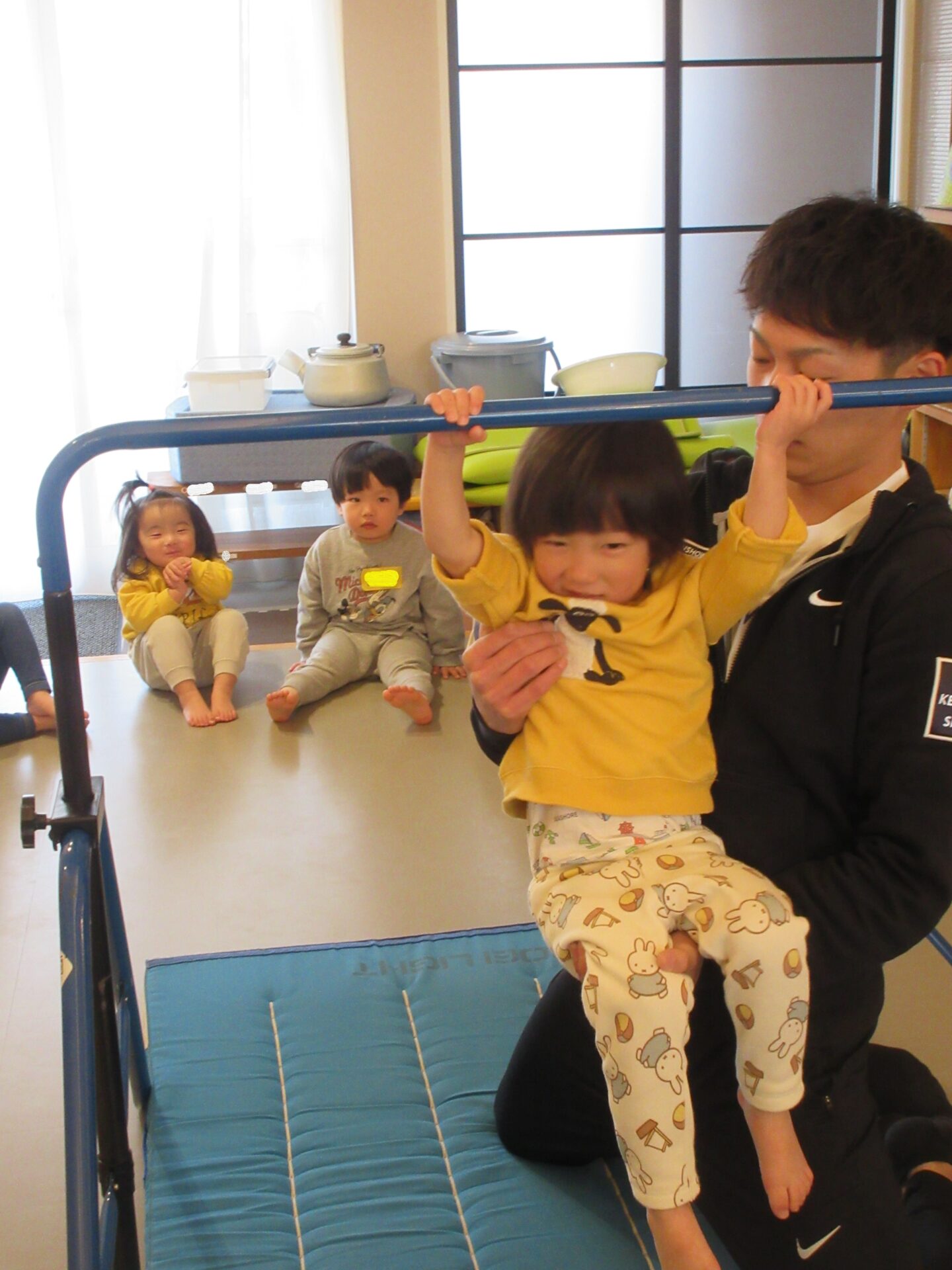 しかし、1.2歳児合同での体操教室になると、まんぼう組の子どもたちは、がんばりを見せて、そら組さんの良いお手本となりました。
