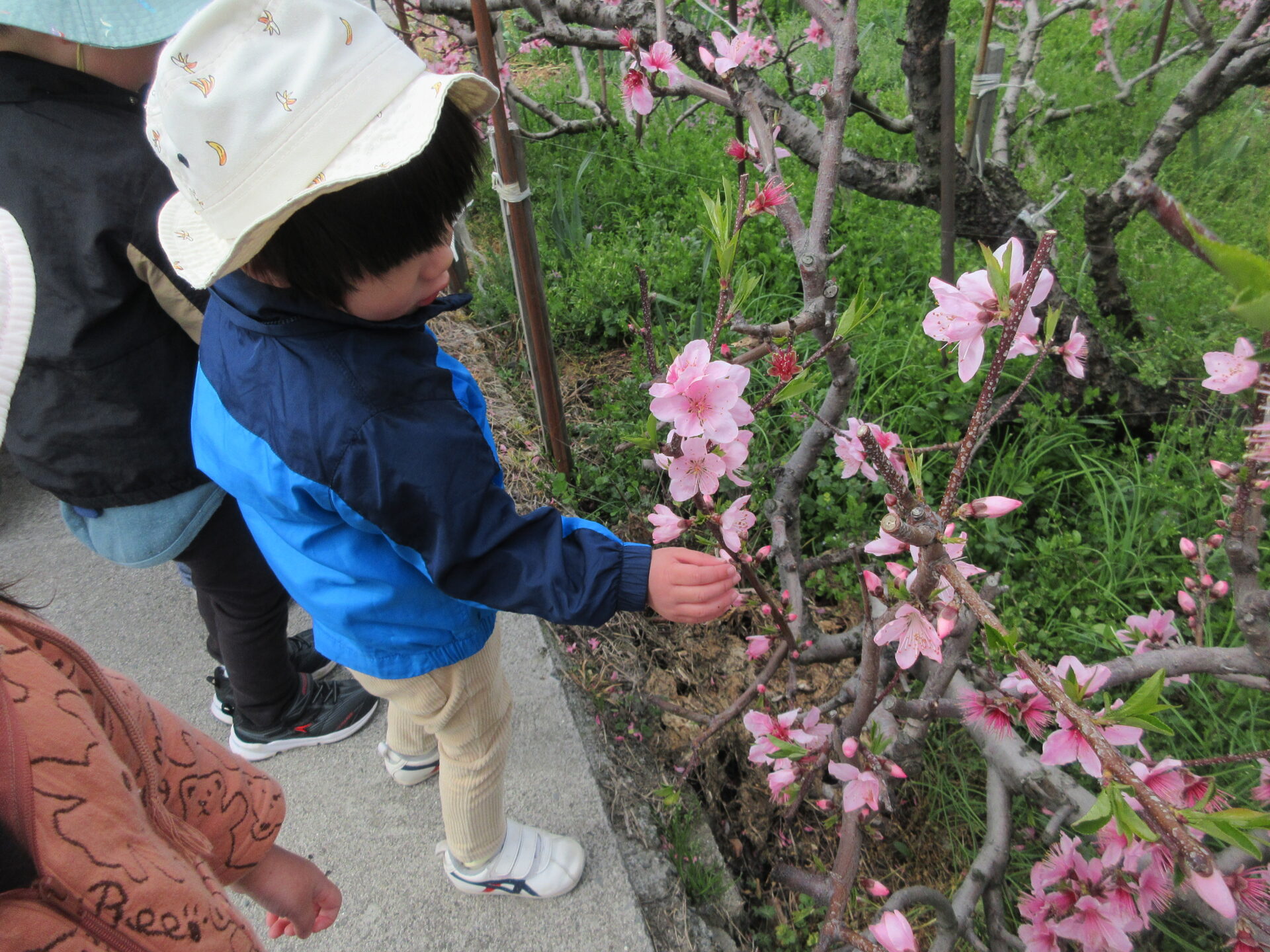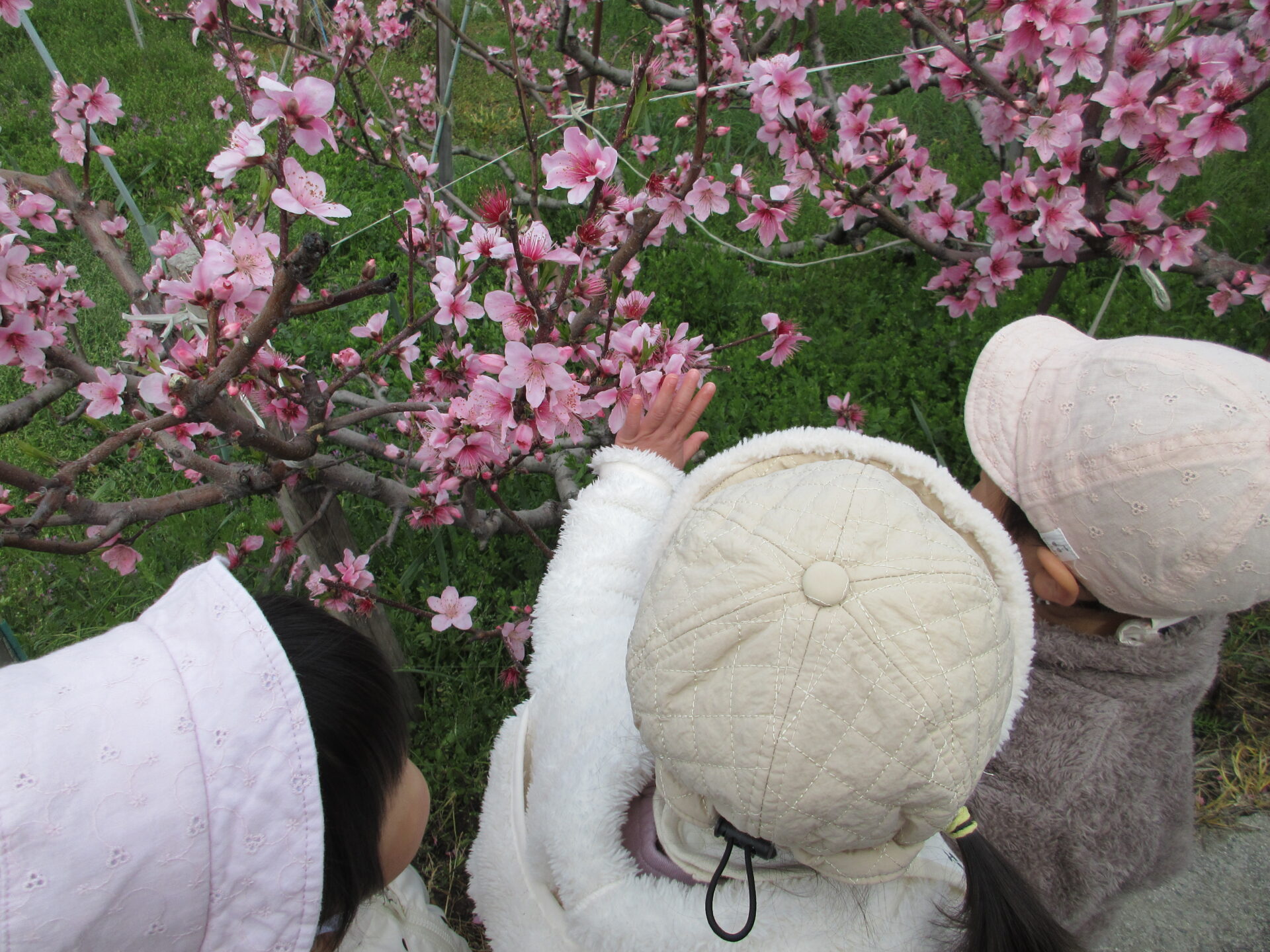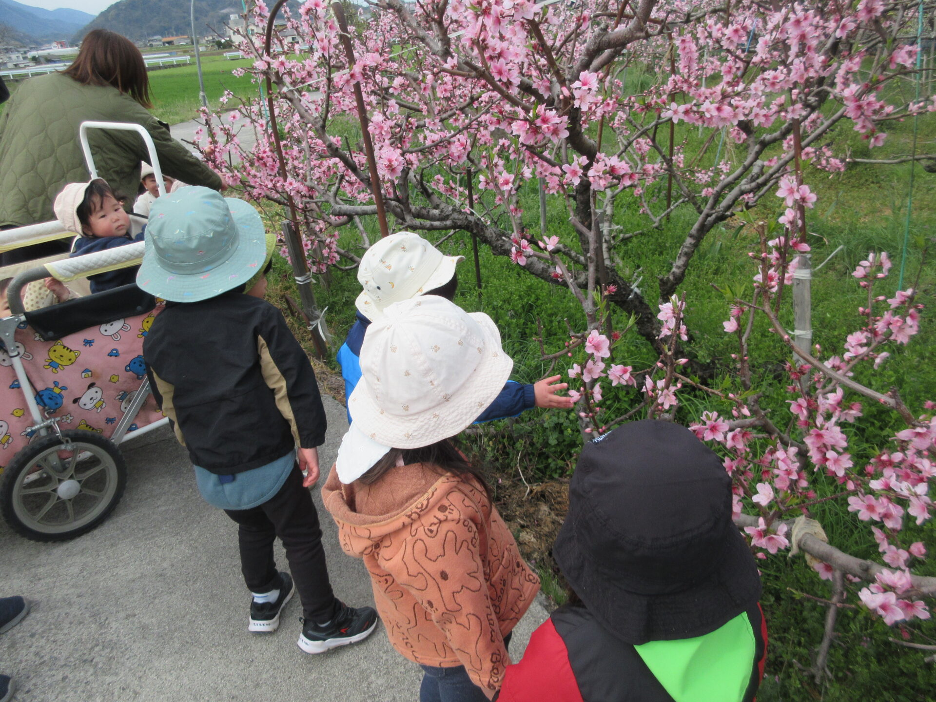 今日は、最後にみんなでお散歩に出かけました。近くの農道の桃の花が満開でした。