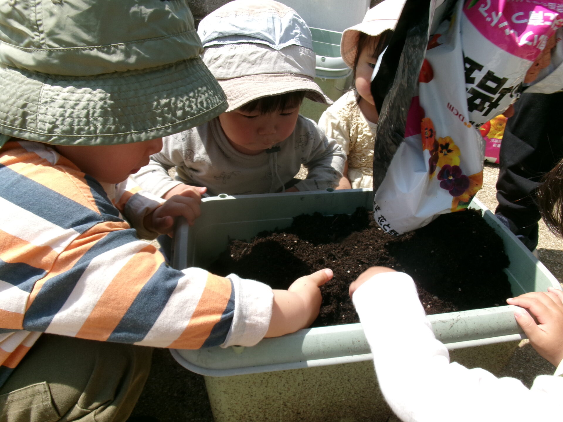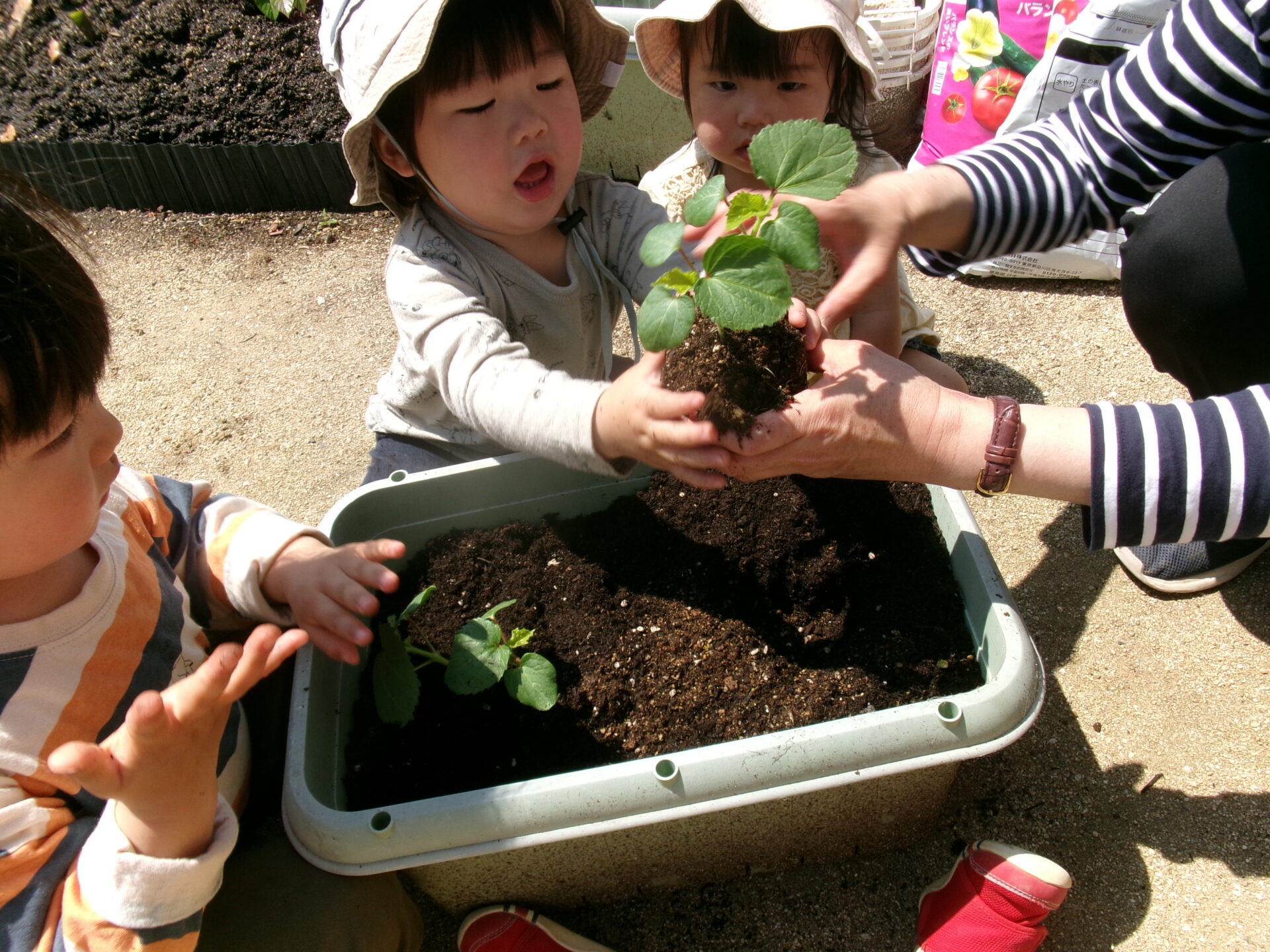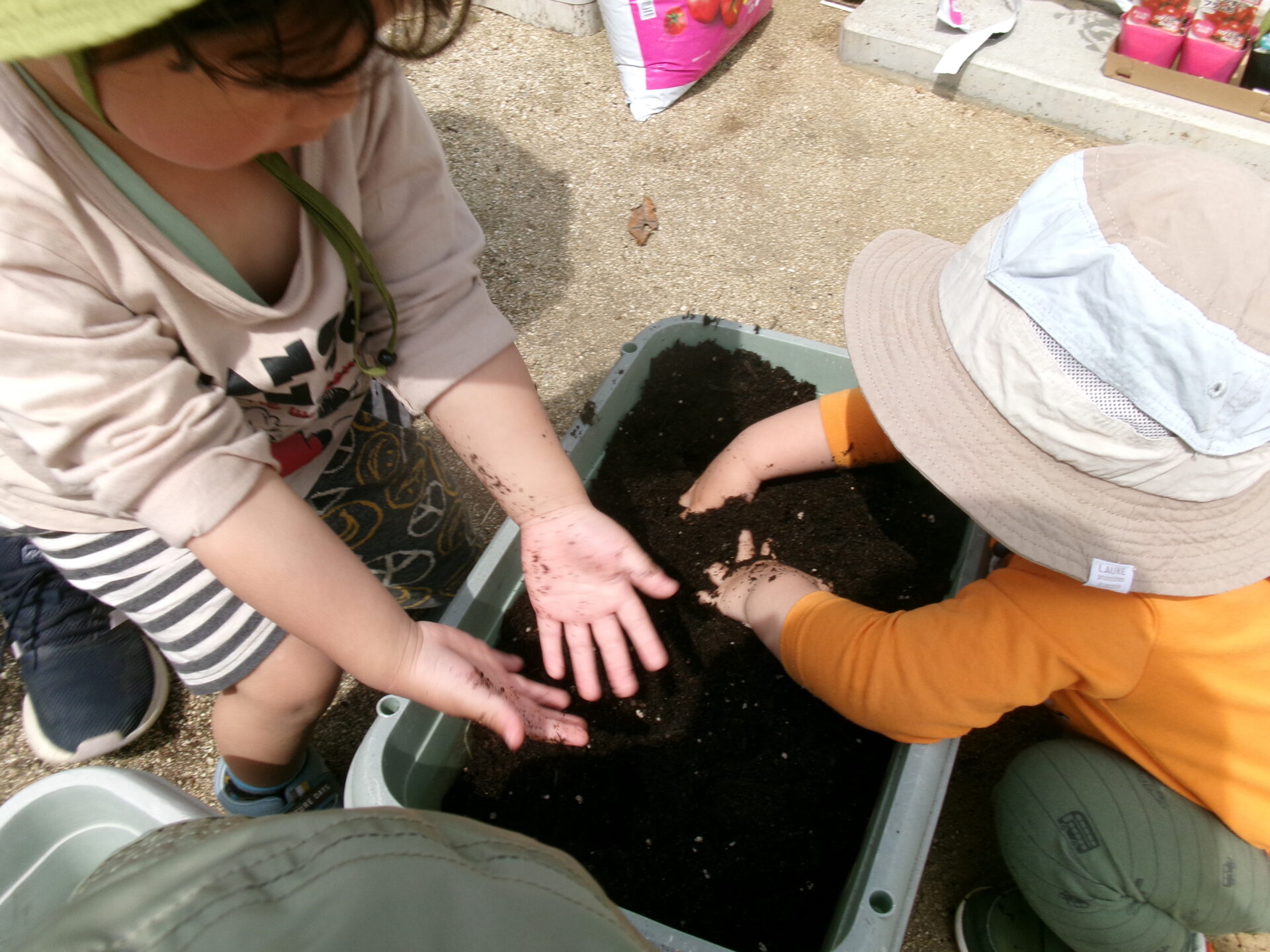 でも、手が汚れるのが嫌な子もいて、土を触りたがらない子や何度も手に付いた土を払ったりする子もいましたが、土を触る感触も味わって欲しいので、いろいろ声をかけながら無事植えることができました。