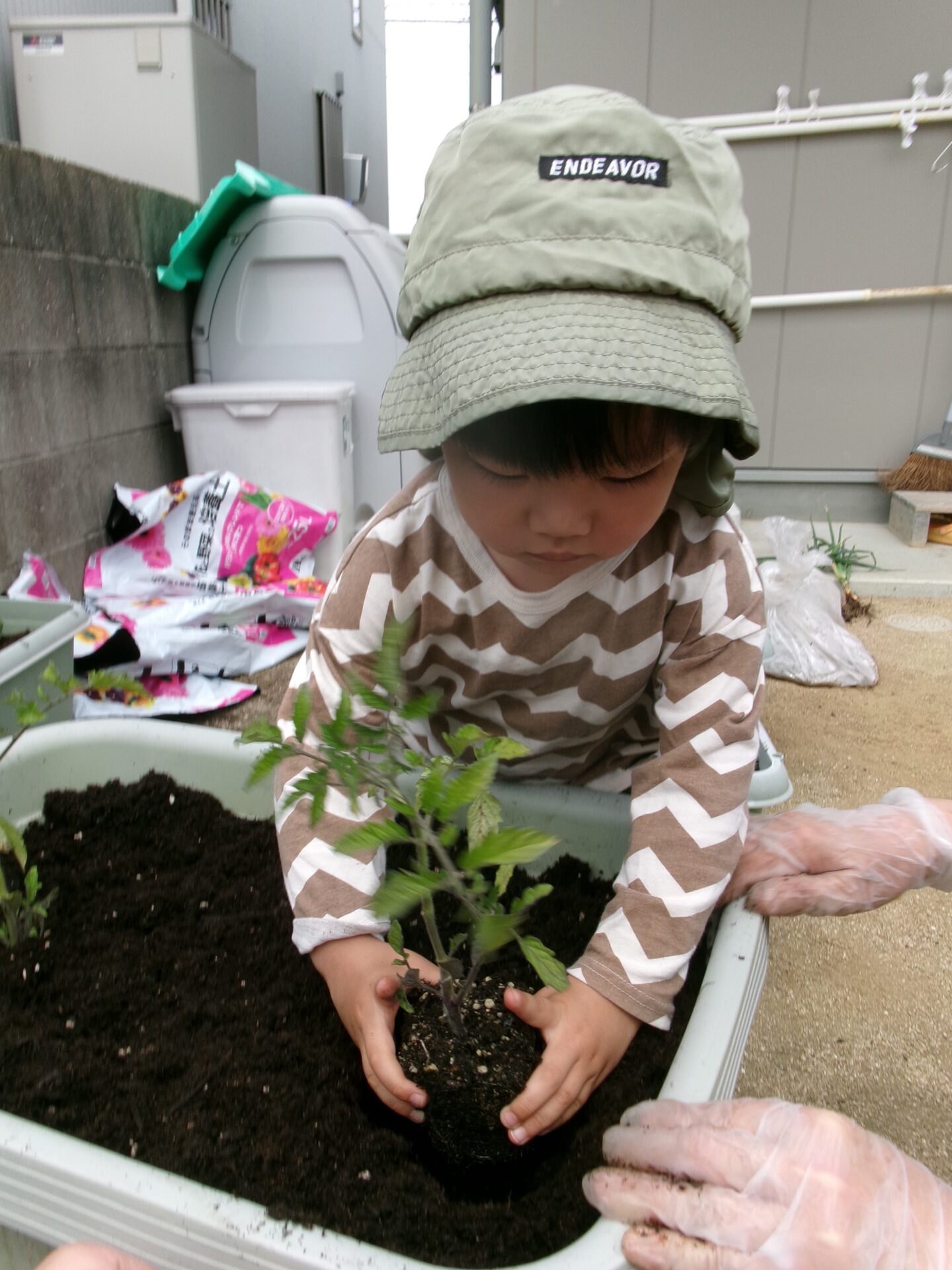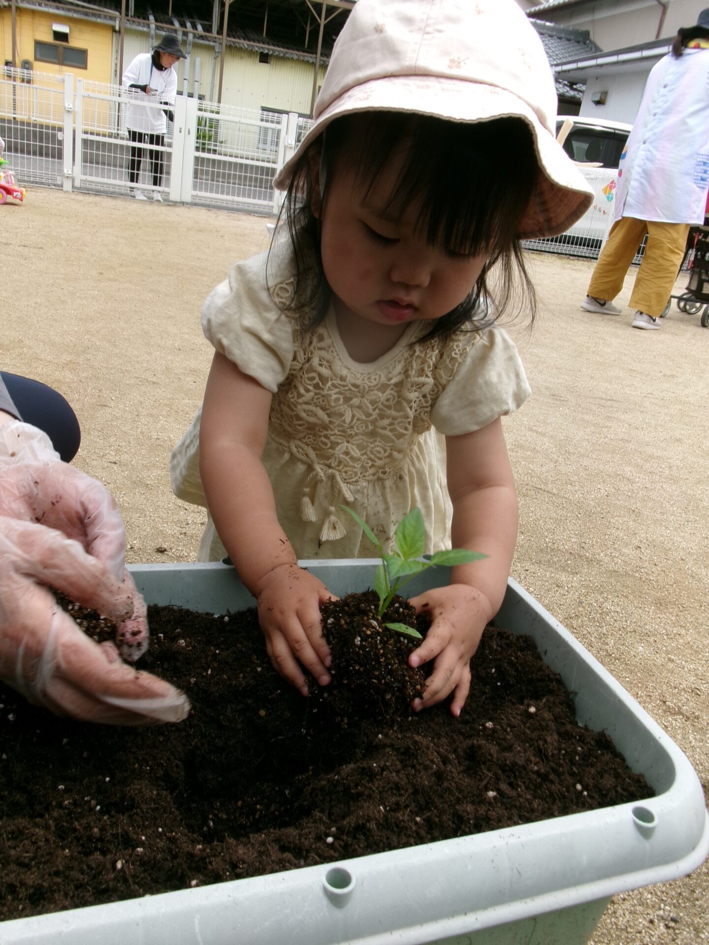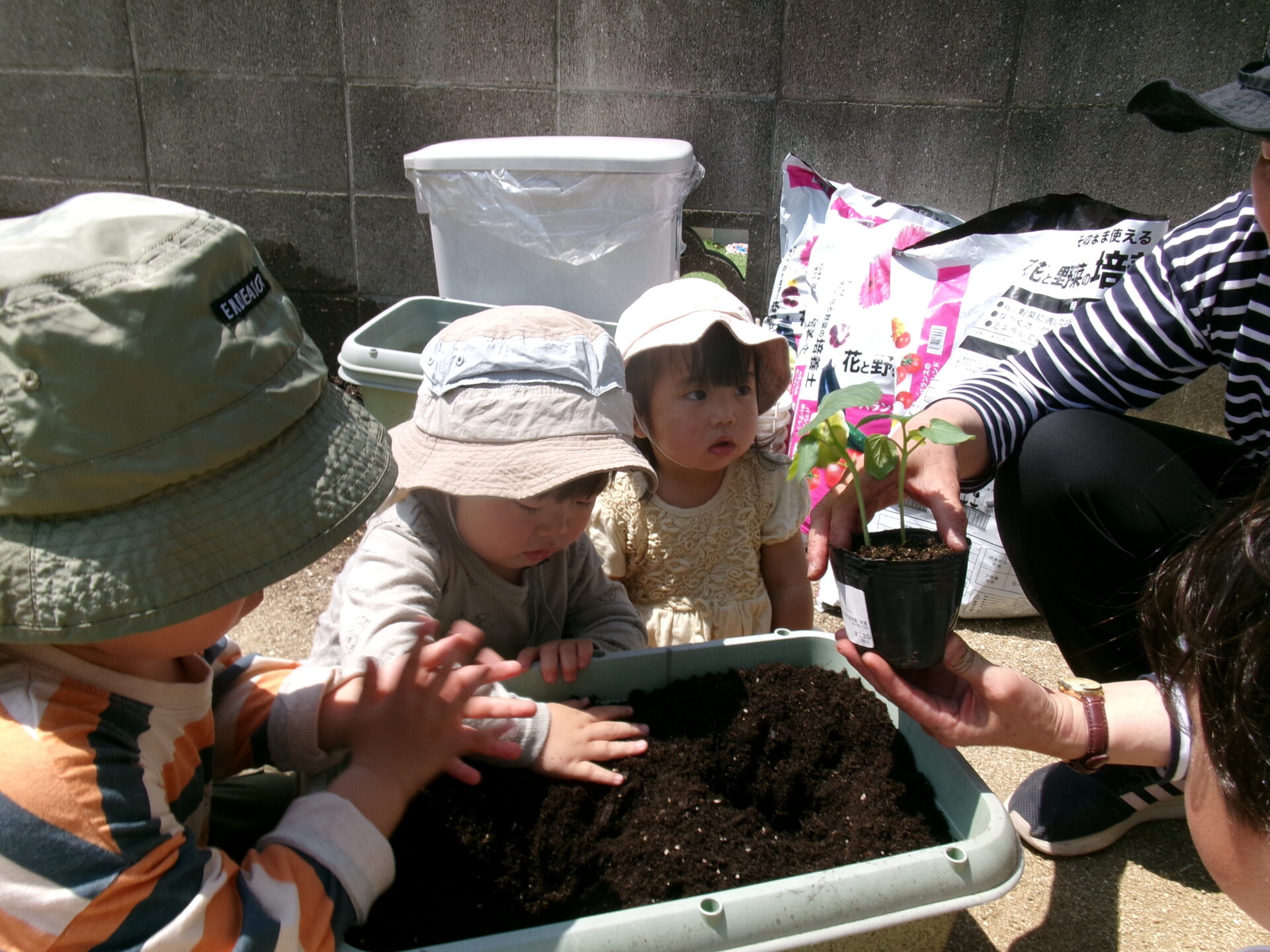 でも、手が汚れるのが嫌な子もいて、土を触りたがらない子や何度も手に付いた土を払ったりする子もいましたが、土を触る感触も味わって欲しいので、いろいろ声をかけながら無事植えることができました。