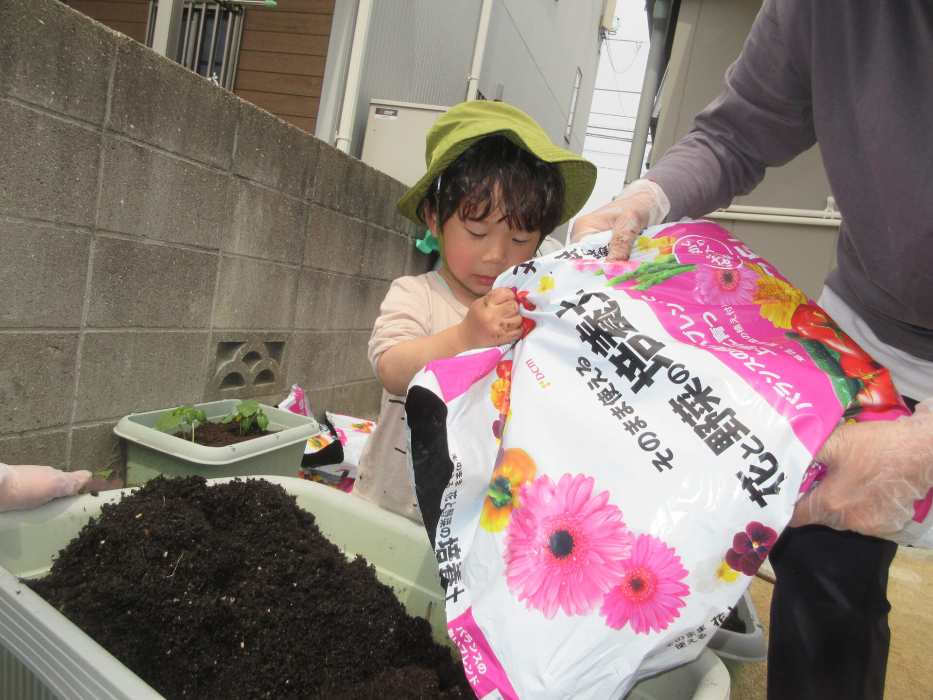 昨日も植える体験をしたので、土をプランターに入れたり土をならす作業も様になってきました。
