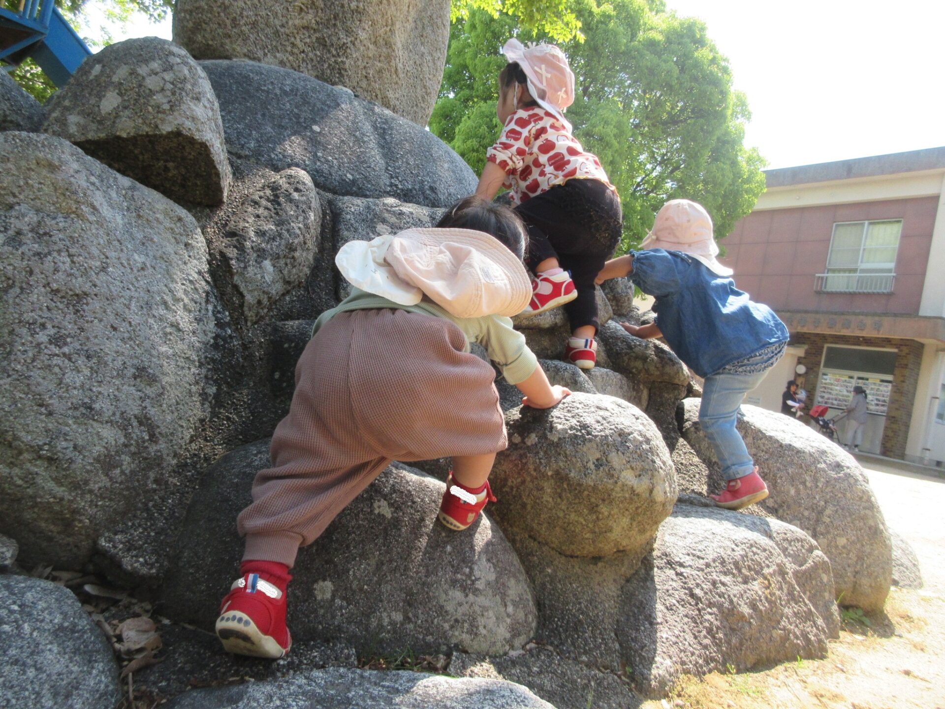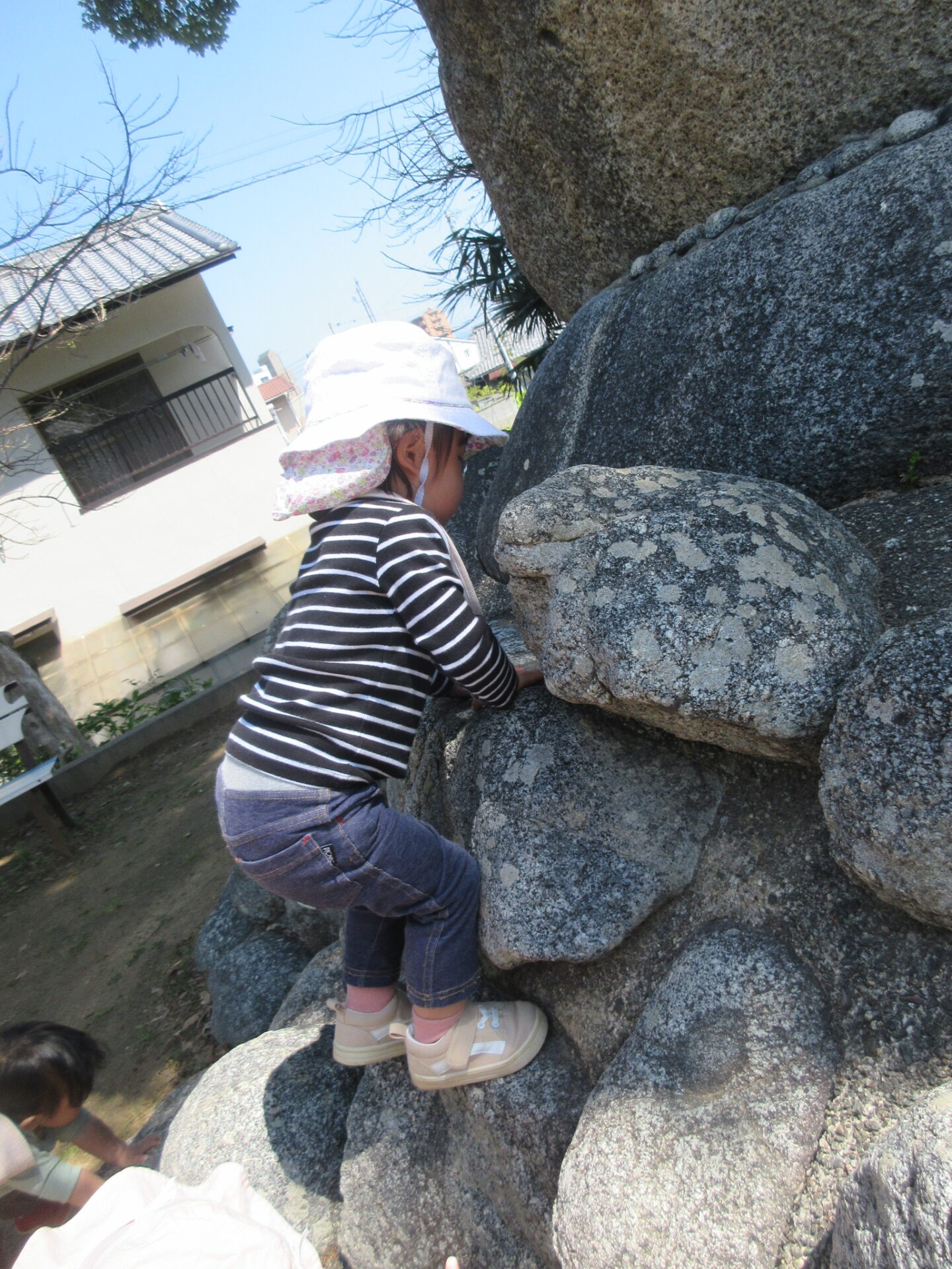 神社の中には、滑り台やジャングルジム、石垣などもあり、体をたくさん動かして遊びました。