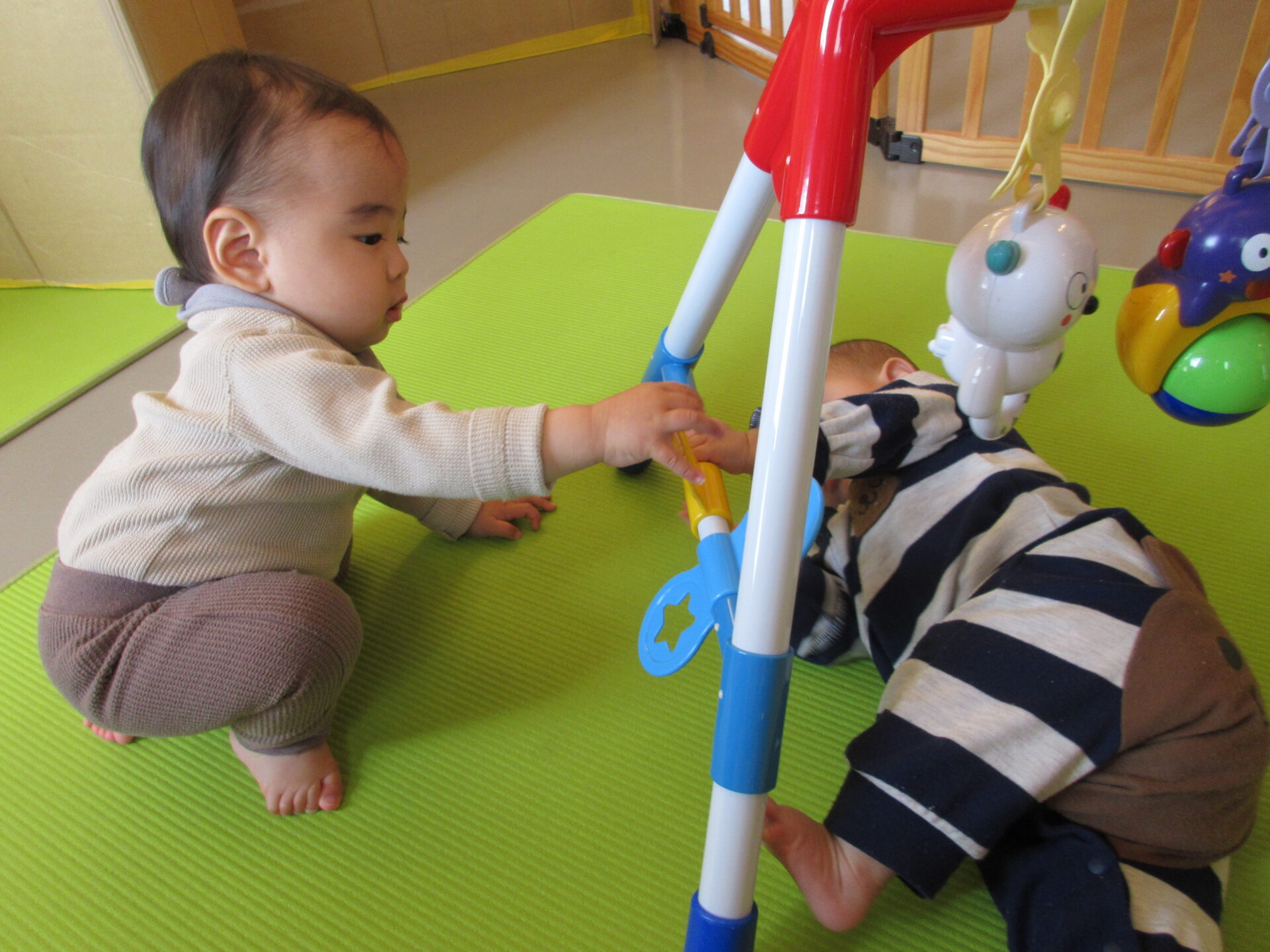 手をにぎって、「がんばれー」「もうちょっと」と、寝返りの応援をしています。