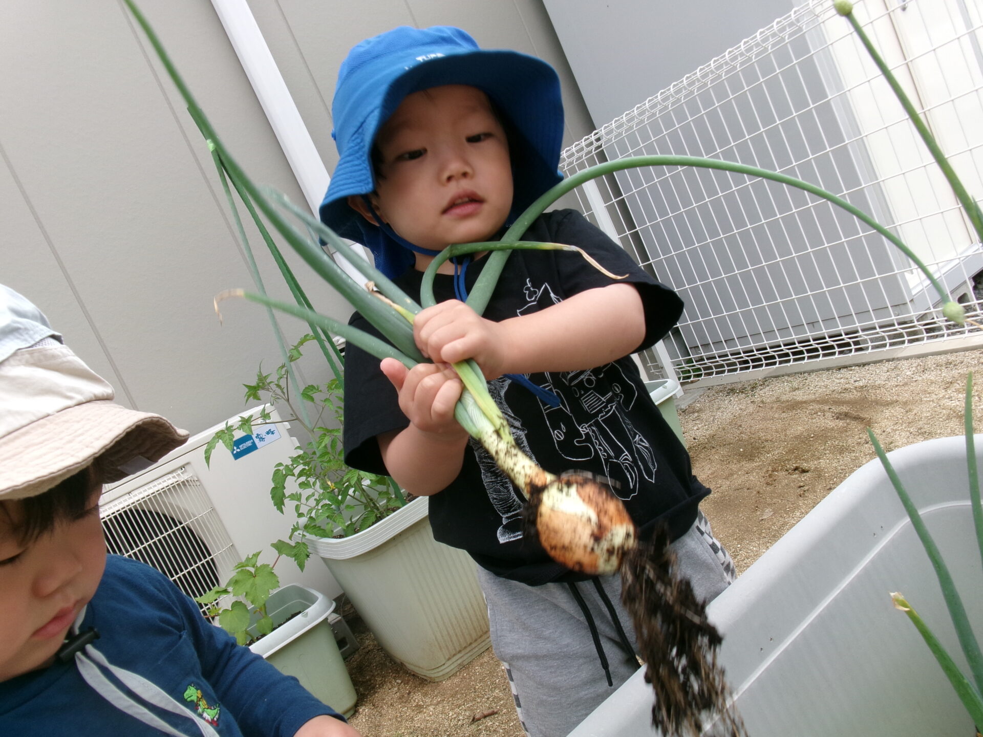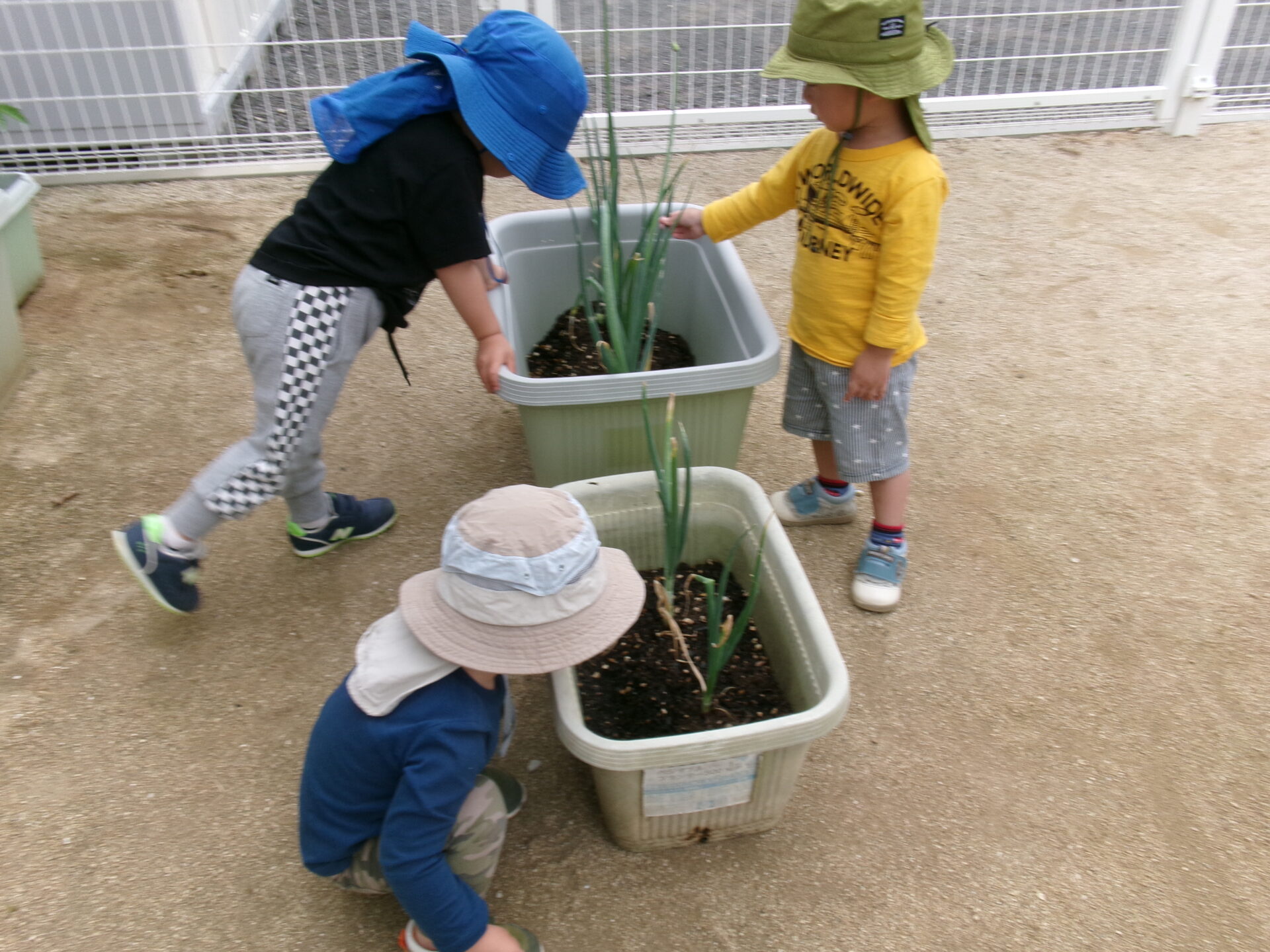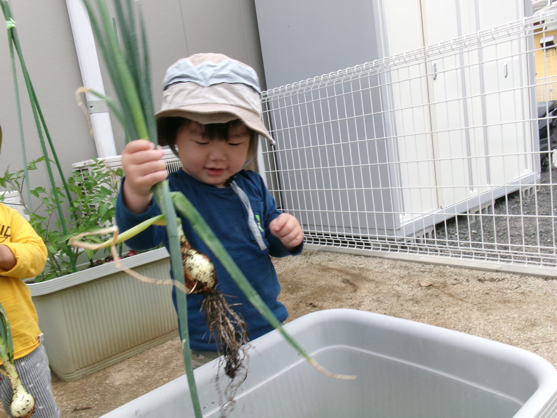 子どもたちにとって、「玉ねぎができているよ…」と話していても、土の中でどんなものができているのかピンときていないようでした。