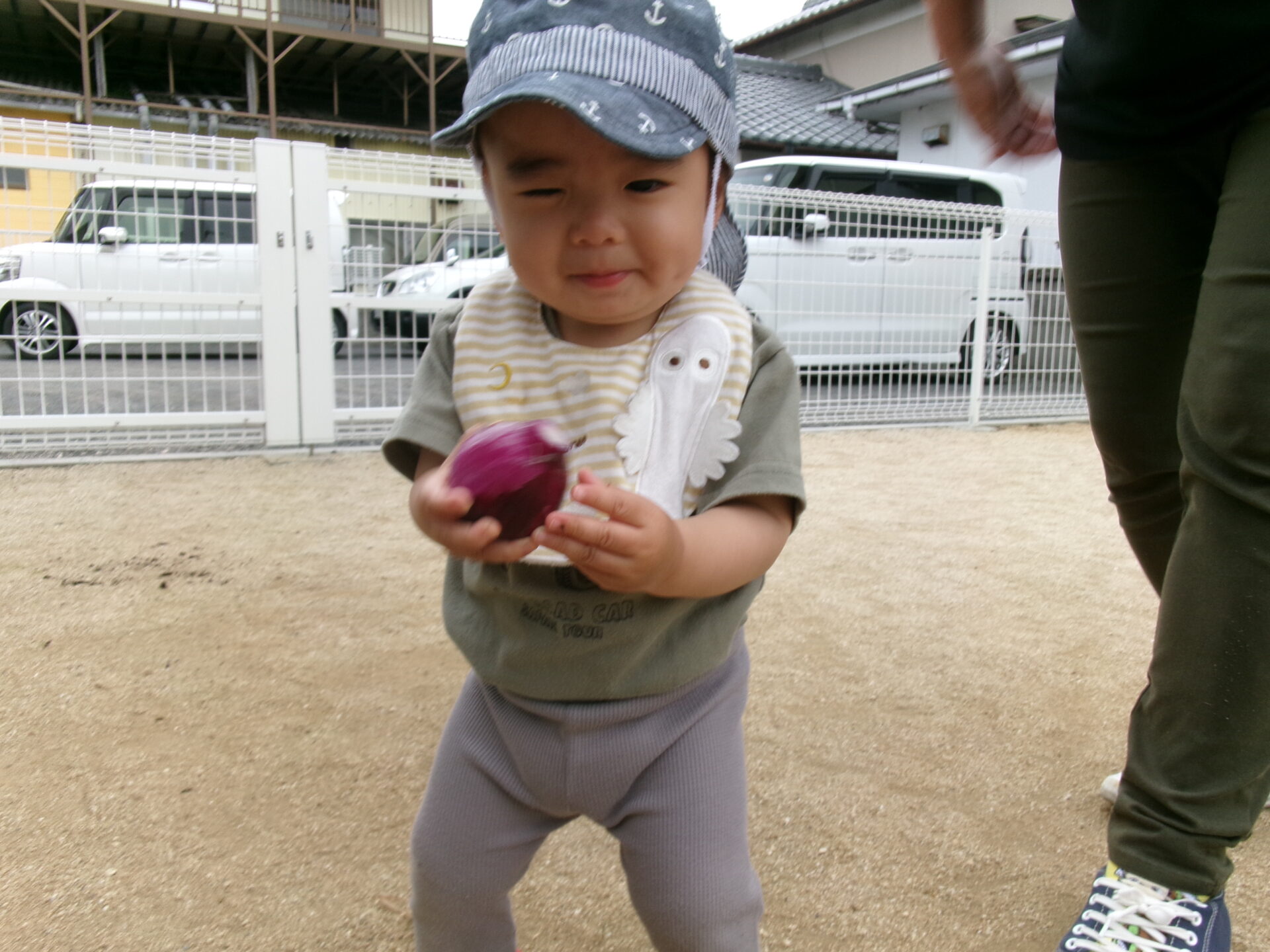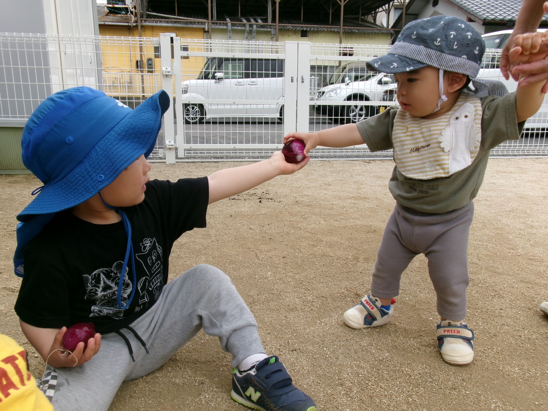 きれいになった玉ねぎを、近くにいた0歳児のお友だちに手渡して見せてあげました。
