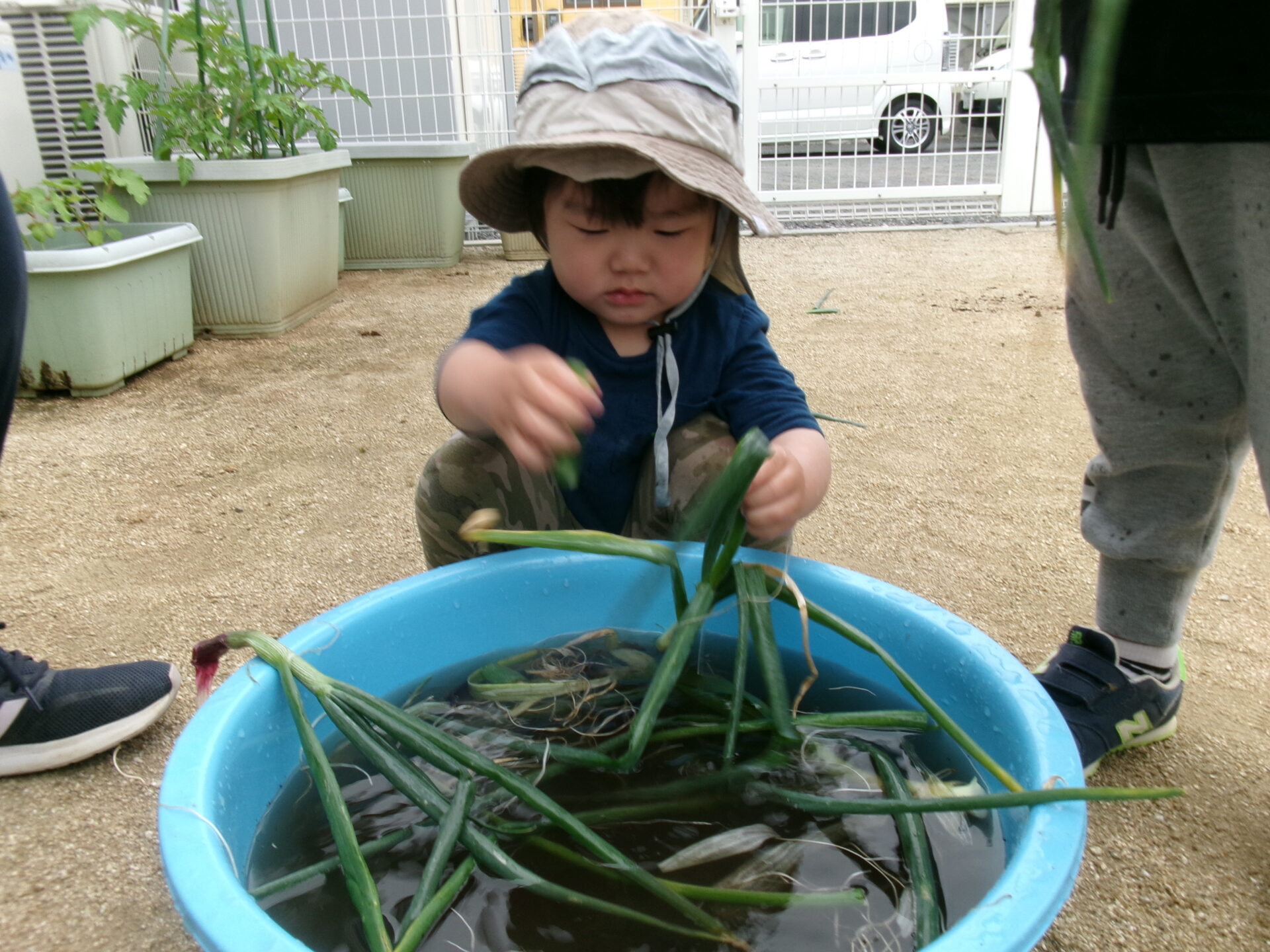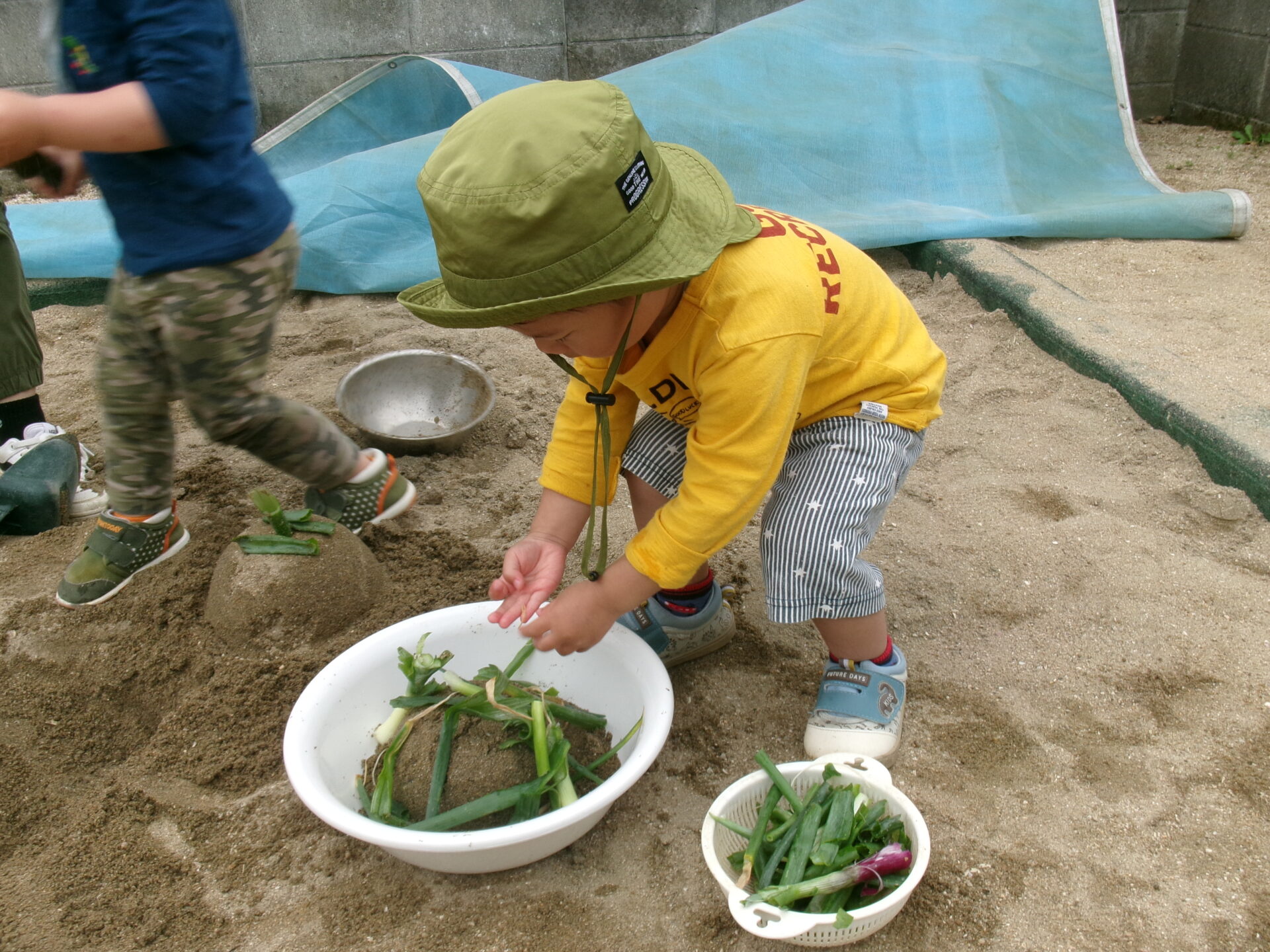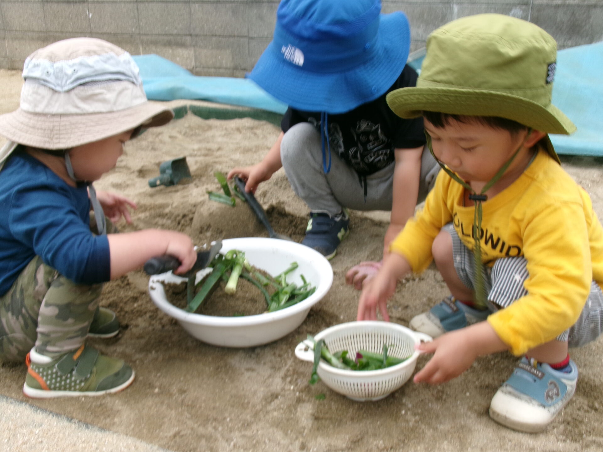「うんとこしょ!!で抜いてみるよ」「どんなのが出てくるかなぁ?」と根元をしっかり持って、一人ずつ抜いてみました。