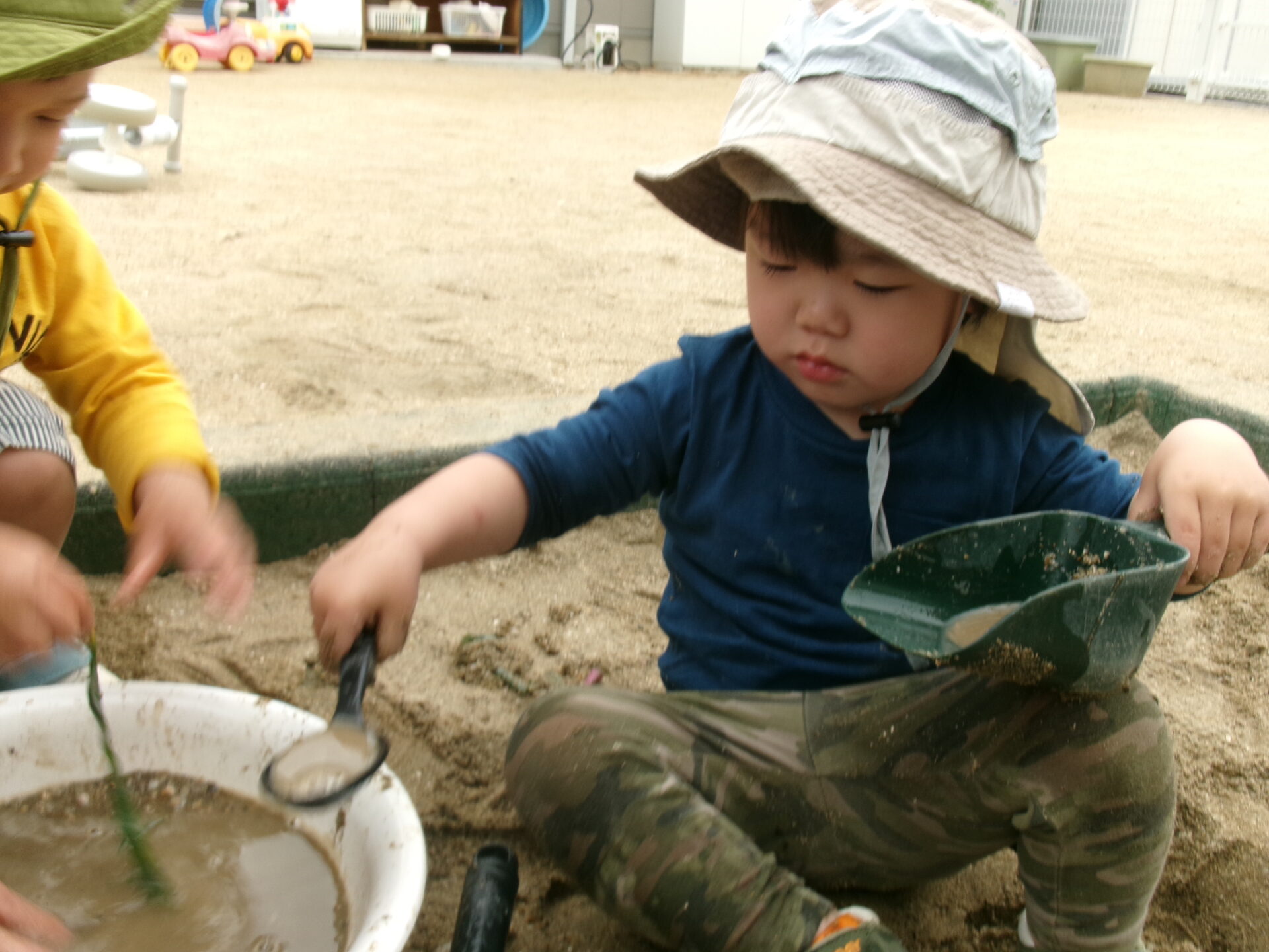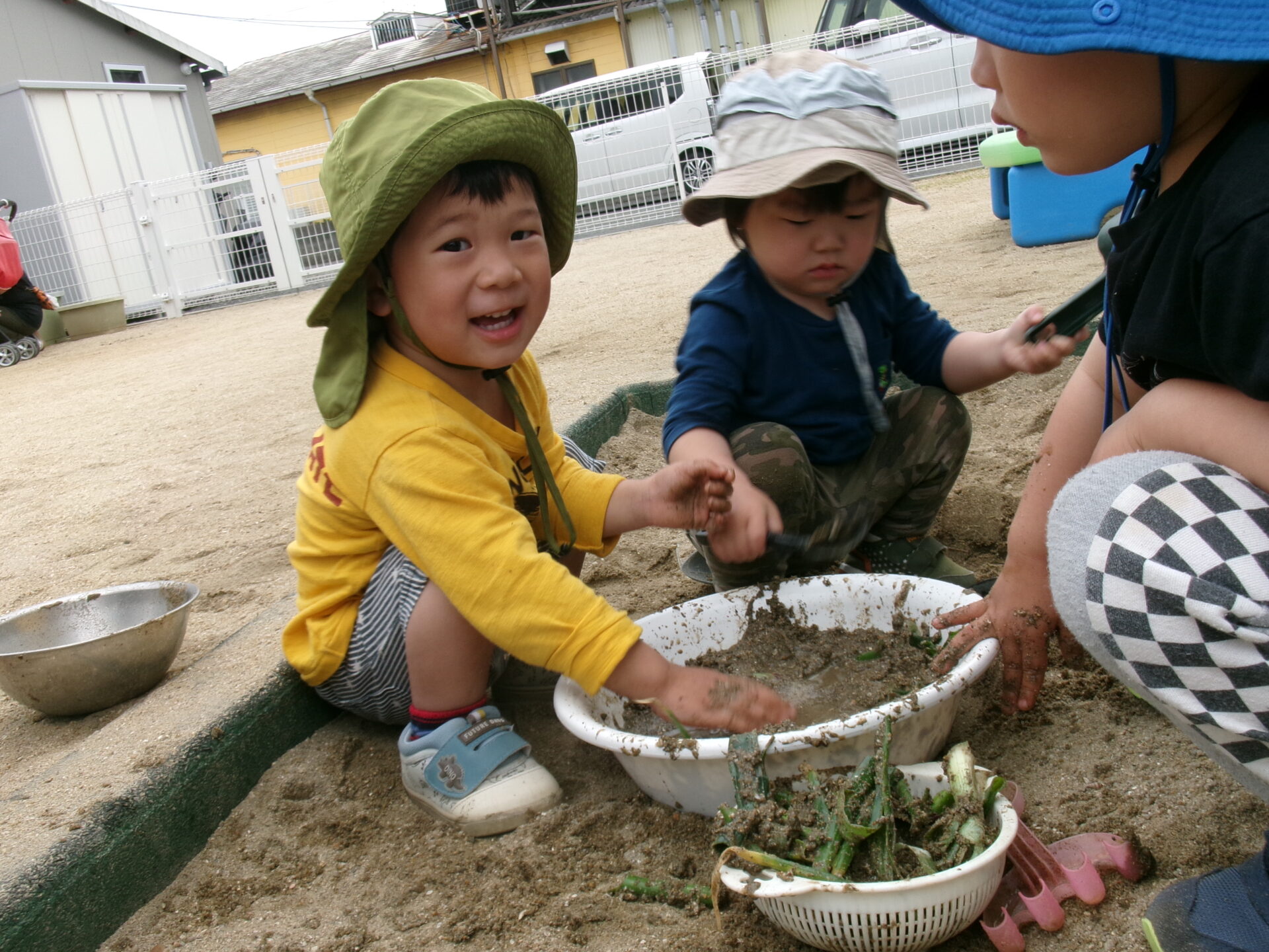 初めは感触が嫌で手を引っ込めていた子もだんだんと楽しくなり、みんなでコネコネと泥遊びに発展してきました。