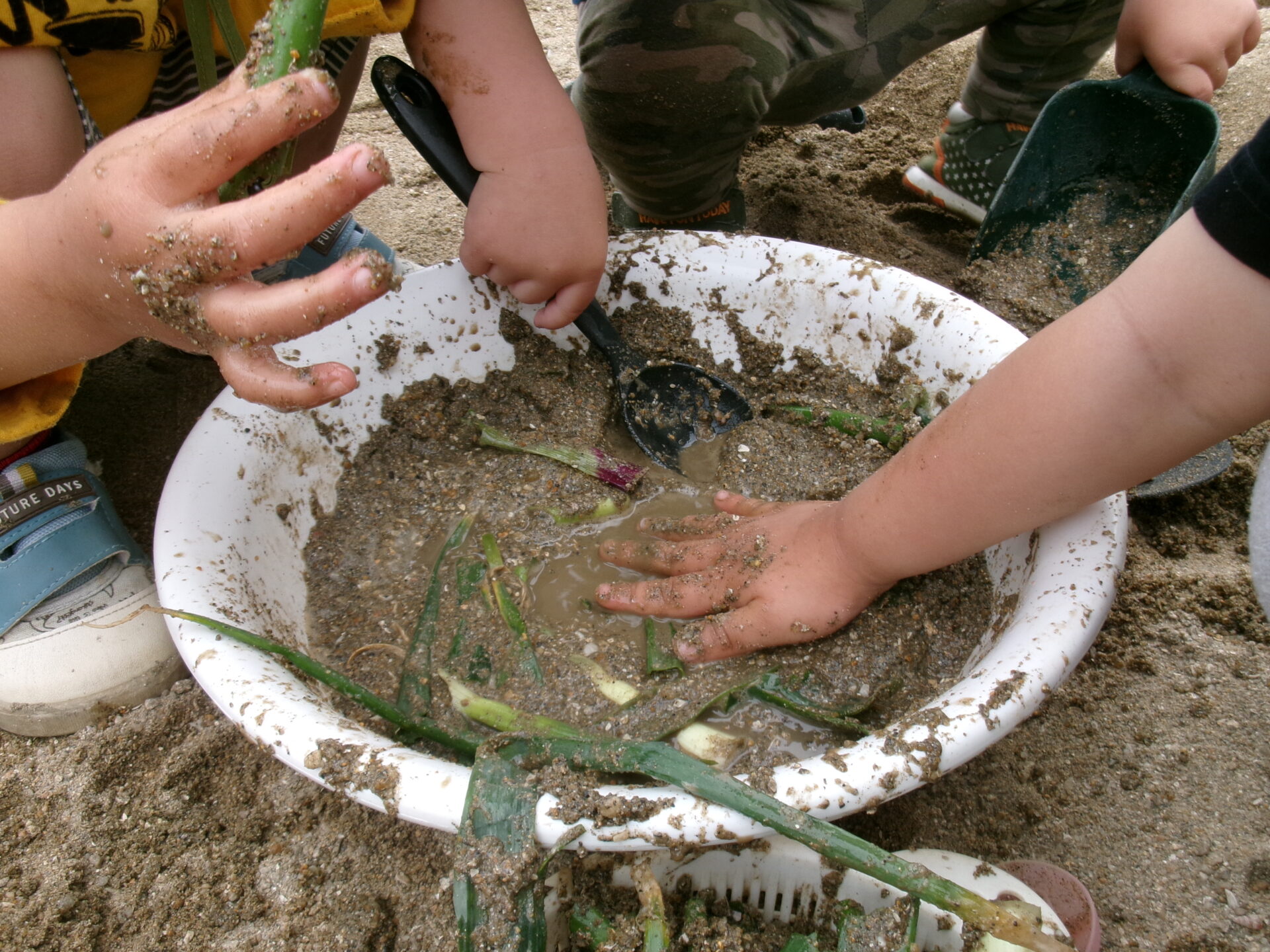 ケーキにしたり、ボウルに砂と水を入れて混ぜてみたり…