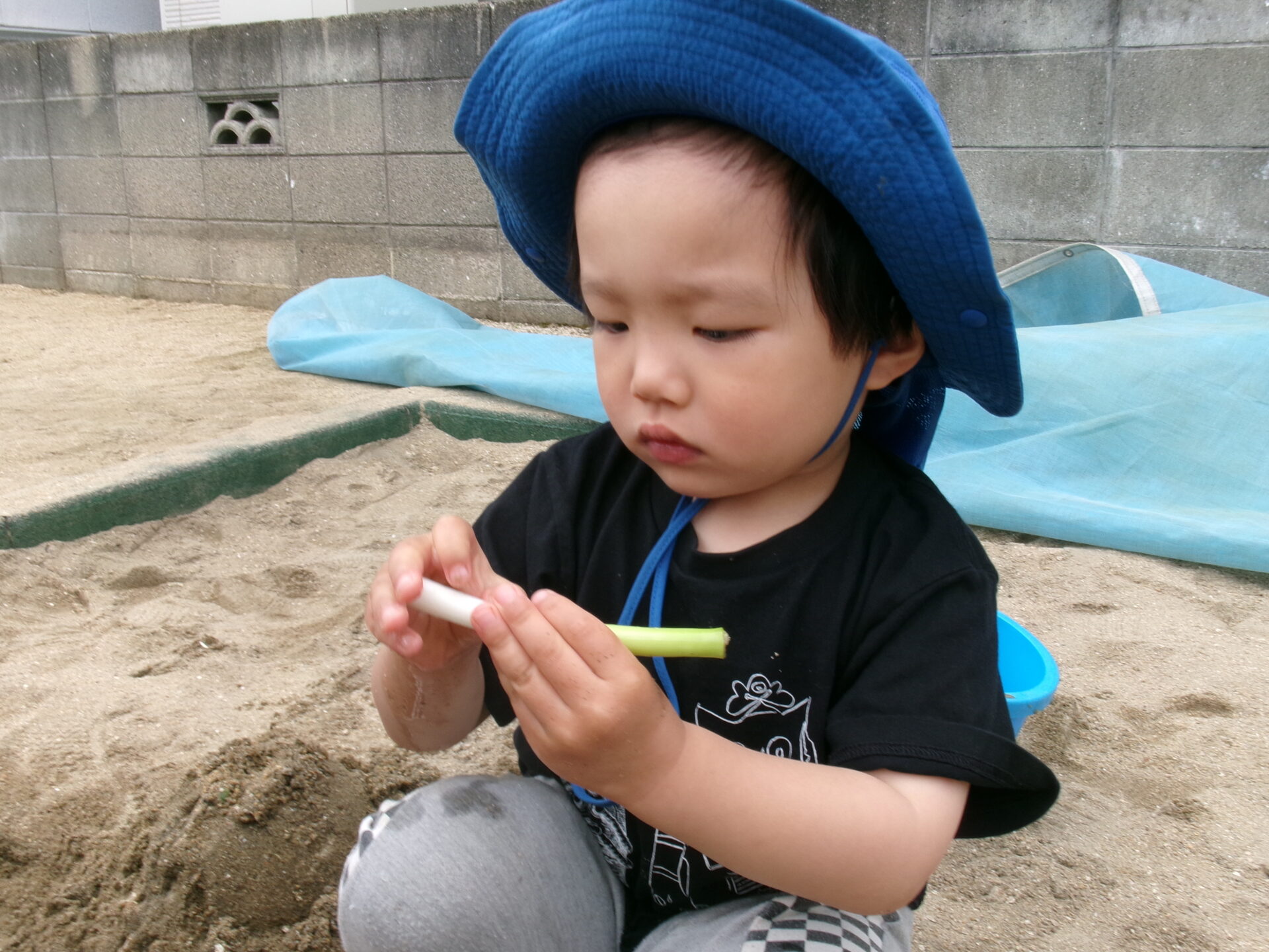 緑の葉っぱの部分を折ってみると、パキッパキッと音がするので、小さく折って砂場でままごとに使うことにしました。