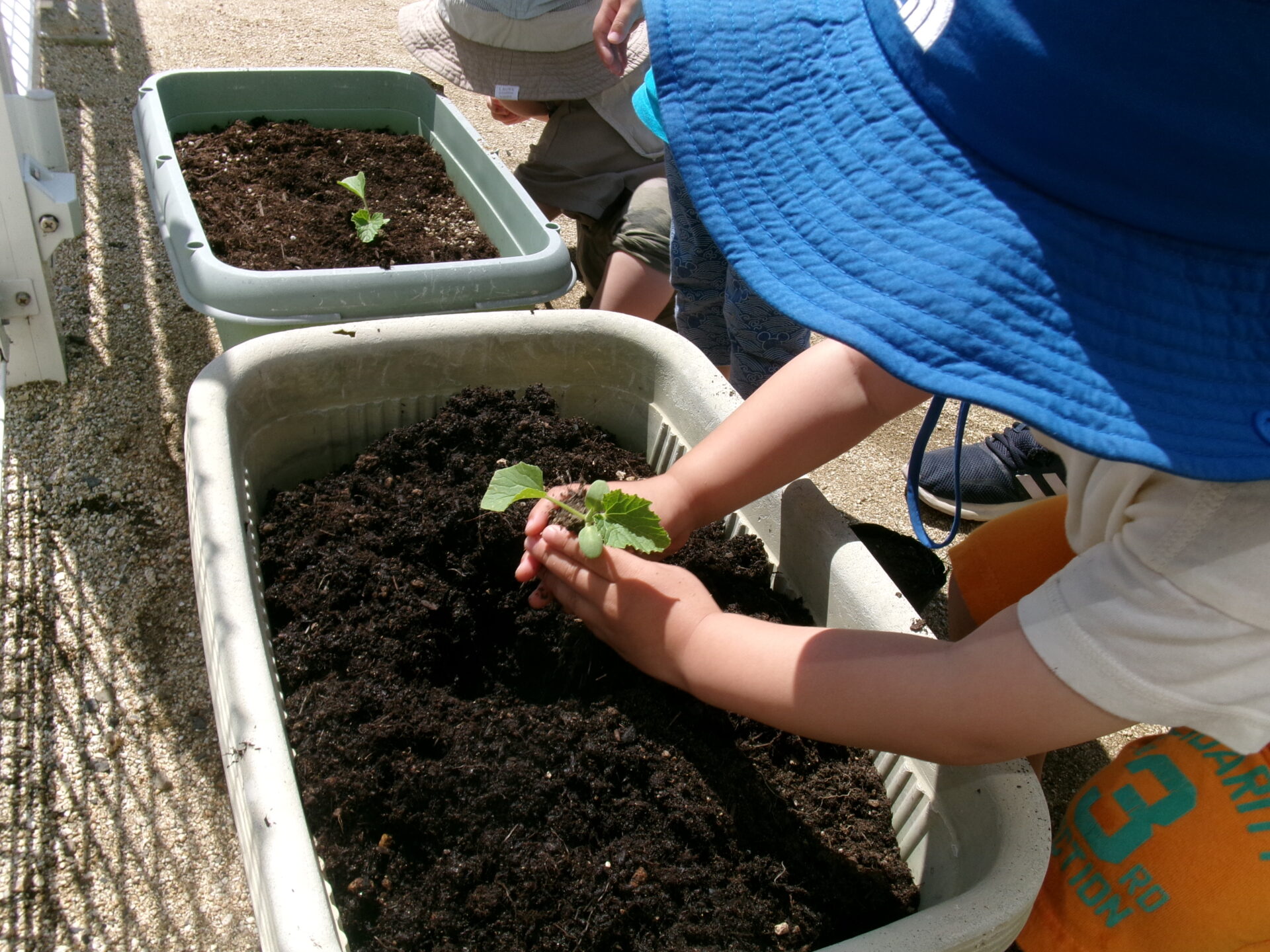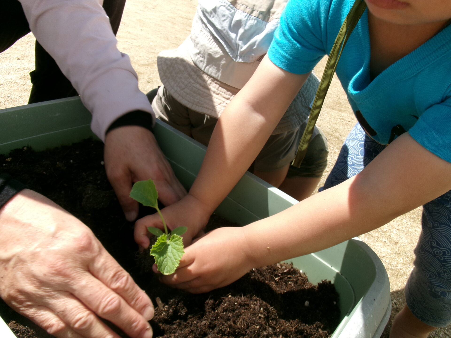 小さな苗を、大事そうにそっと土の中に置いて、優しく土を被せました。